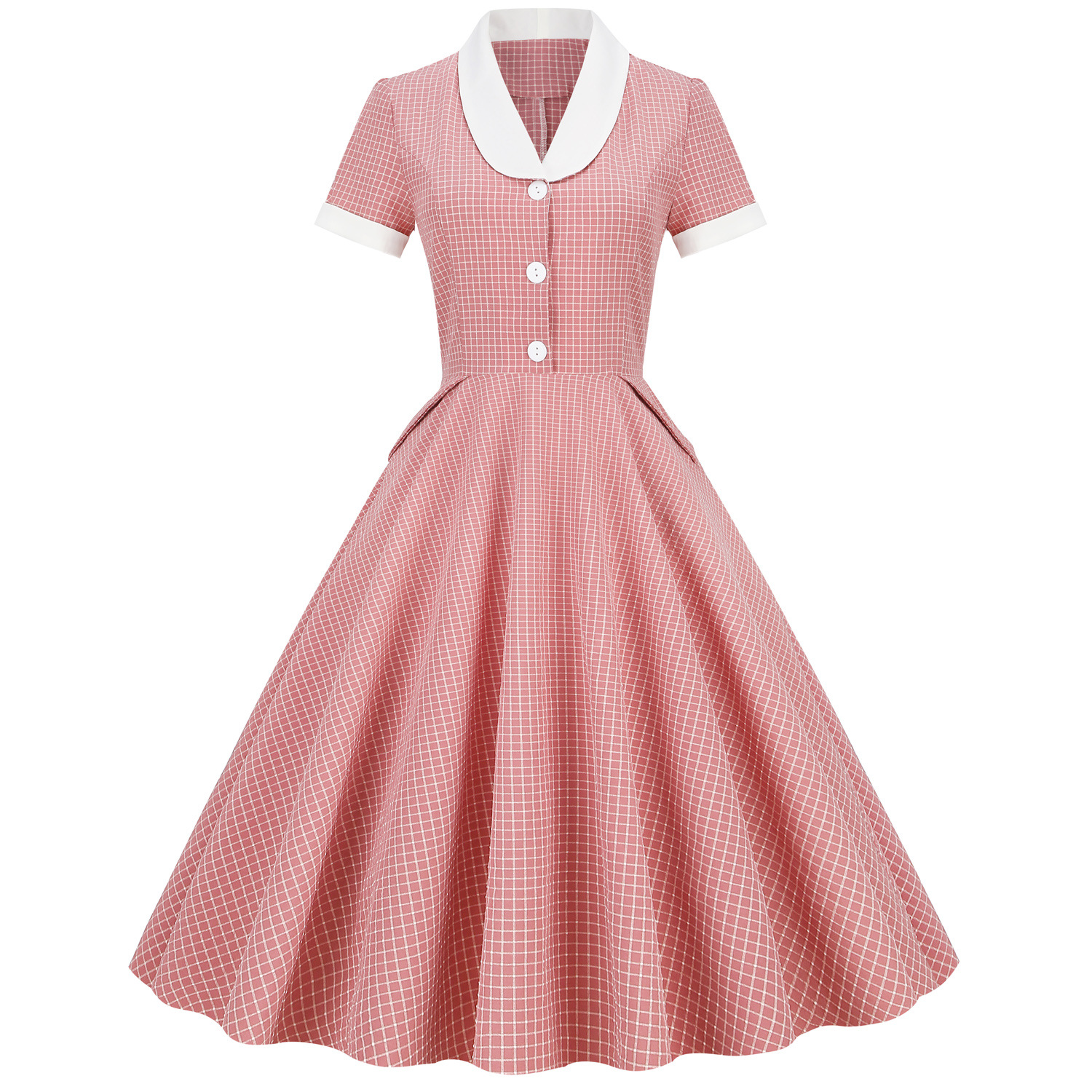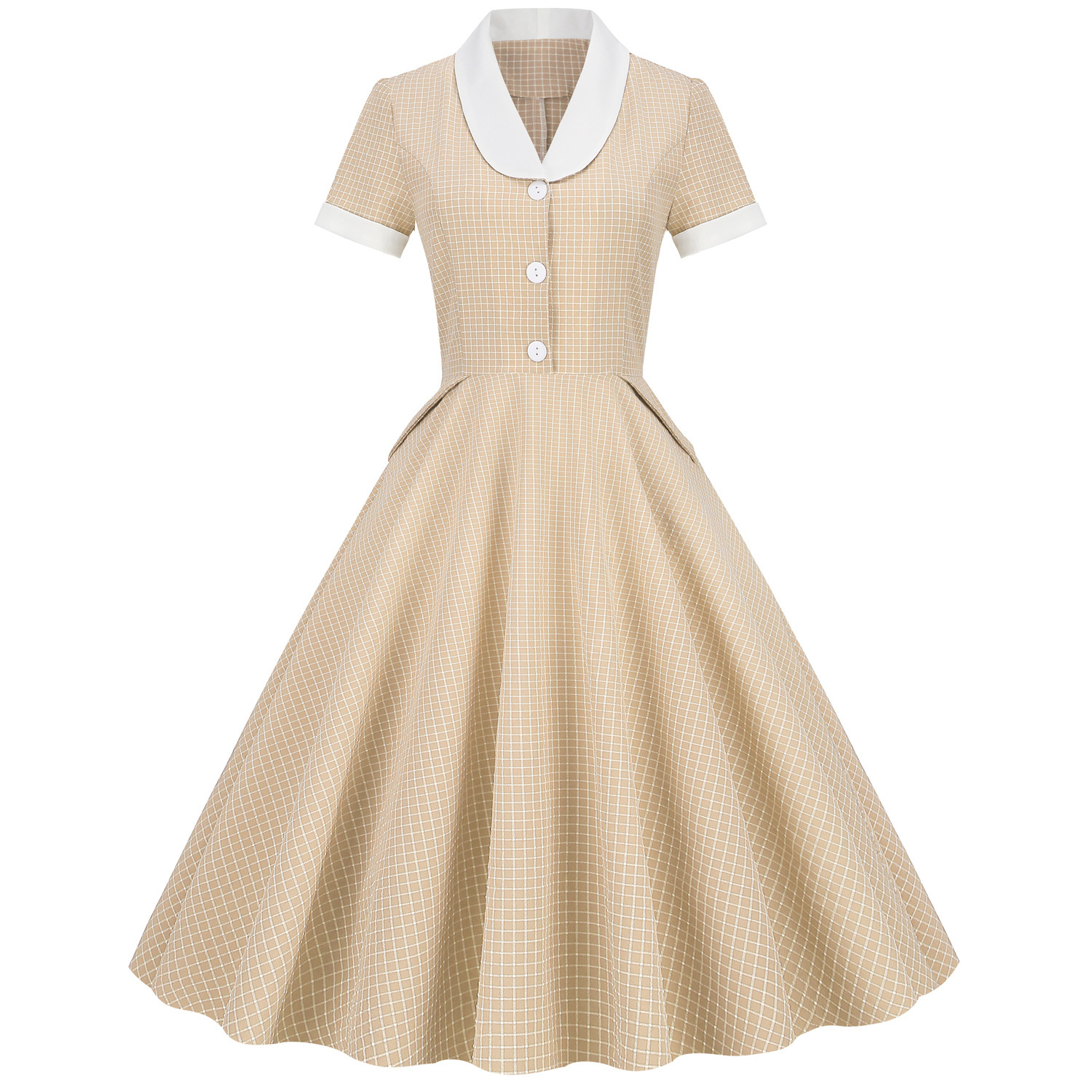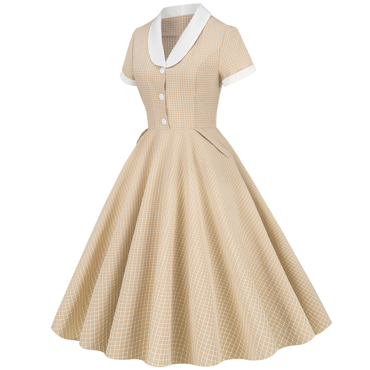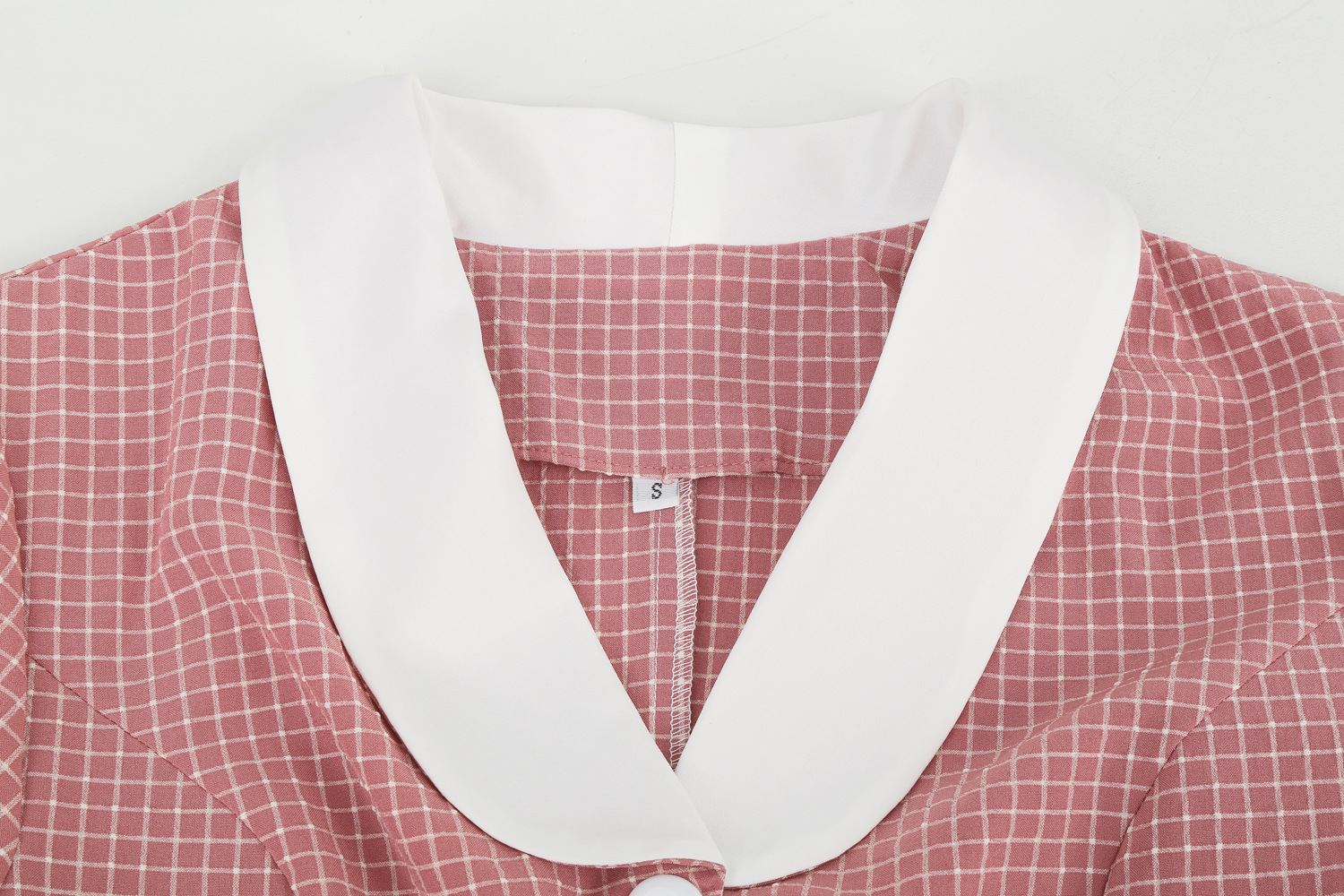 标题:レトロなチェックスカート宮廷収納ウエストライトドレスぶつかり色襟年会演出服大振りミディアムワンピース