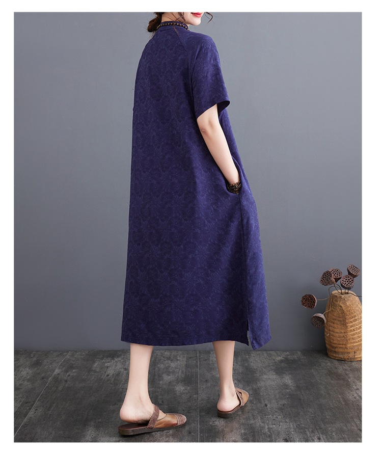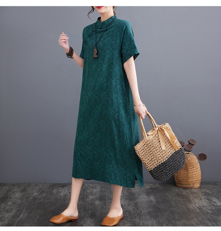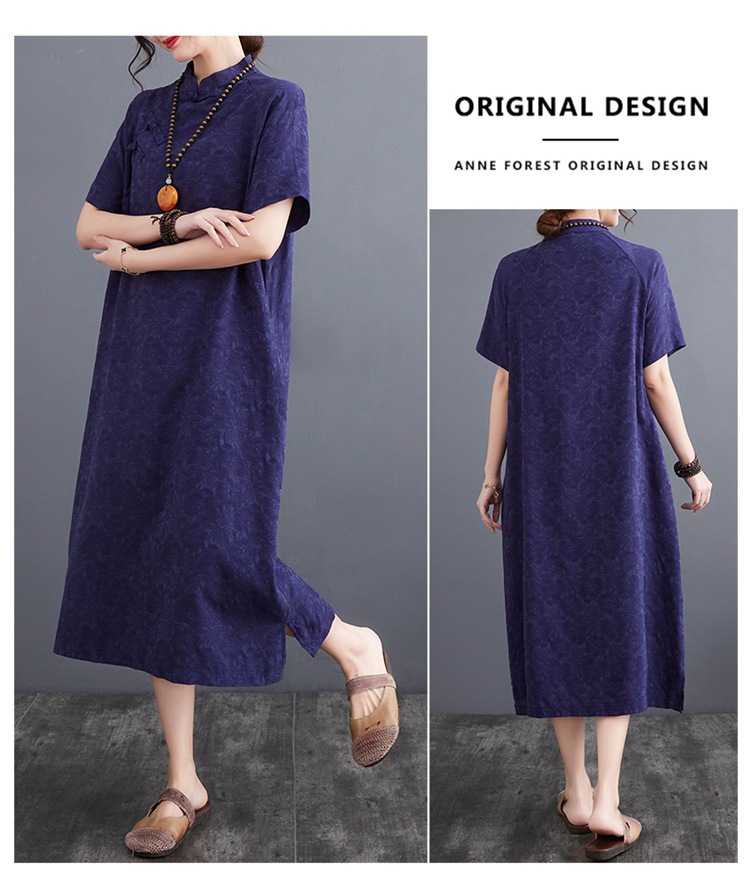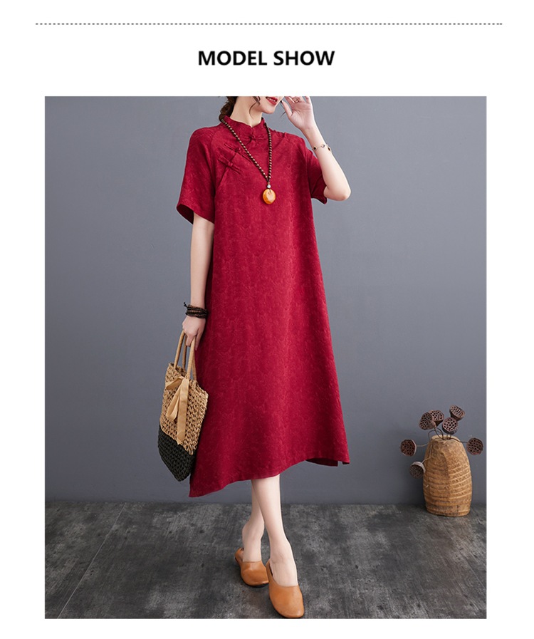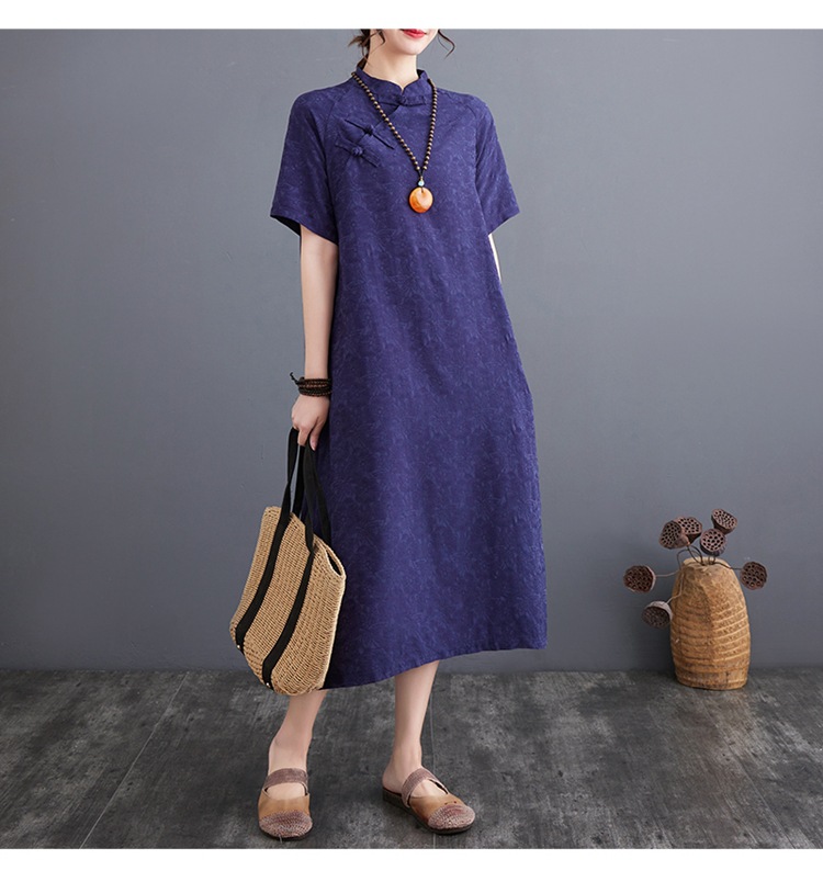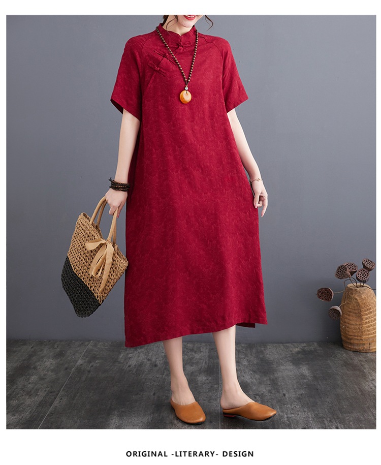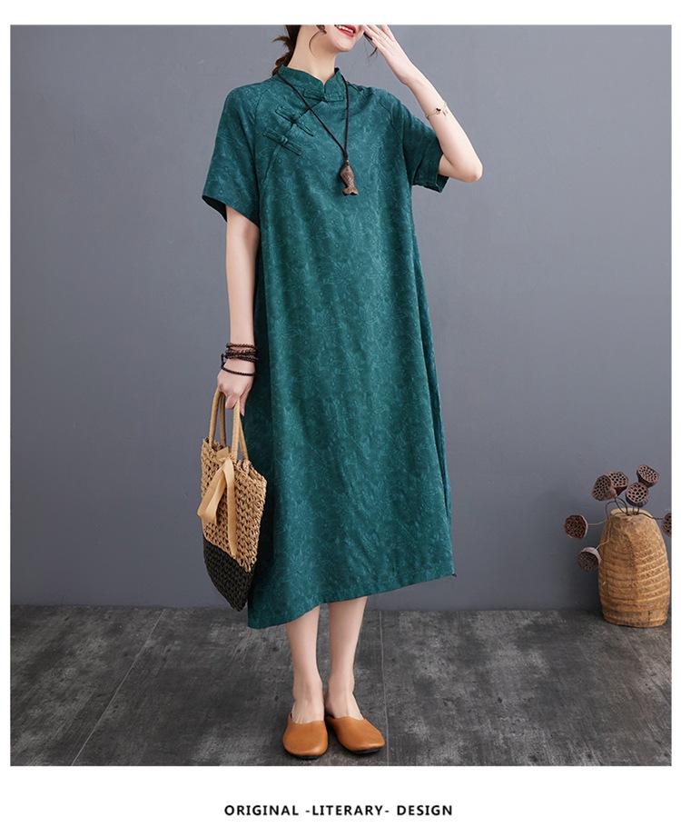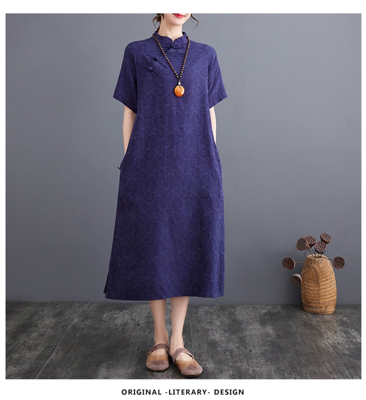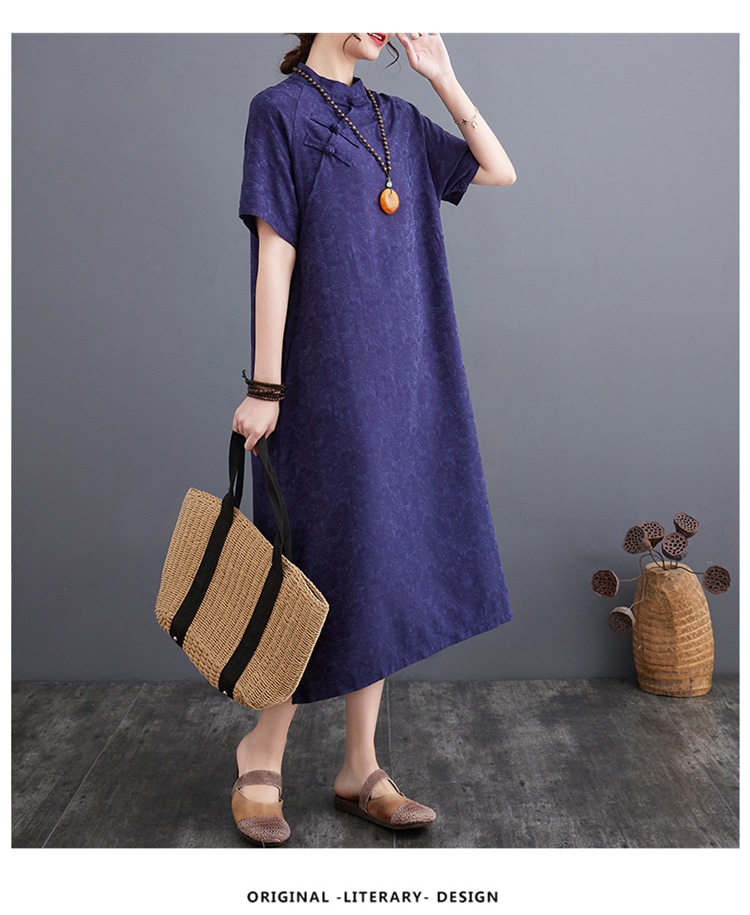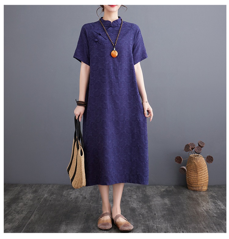 标题:婦人服ファッションビッグサイズゆったりジャカード半袖ワンピースレトロ禅リネンガウン