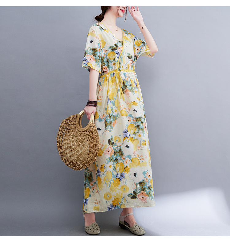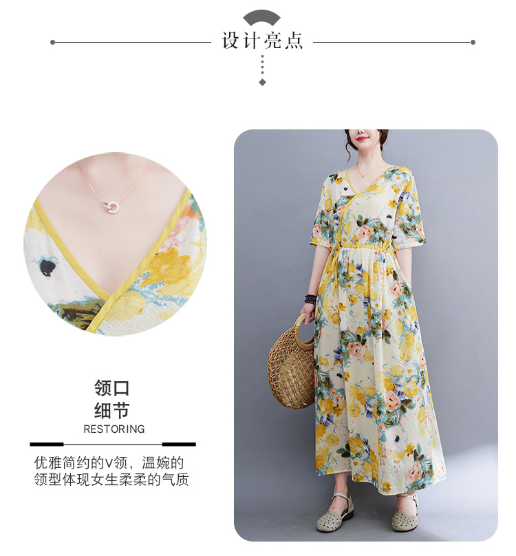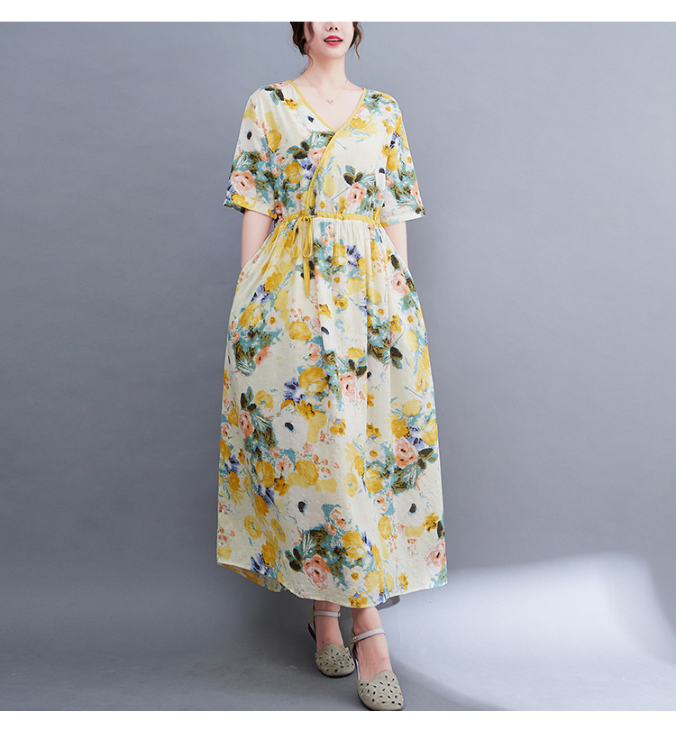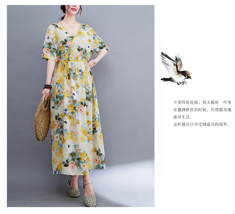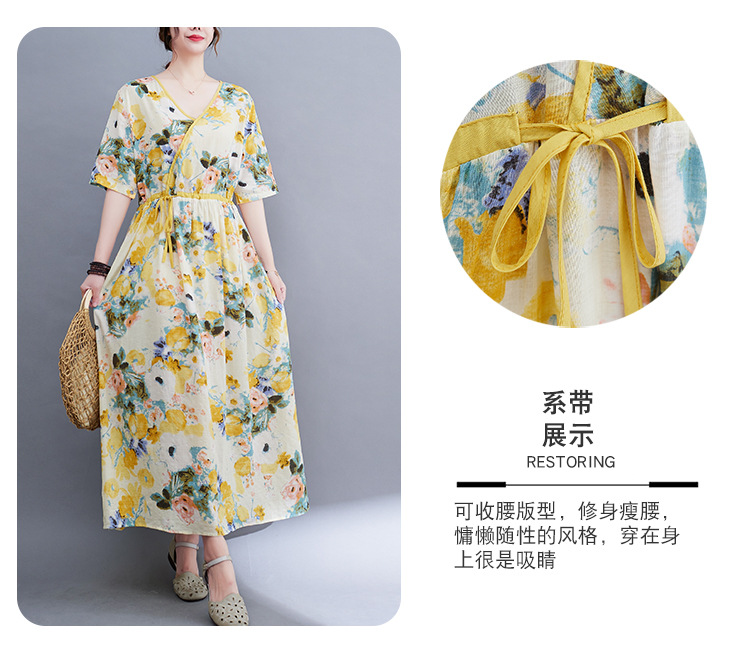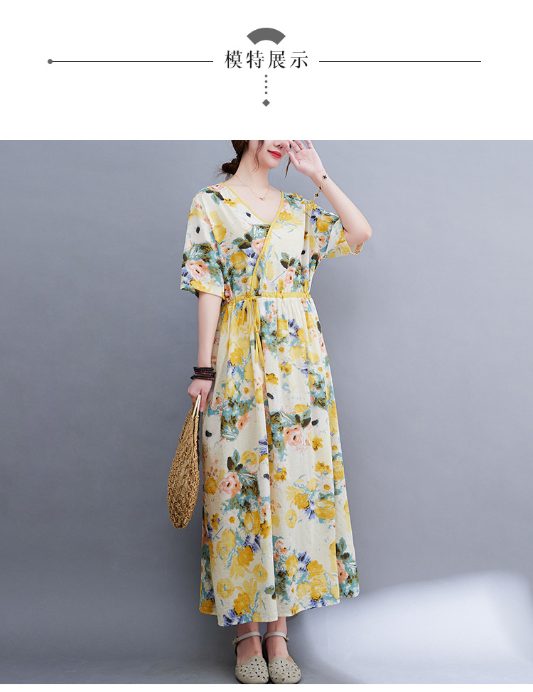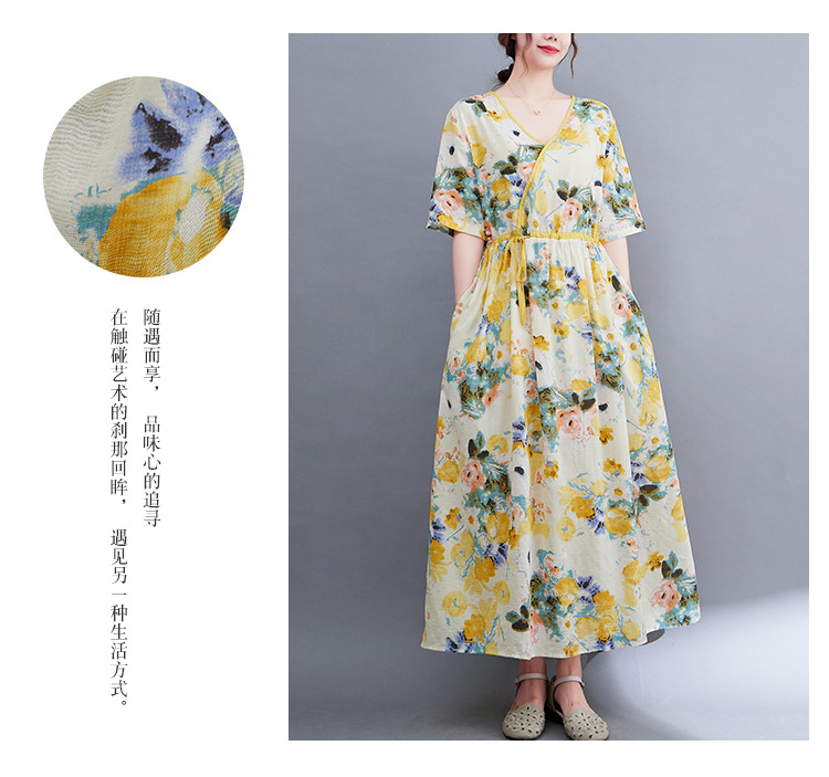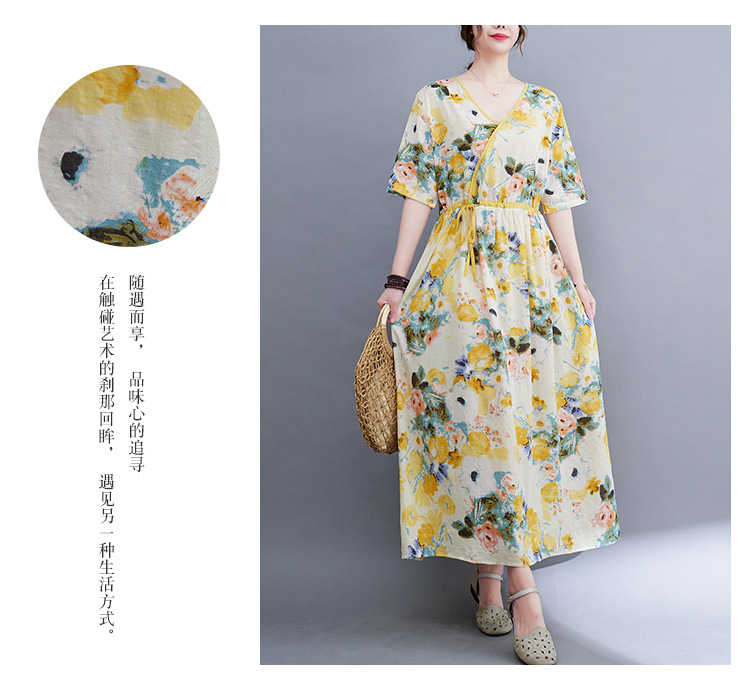 标题:婦人服ファッション夏の新作レトロ文芸ビッグサイズ着やせ引き紐ウエストVネックプリントワンピース