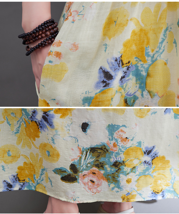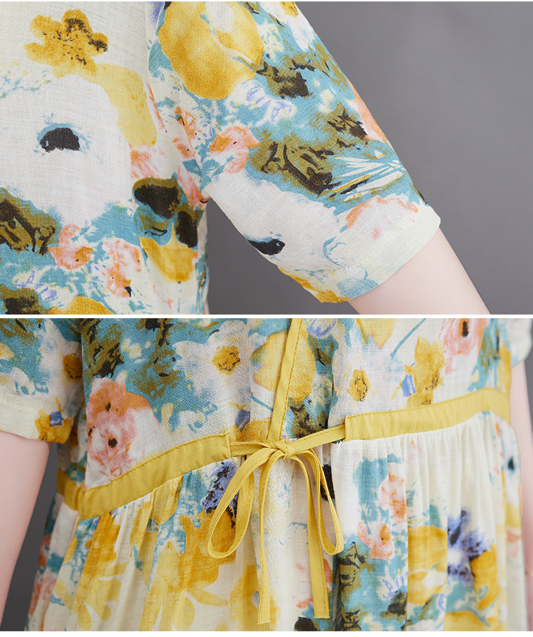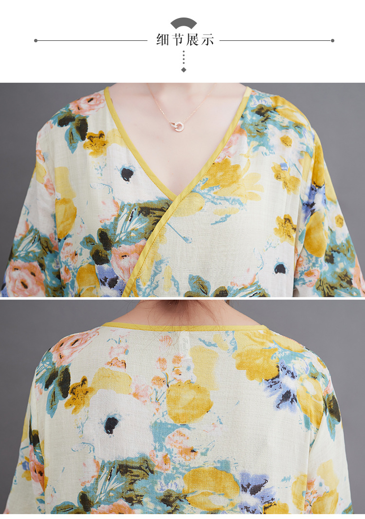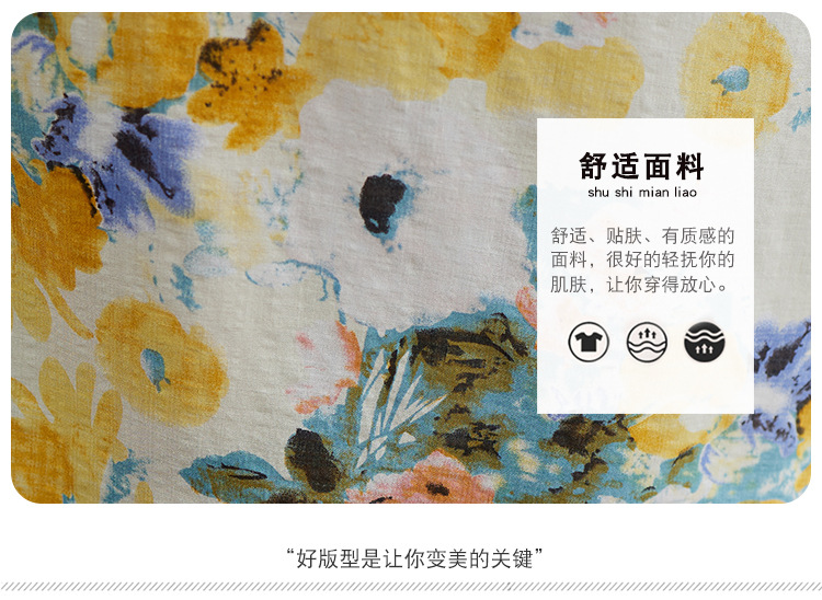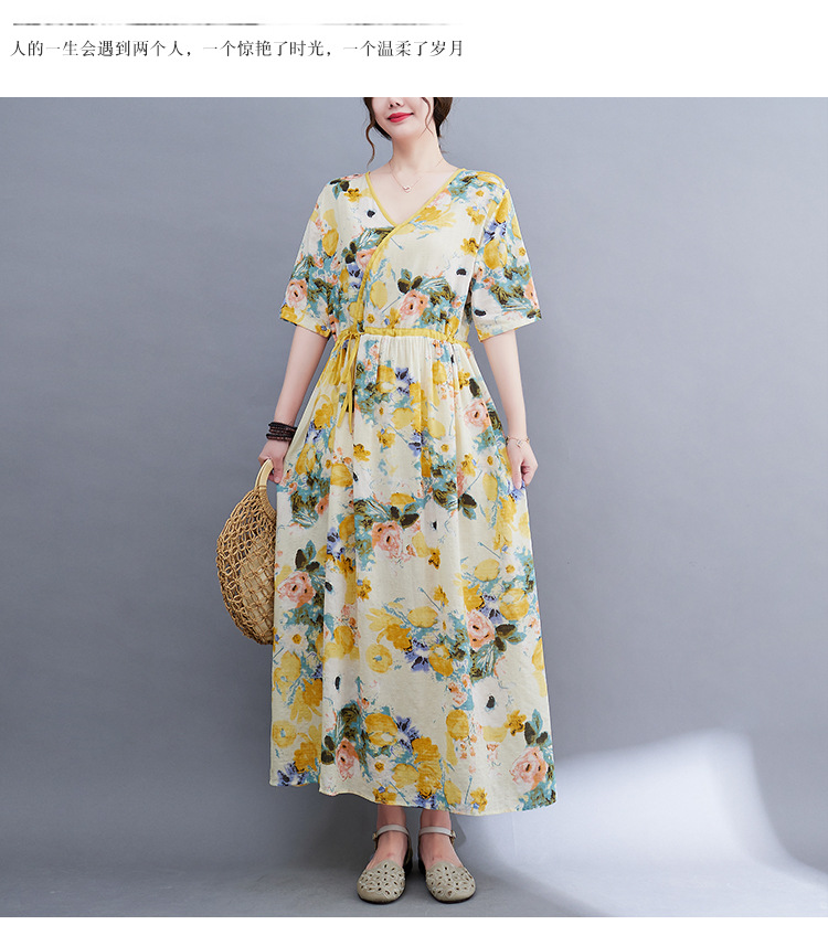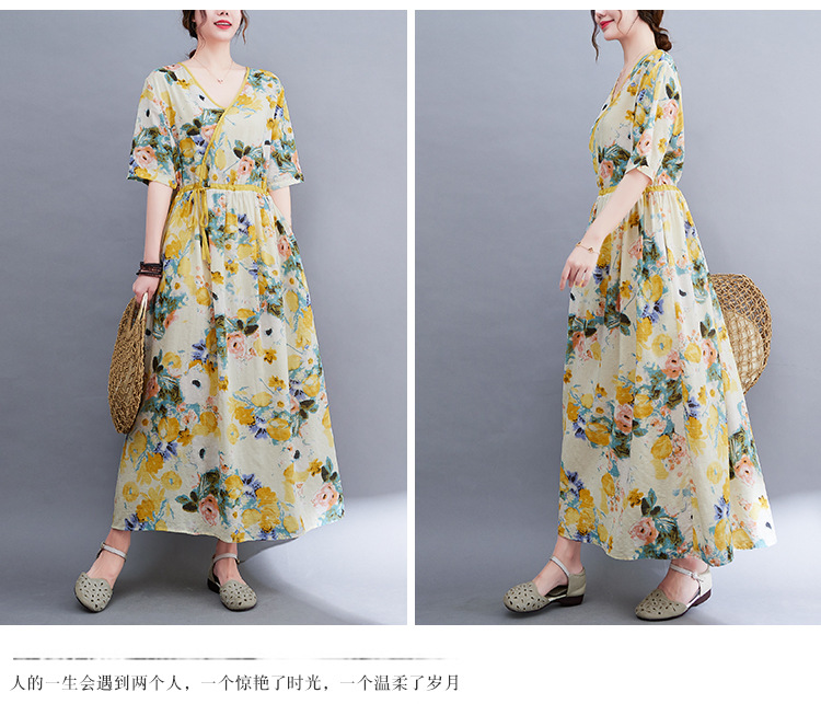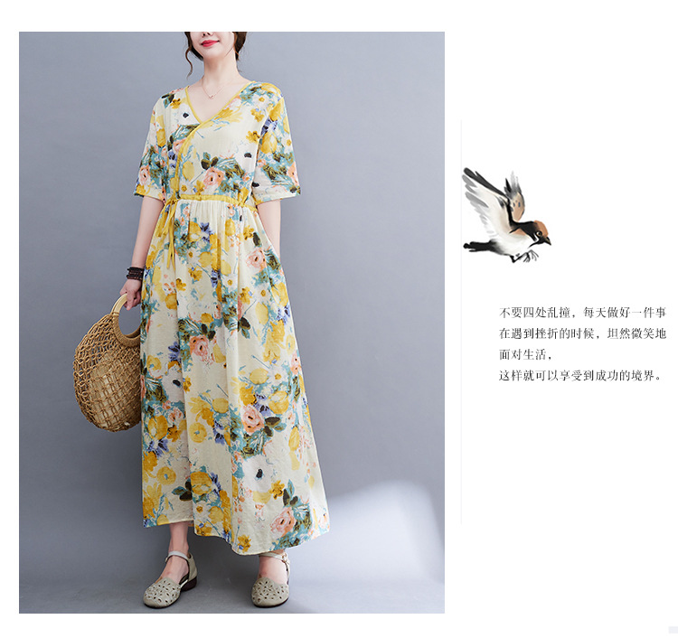 标题:婦人服ファッション夏の新作レトロ文芸ビッグサイズ着やせ引き紐ウエストVネックプリントワンピース