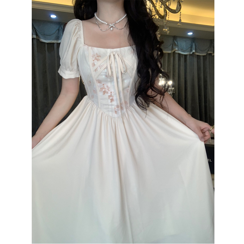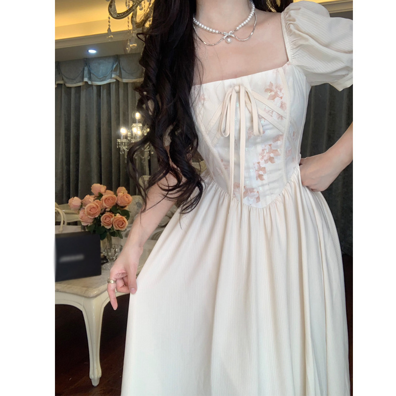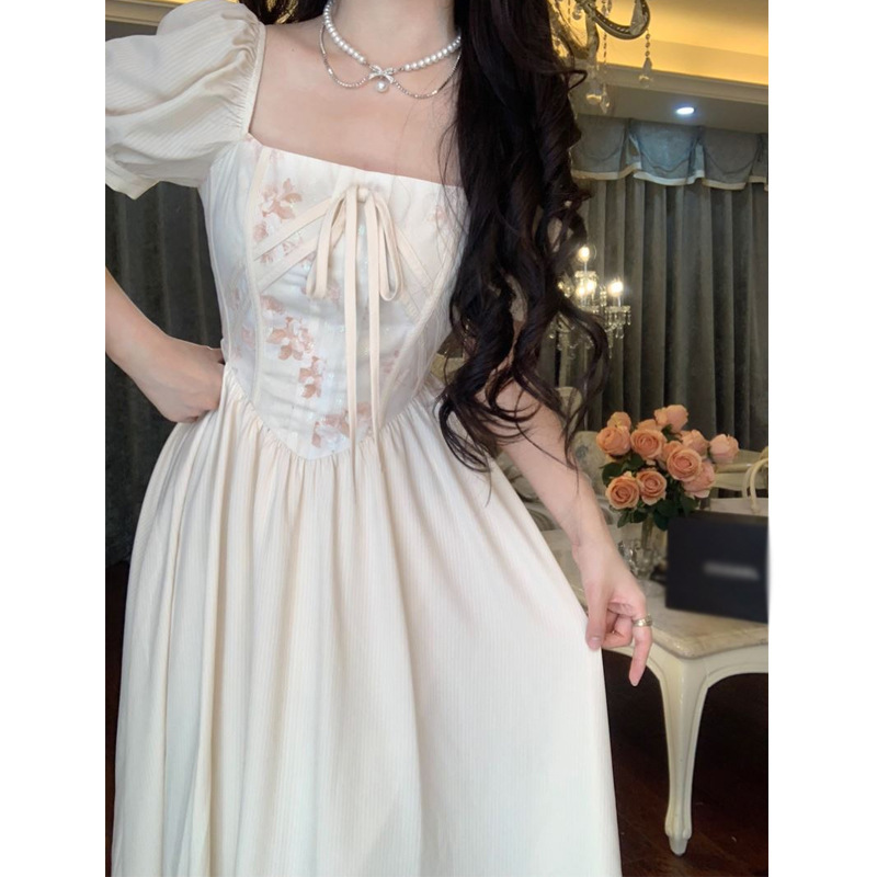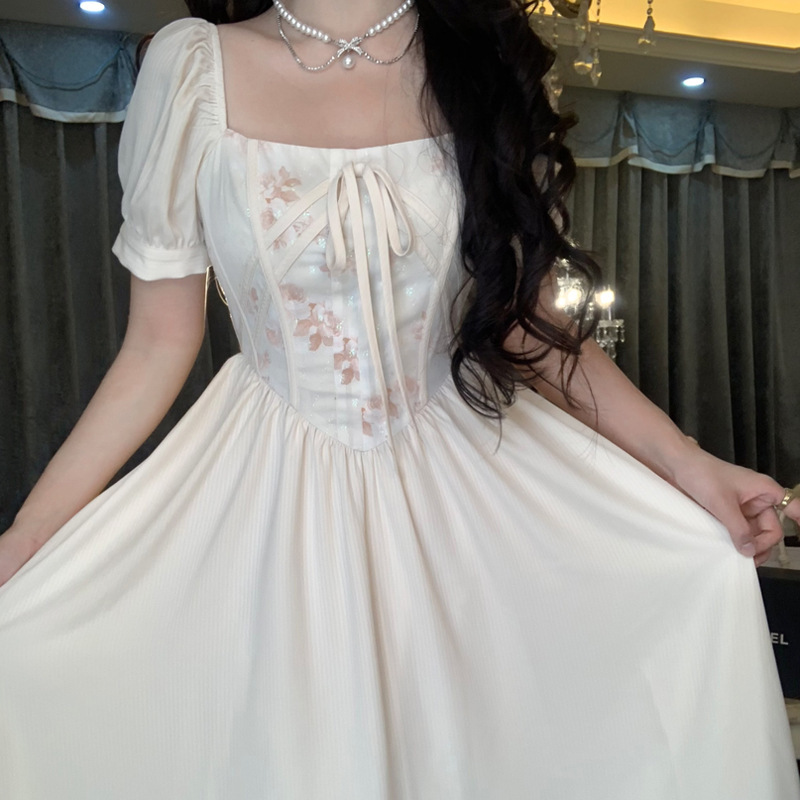 标题:春夏のフレンチレトロなピュアカラーのベルト付きウエストボーンパッチワークワンピース