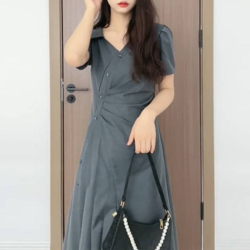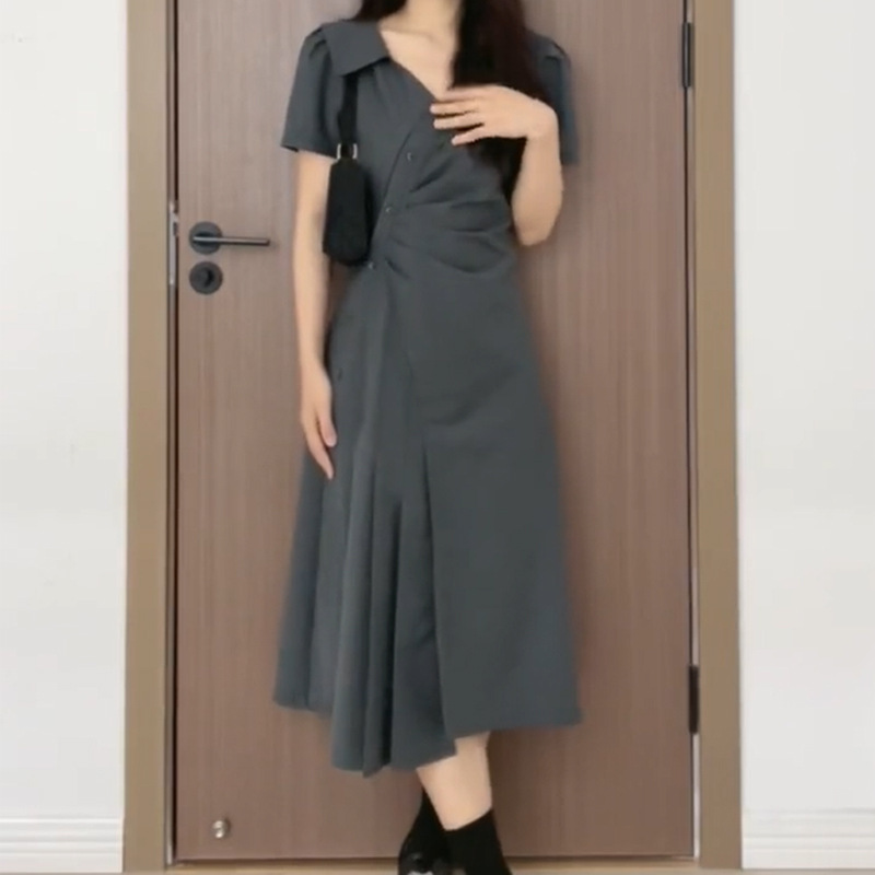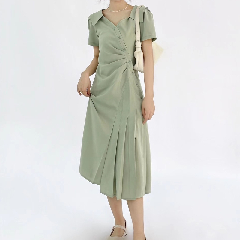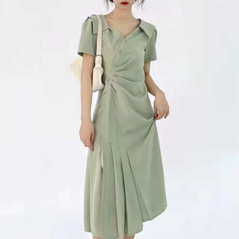 标题:ミディアム丈プリーツシャツワンピース春夏新デザイン甘い半袖グリーンスカートで身を修める