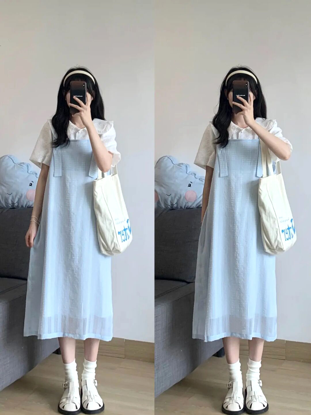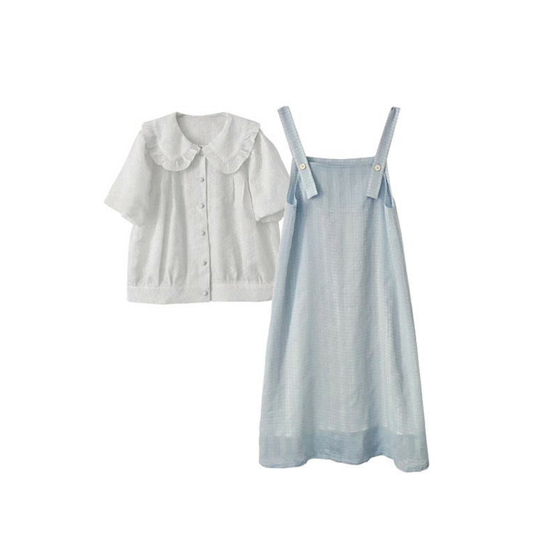 标题:夏の垢抜け活発塩可甘泡スリーブシャツストラップワンピース2枚セット学院風小柄
