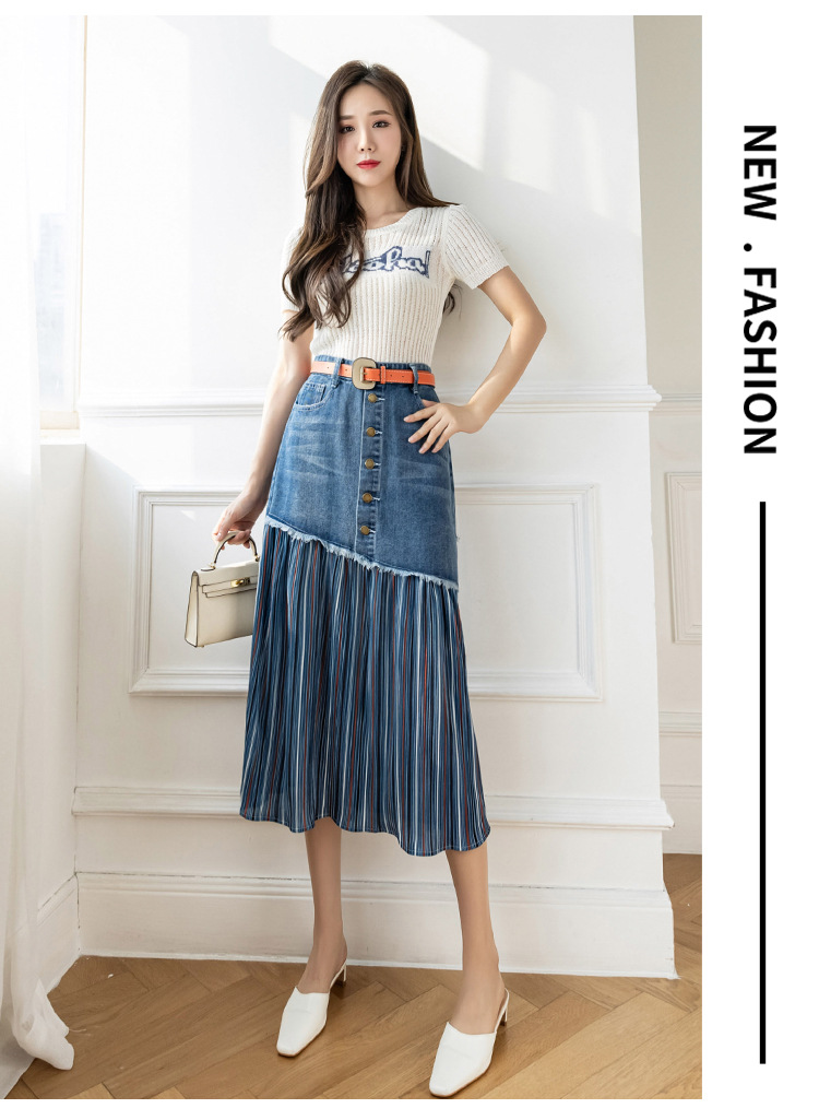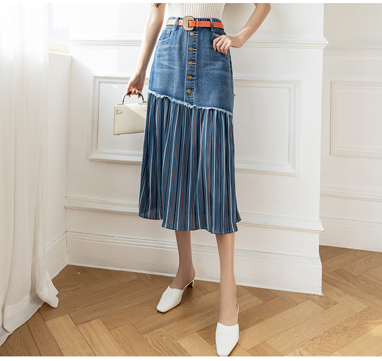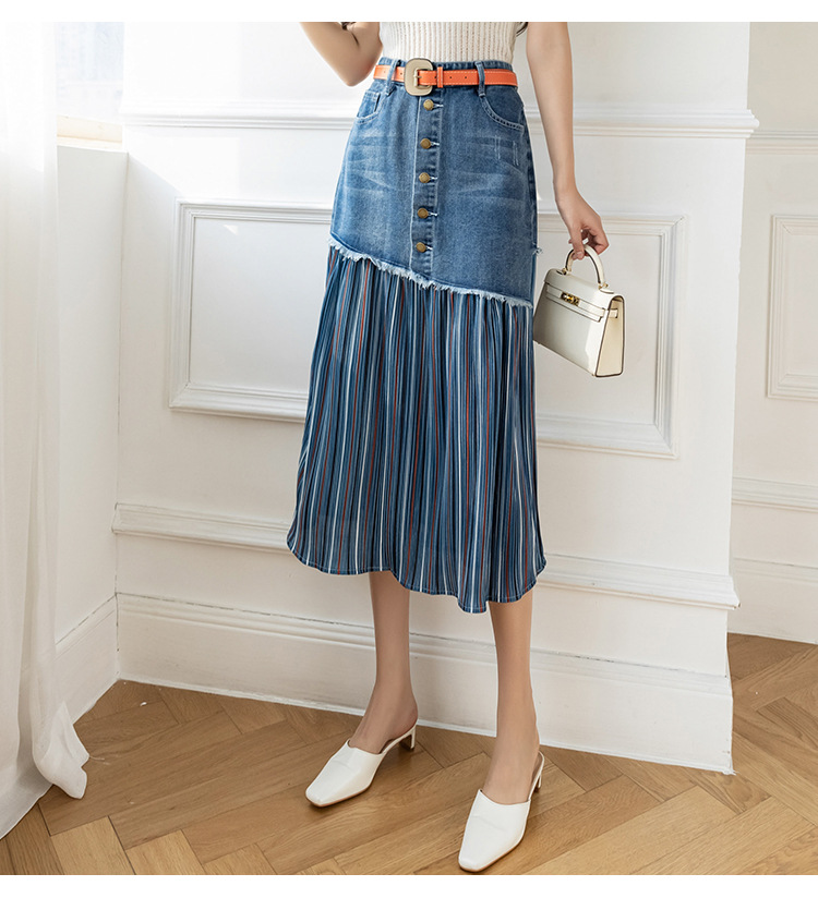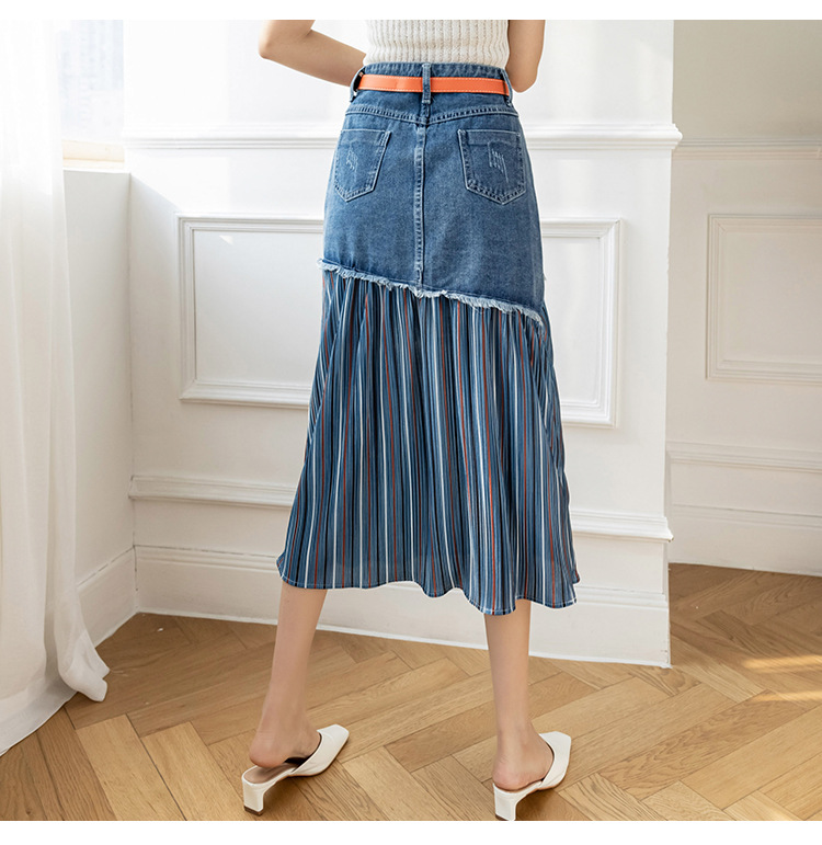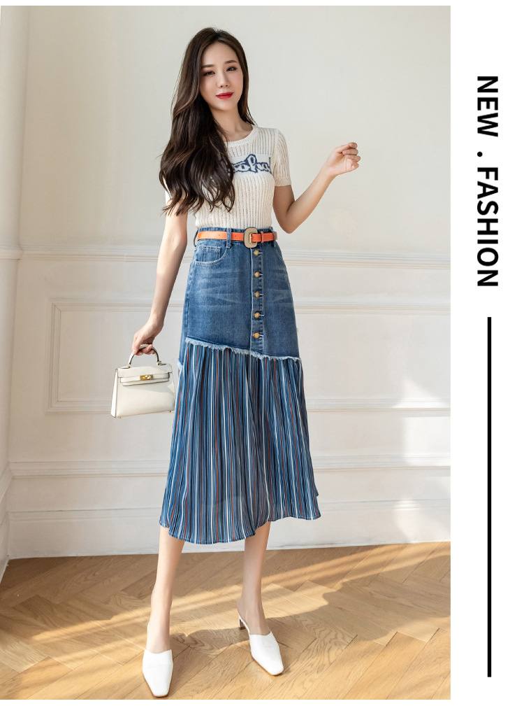 标题:秋冬新款韩版轻熟气质高腰牛仔半身裙女拼接条纹中长裙显瘦a字裙