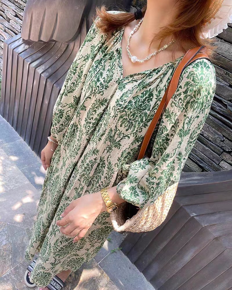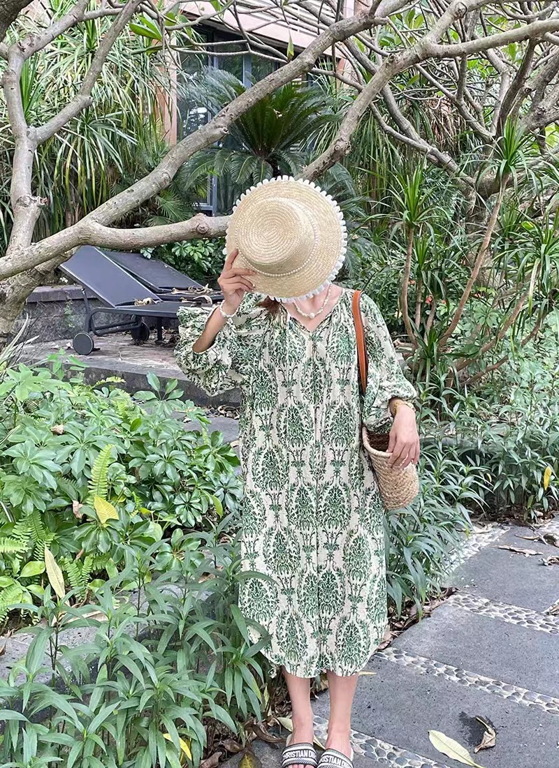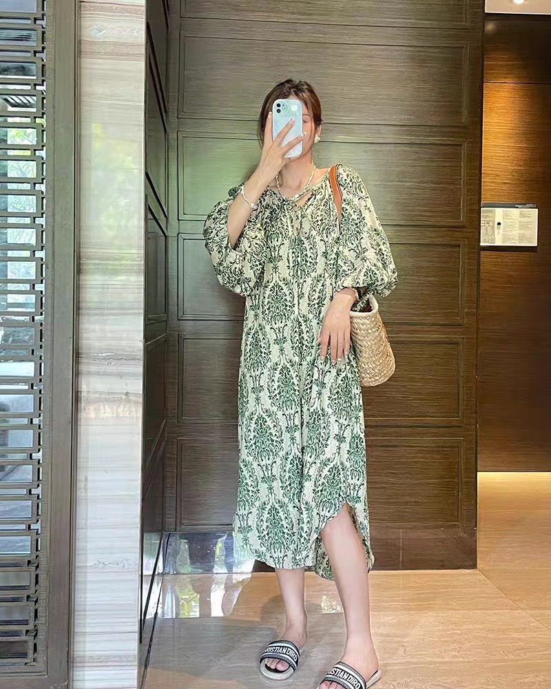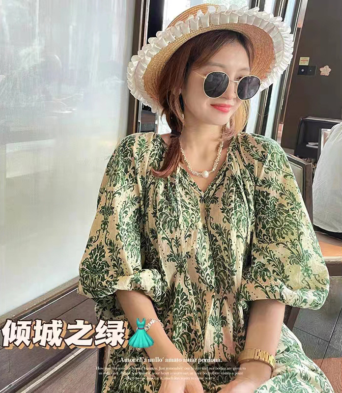 描述:面料名称:棉,图案:碎花,工艺:免烫处理,产地:广州,款式:套头,组合形式:单件,裙长:中长裙,裙型:A字裙,领型:V字领,袖型:泡泡袖,袖长:五分袖,腰型:高腰,流行元素:碎花,上市年份/季节:2023年夏季,主面料成分:棉,主面料成分2:其它,货号:H27131,品牌:其他,颜色:倾城之绿连衣裙,尺码:均码,风格类型:清新甜美,门襟:套头,主面料成分含量:80%(含)-90%(不含),风格:田园风,跨境风格类型:甜美清新,是否跨境货源:是,主面料成分2含量:30%以下,主要下游销售地区1:东南亚,主要下游销售地区2:中东,