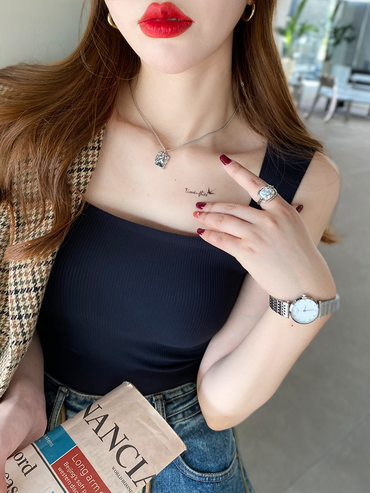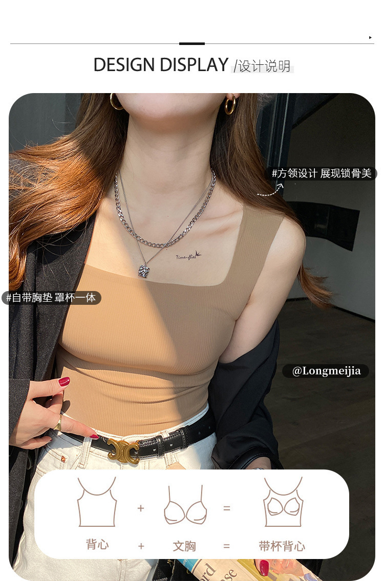 标题:无痕美背宽肩带背心带胸垫冰丝螺纹棉方领吊带内衣女外搭内穿上衣