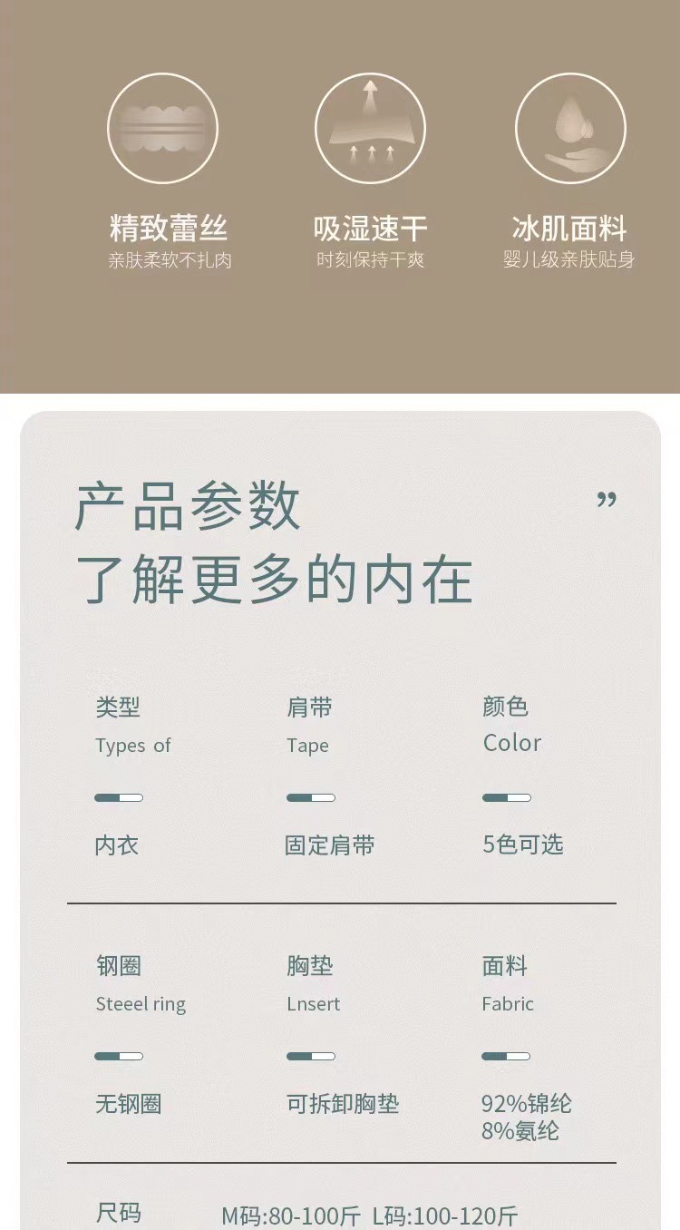 描述:面料名称:锦纶,主面料成分:锦纶,产品类别:裹胸/抹胸,货号:8505,功能:聚拢,透气,无缝,美背,大胸显小,产地:汕头,衣长:及胸,颜色:黑色,墨绿色,卡其色,红色,宝蓝色,尺码:L【80-120斤】,XL【120-170斤】,XXL【150-190斤】,是否跨境出口专供货源:是,上市时间:2023年春季,适用年龄段:青年(18-40周岁),款式:背心式,风格:法式,模杯类型:薄模杯,罩杯型:3/4罩杯,主面料成分含量:90%(含)-95%(不含),