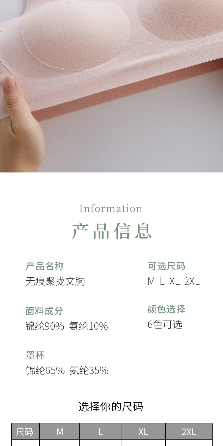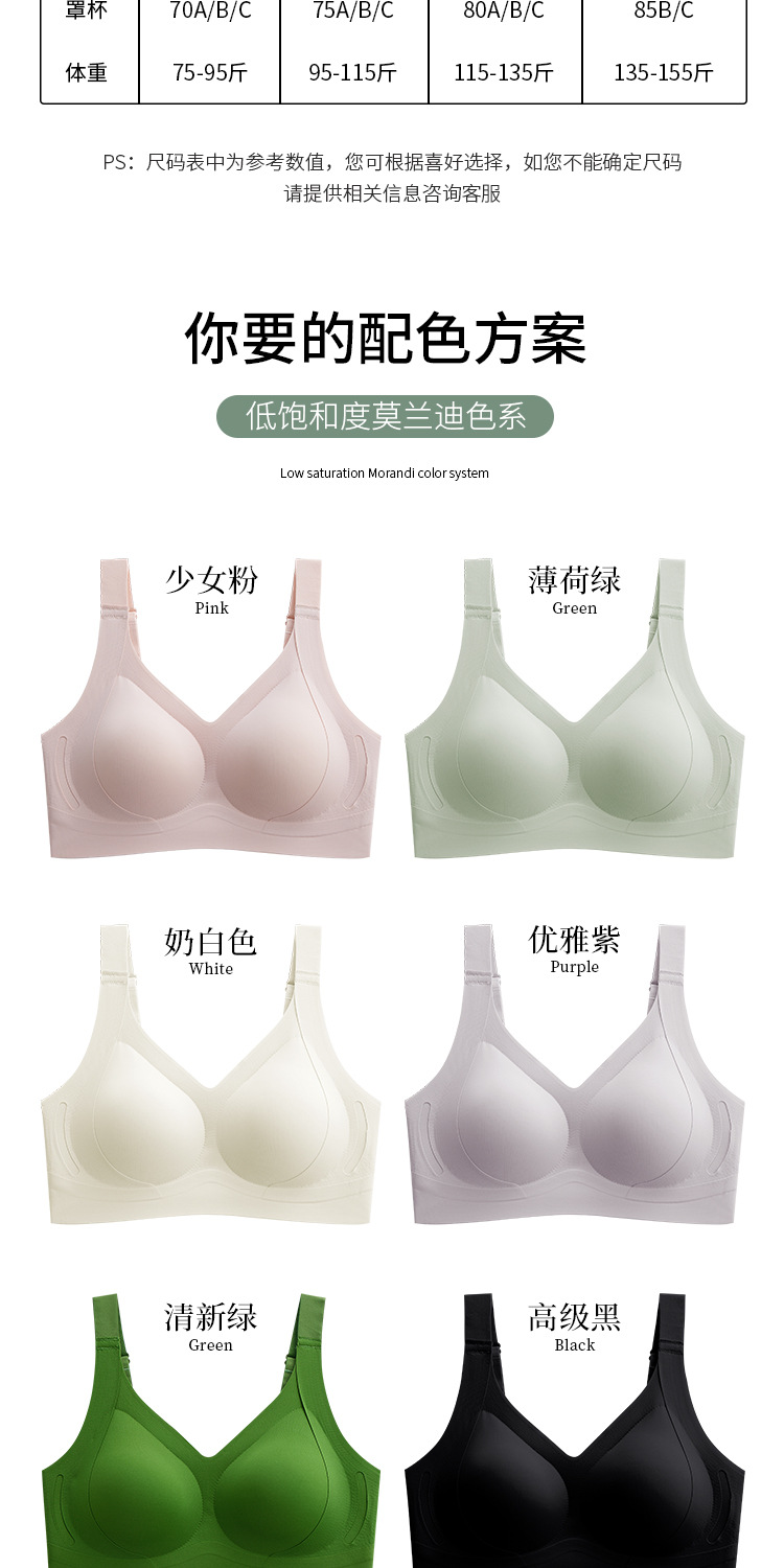 描述:面料名称:锦纶,主面料成分:锦纶,功能:聚拢,无痕,上托,调整型,收副乳,适用年龄段:青年(18-40周岁),颜色:少女粉,薄荷绿,奶白色,优雅紫,清新绿,高级黑,尺码:M(75-95斤),L(95-115斤),XL(115-135斤),2XL(135-155斤),是否跨境出口专供货源:是,产地:汕头,货号:W氧肤2.0,上市时间:2023年春季,罩杯型:3/4罩杯,模杯类型:薄模杯,模杯面料:乳胶,排扣类型:无排扣,肩带类型:可拆卸双肩带,款式:背心式,里料成分:锦纶/尼龙,主面料成分含量:80%(含)-90%(不含),风格:性感风,里料成分含量:80%(含)-90%(不含),