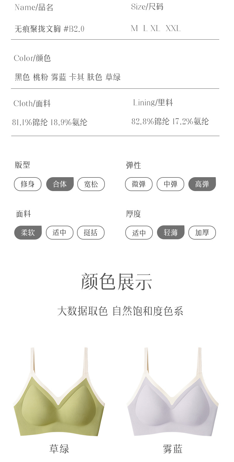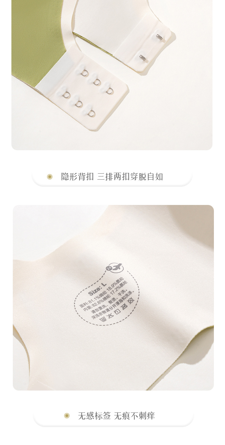 描述:面料名称:冰丝,主面料成分:锦纶,产品类别:裹胸/抹胸,货号:B2.0,功能:聚拢,无痕,美背,舒适,产地:汕头,品牌:其他,衣长:及胸,颜色:草绿,肤色,黑色,灰紫,卡其,雾蓝,尺码:M,L,XL,2XL,是否跨境出口专供货源:是,上市时间:2023年春季,适用年龄段:青年(18-40周岁),款式:软支撑,风格:欧美风,模杯类型:薄模杯,罩杯型:3/4罩杯,主面料成分含量:70%(含)-80%(不含),