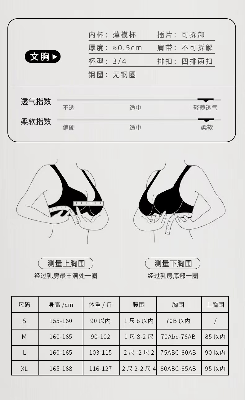 属性:S(32/70ABC),M(34/75ABC),L(36/80ABC),XL(38/85ABC)