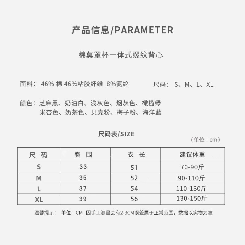 描述:面料名称:优可丝,主面料成分:棉,主面料成分的含量:46,品牌:AIyo,产品类别:工字背心,产地:青岛,货号:A2301,加工周期:7-10,最低贴牌量:500,颜色:奶油白,浅灰色,烟灰色,芝麻黑,橄榄绿,米杏色,奶茶色,贝壳粉,梅子粉,海洋蓝,天空蓝,尺码:S,L,XL,M,是否跨境出口专供货源:否,款式细节:海绵垫,上市时间:2023年夏季,款式:背心式,风格:百搭,领型:圆领,季节:四季通用,主面料成分含量:30%(含)-50%(不含),