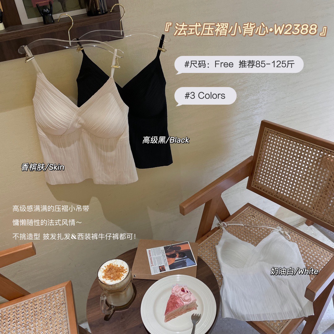 描述:面料名称:锦纶,主面料成分:锦纶,品牌:小云鲸,产品类别:吊带背心,产地:汕头,货号:2388,颜色:黑色,白色,肤色,尺码:均码,是否跨境出口专供货源:否,款式细节:棉垫,无缝/一片式,上市时间:2023年夏季,款式:吊带,风格:休闲,领型:V领,季节:夏季,春季,秋季,主面料成分含量:70%(含)-80%(不含),面料厚薄(克重):适中(141-160克/平米),