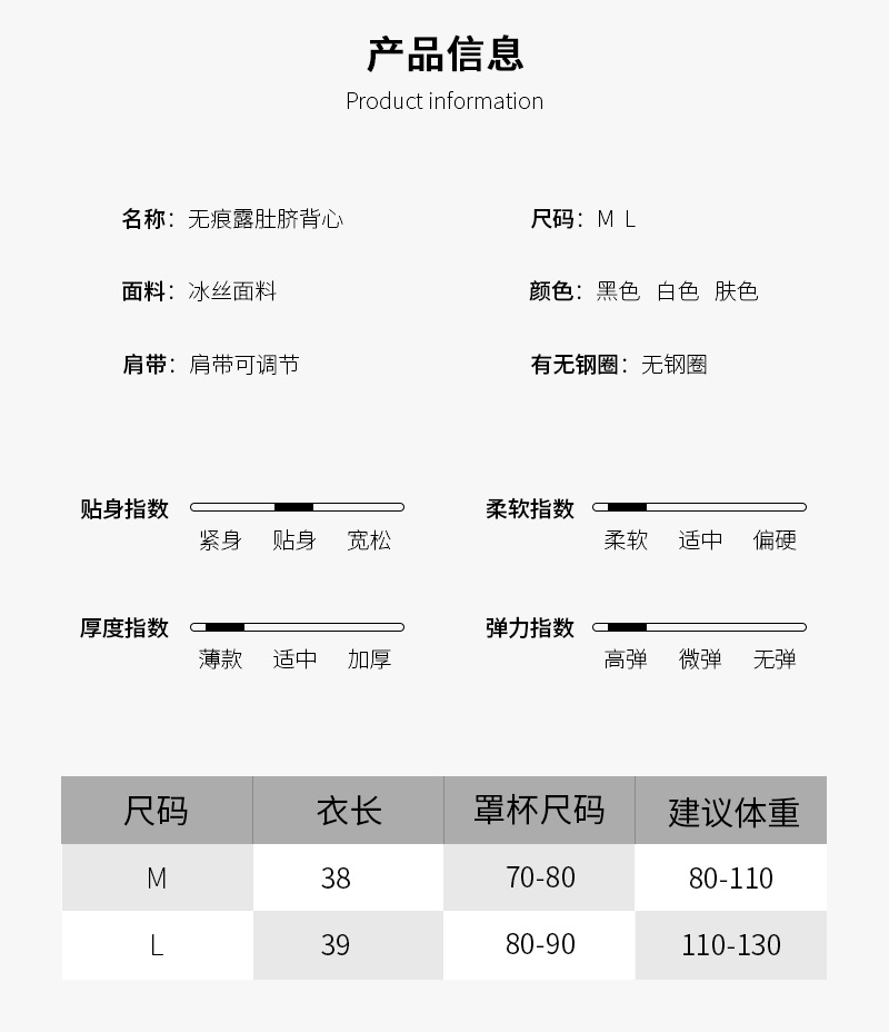 描述:面料名称:冰丝,主面料成分:锦纶/尼龙,产品类别:裹胸/抹胸,货号:85034,功能:无痕,透气,美背,防走光,舒适,产地:汕头,品牌:雅之痕,误差范围:1CM,衣长:及腰,颜色:白色,黑色,肤色,尺码:M,L,是否跨境出口专供货源:是,上市时间:2022年夏季,适用年龄段:青年(18-40周岁),款式:背心式,风格:日系风,模杯类型:薄模杯,罩杯型:全罩杯,主面料成分含量:70%(含)-80%(不含),主面料成分的含量:75,