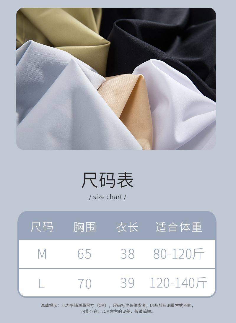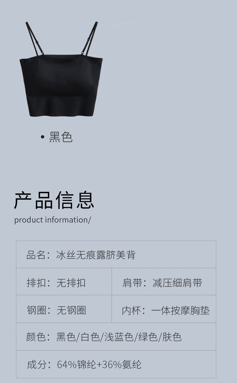 描述:面料名称:冰丝,主面料成分:锦纶,产品类别:裹胸/抹胸,货号:S202,功能:无痕,透气,美背,防走光,舒适,产地:汕头,品牌:雅之痕,衣长:及腰,颜色:黑色,白色,杏色,抹茶绿,浅蓝色,尺码:M,L,是否跨境出口专供货源:是,上市时间:2023年夏季,适用年龄段:青年(18-40周岁),款式:背心式,风格:日系风,模杯类型:中模杯,罩杯型:全罩杯,主面料成分含量:50%(含)-70%(不含),