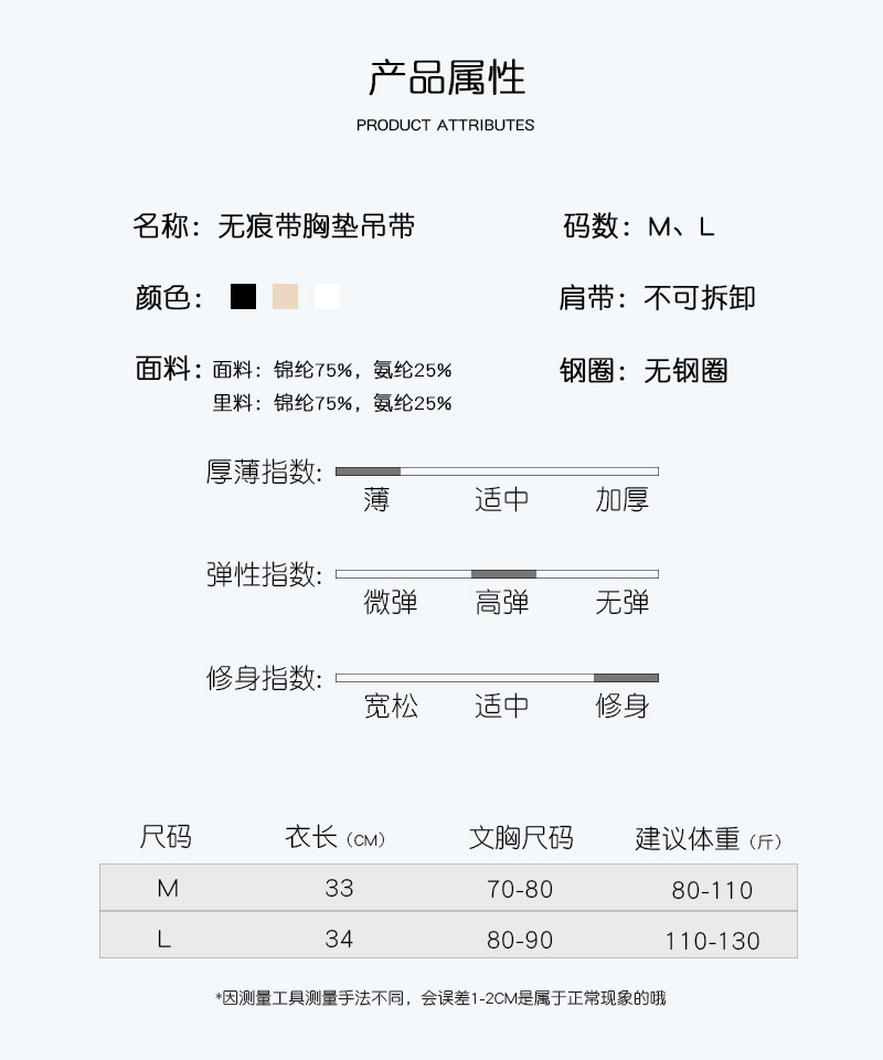 描述:面料名称:冰丝,主面料成分:锦纶,品牌:雅之痕,产品类别:吊带背心,产地:汕头,货号:304,颜色:白色,黑色,肤色,尺码:M,L,是否跨境出口专供货源:是,款式细节:无缝/一片式,上市时间:2023年春季,款式:吊带,风格:韩版,领型:一字领,季节:夏季,冬季,春季,秋季,四季通用,主面料成分含量:70%(含)-80%(不含),面料厚薄(克重):薄 (121-140克/平米),