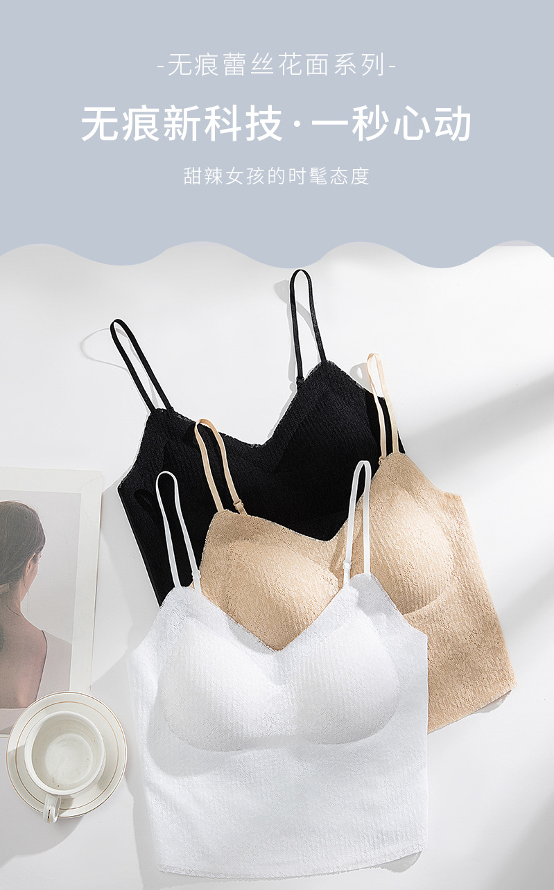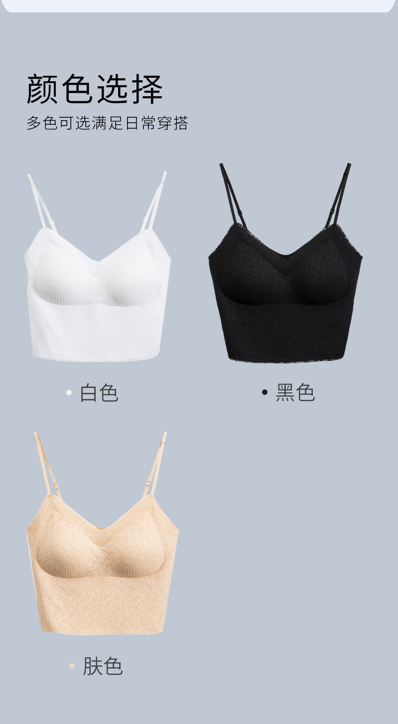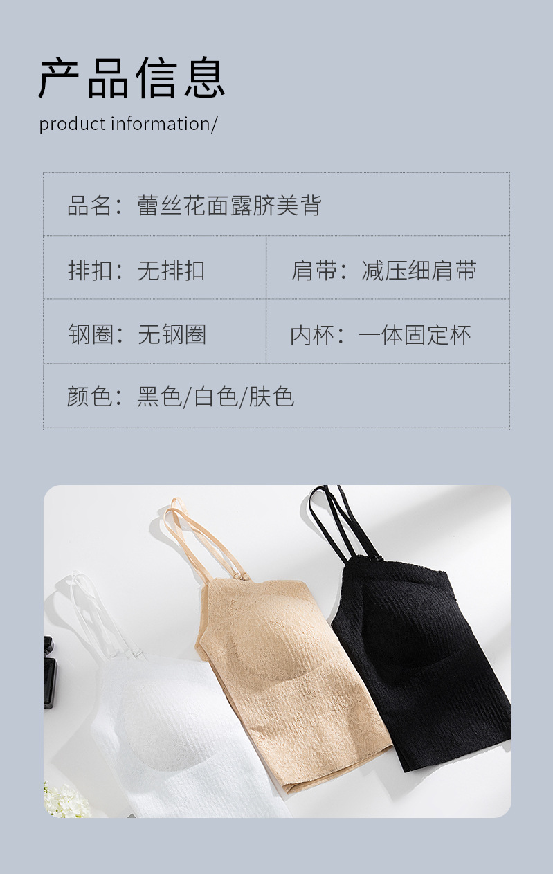 描述:面料名称:蕾丝,主面料成分:锦纶,产品类别:裹胸/抹胸,货号:707,功能:无痕,透气,美背,防走光,舒适,产地:汕头,品牌:雅之痕,衣长:及腰,颜色:白色,黑色,肤色,尺码:均码,是否跨境出口专供货源:是,上市时间:2023年夏季,适用年龄段:青年(18-40周岁),款式:背心式,风格:性感风,模杯类型:中模杯,罩杯型:全罩杯,主面料成分含量:70%(含)-80%(不含),