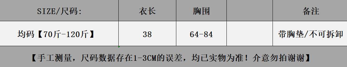 描述:货号:837#,品牌:other/其他,款式:吊带,版型:修身型,衣长:短款(40cm<衣长≤50cm),图案:字母/数字/文字,流行元素:印花,上市年份/季节:2023年夏季,面料名称:锦纶,主面料成分:氨纶,颜色:白色,黑色,绿色,深蓝色,橘黄色,咖啡色,尺码:均码【建议70-120斤】,主面料成分含量:70%(含)-80%(不含),风格:潮流风,风格类型:街头潮人,弹力:中弹,跨境风格类型:个性街头,是否跨境货源:是,肩带样式:不可拆卸,主要下游销售地区1:欧美,