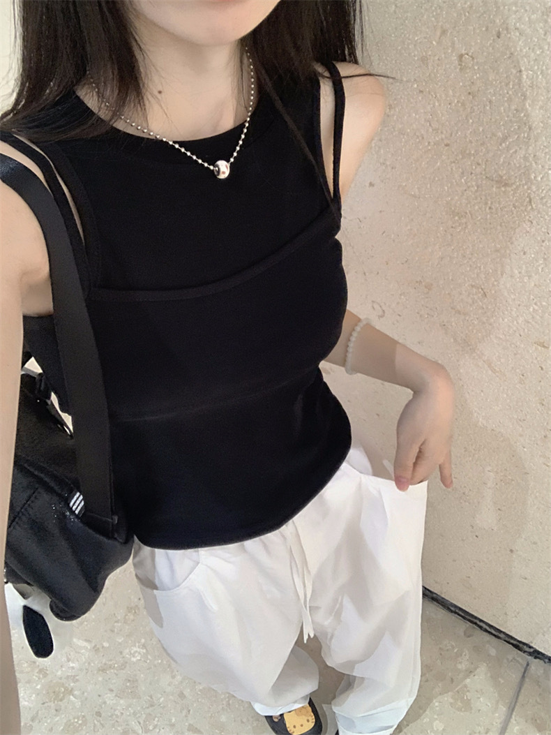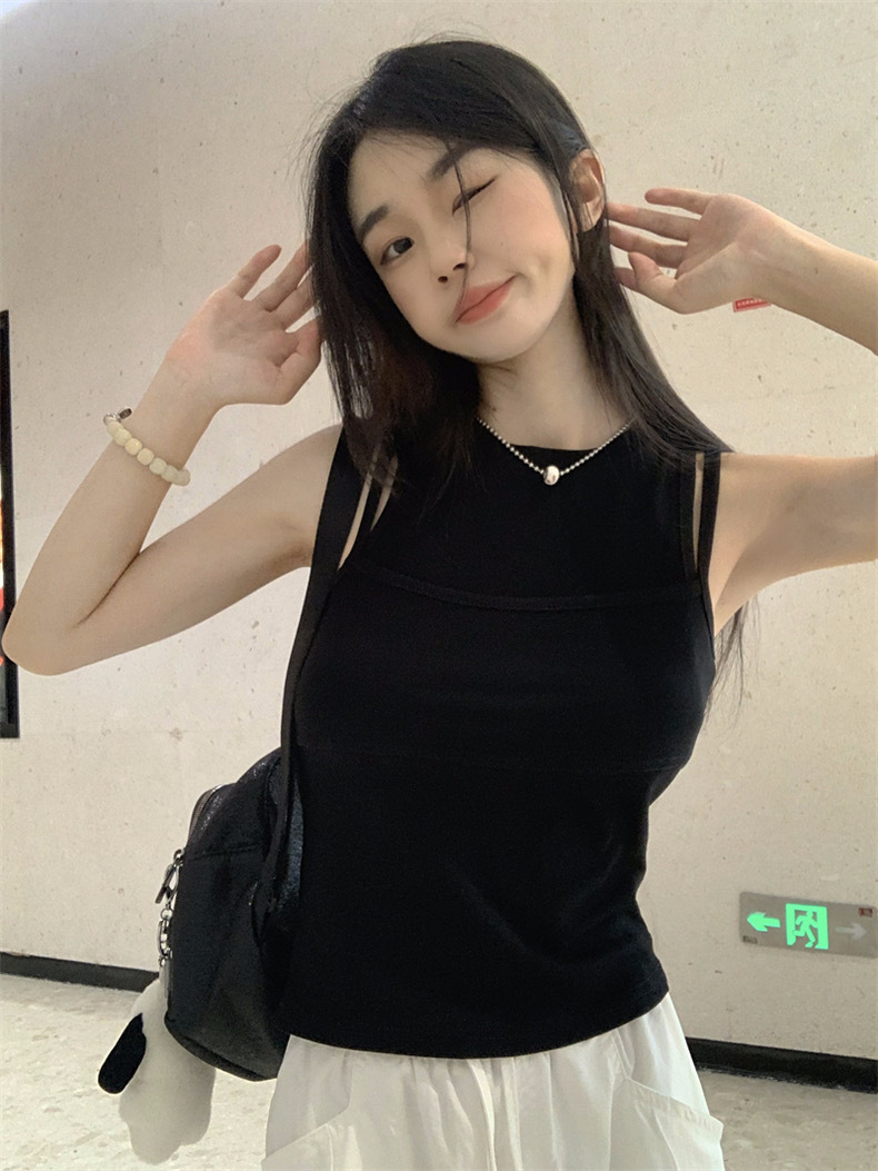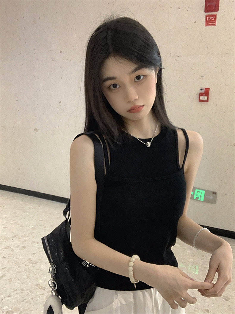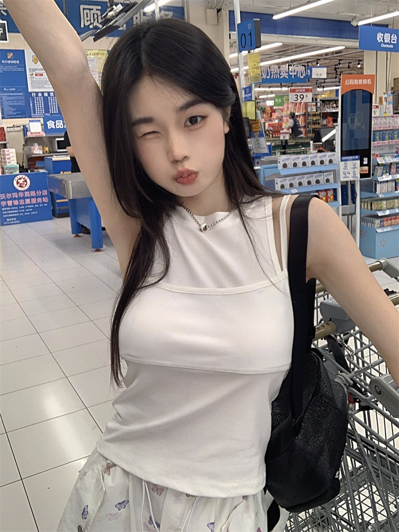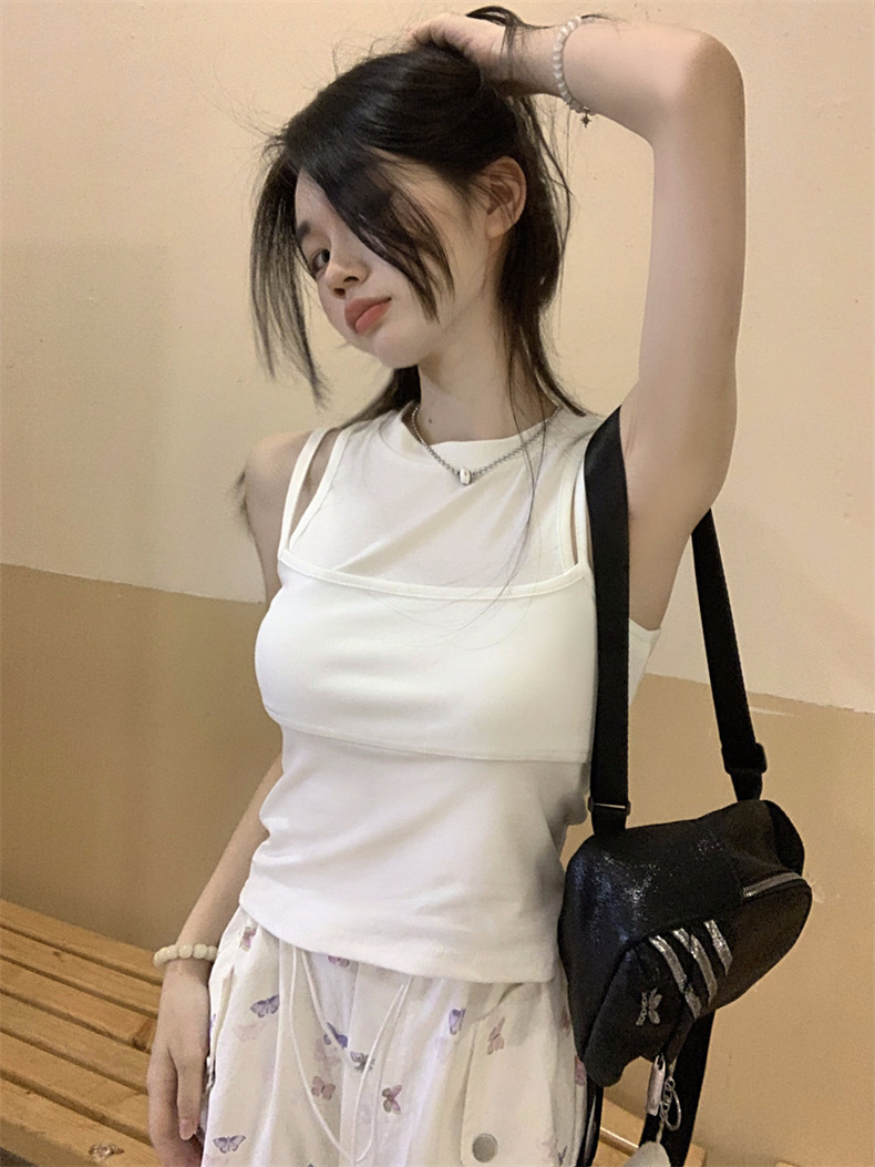标题:纯棉设计感百搭无袖背心女带胸垫修身显瘦外穿打底假两件辣妹上衣