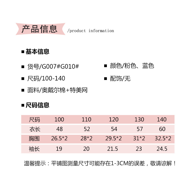 描述:货号:G007#,品牌:细萌子,货源类别:现货,适用性别:女,适用舞蹈类型:芭蕾,元素:套装,蕾丝,卡通,可爱,蝴蝶结,印花,拼色,公主,网纱,潮范,可开档,上市年份季节:2022年夏季,产地:广东,面料工艺:磨毛,涂层,剪毛,柔软处理,风格:甜美,AQL抽检标准:2.5,平车针距12~14针/3cm:是,毛头/杂余线头是否修剪:全部修剪干净,面料名称:棉,主面料成分:棉,主面料成分含量:90,安全等级:B类,适合季节:夏季,颜色:G007-爱丽丝,G010-白雪,0617B-舞蹈-粉色,0617B-舞蹈-蓝色,适合身高:100cm,110cm,120cm,130cm,140cm,主要下游平台:ebay,亚马逊,wish,速卖通,独立站,LAZADA,主要销售地区:非洲,欧洲,南美,东南亚,北美,东北亚,中东,有可授权的自有品牌:是,是否跨境出口专供货源:是,适合年龄段:中小童(3~8岁,100~140cm),