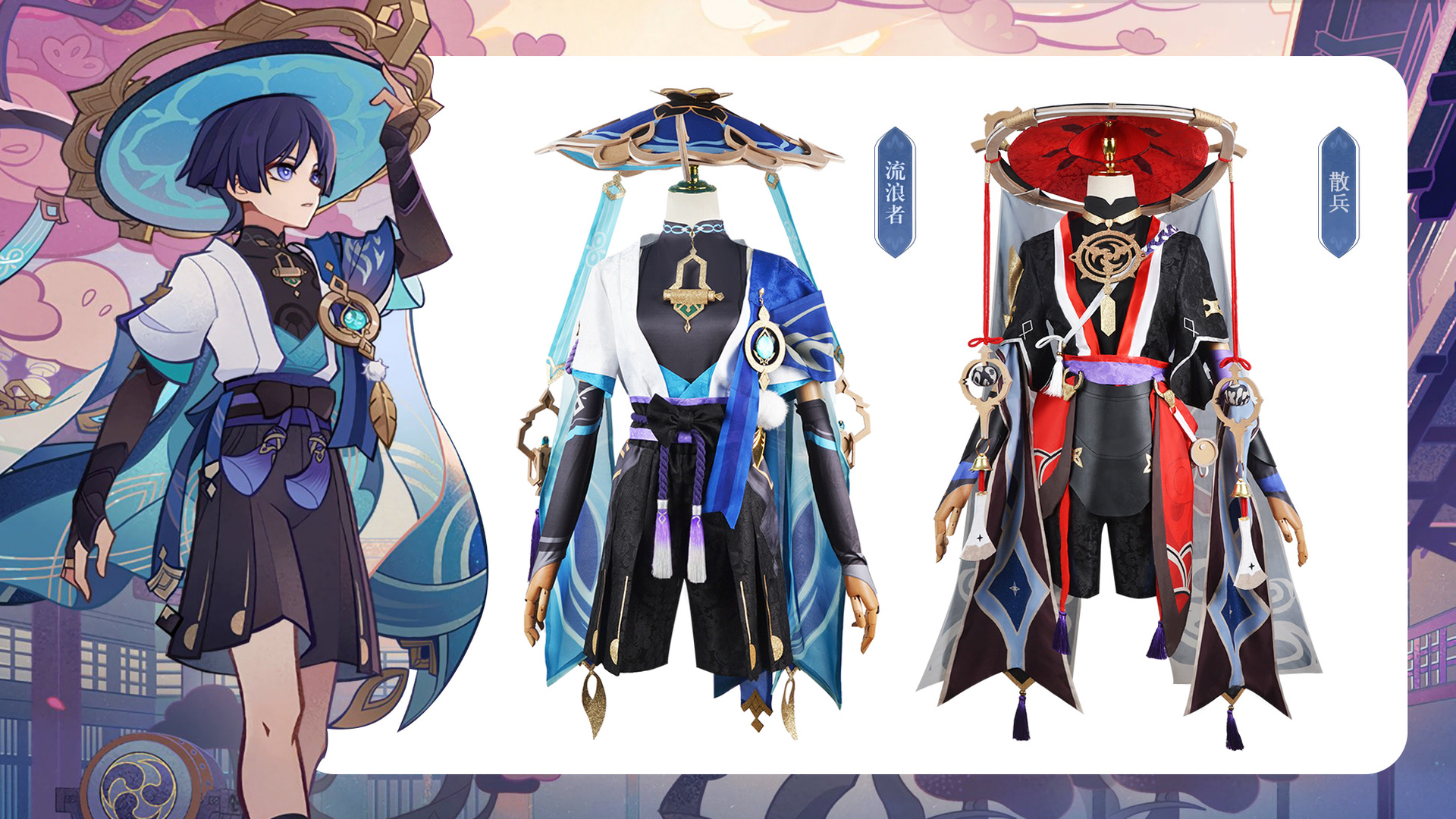 属性:国崩散兵服装(不含斗笠),流浪者散兵服装(不含斗笠),散兵假发,国崩散兵单斗笠,国崩散兵服装+斗笠,流浪者散兵服装+斗笠,国崩散兵单鞋子(蓝色),流浪者散兵单鞋子(蓝色),流浪者帽子