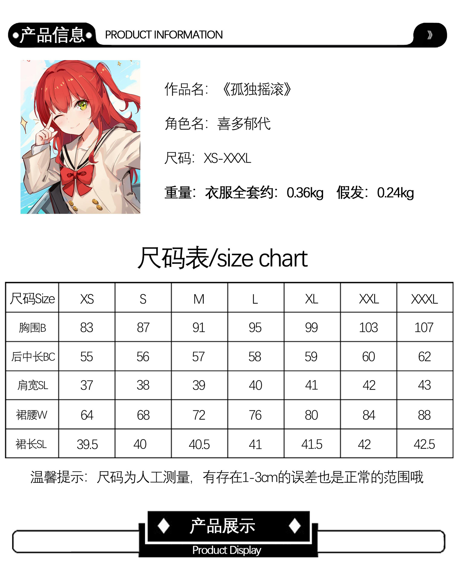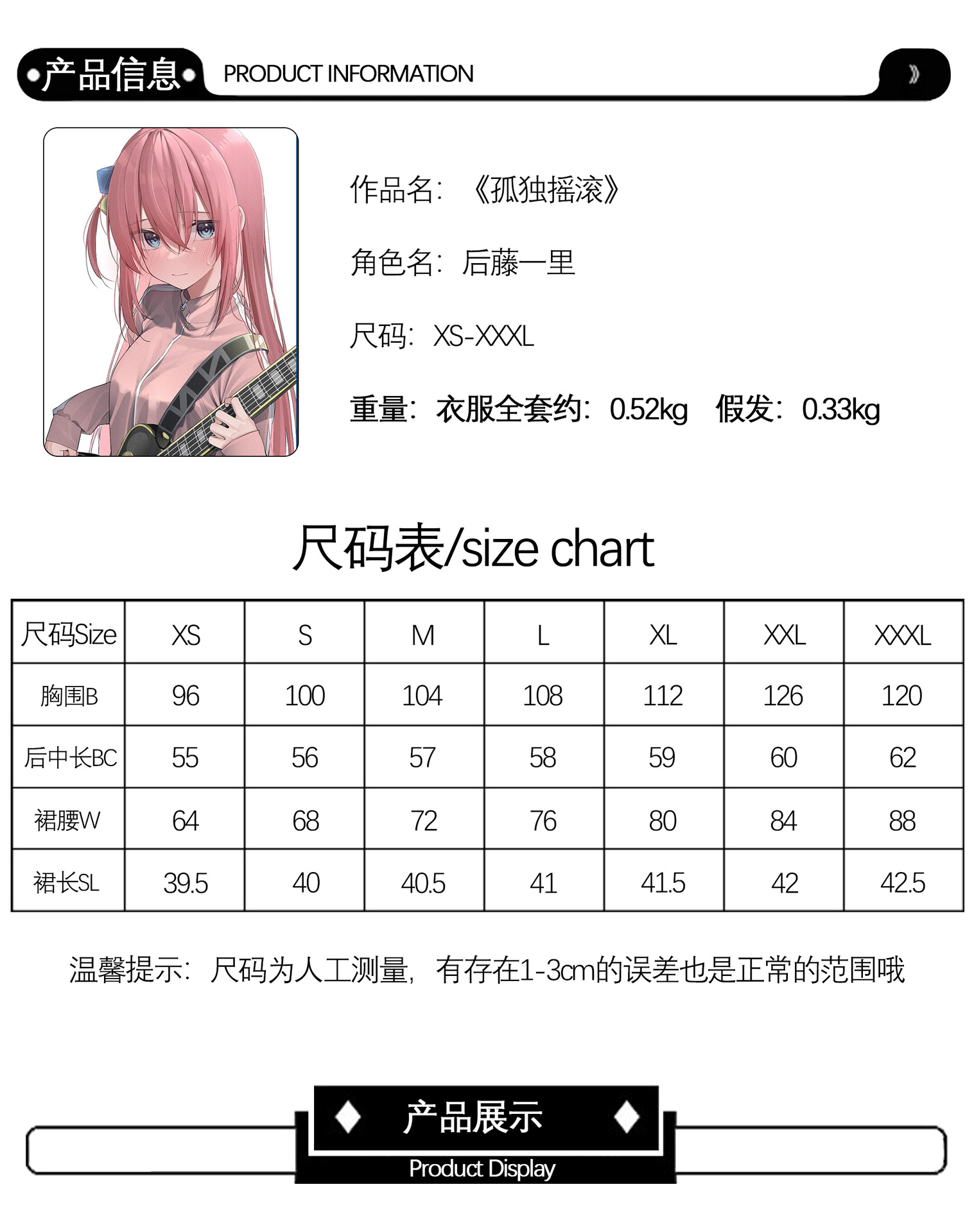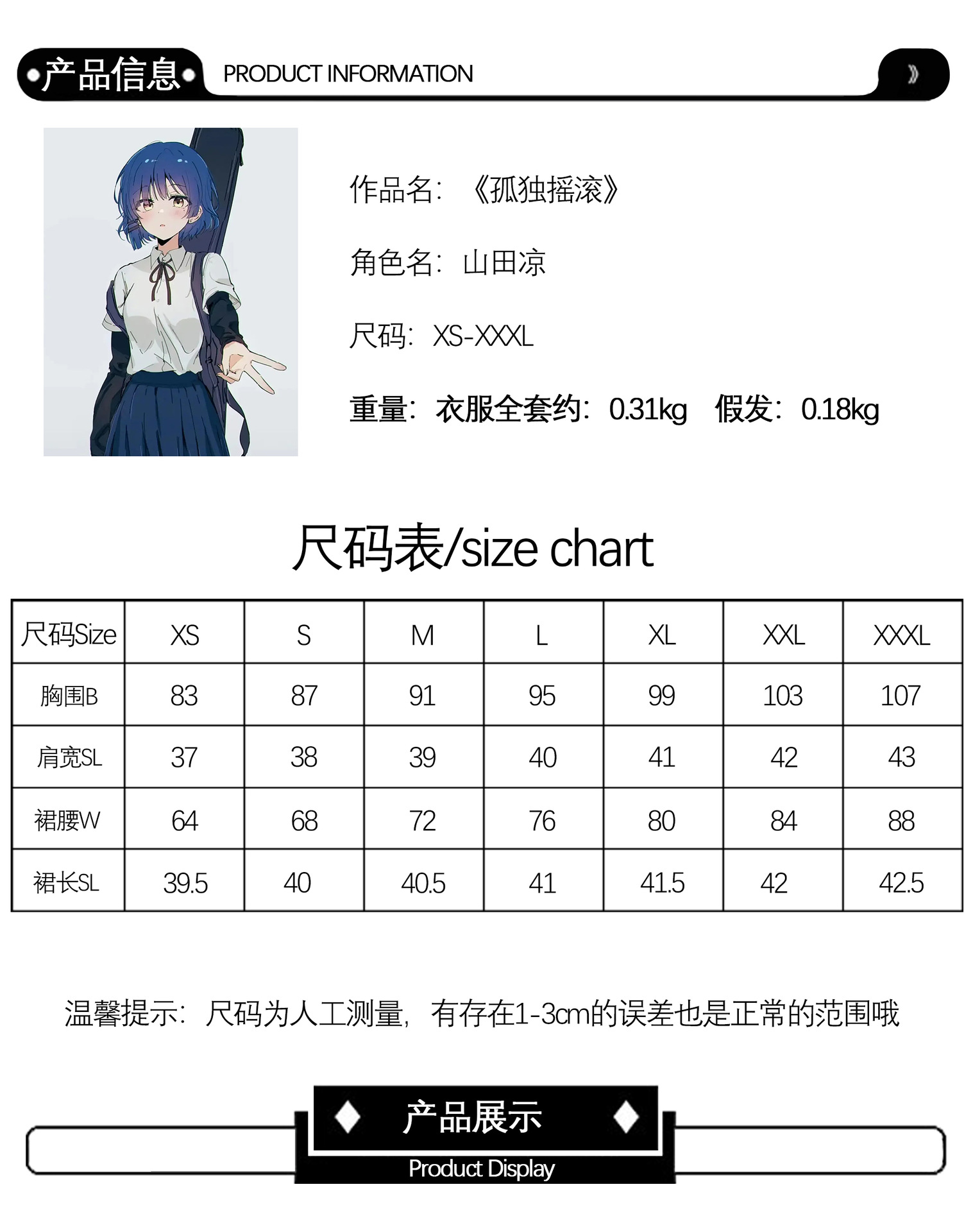 属性:后藤一里服装全套【商家推荐】,喜多郁代服装全套,伊地知虹夏服装全套,山田凉服装全套,广井菊里【外套+连衣裙】,广井菊里【单外套】,后藤一里【单假发】,伊地知虹夏【单假发】,山田凉假发【单假发】,喜多郁代【单假发】