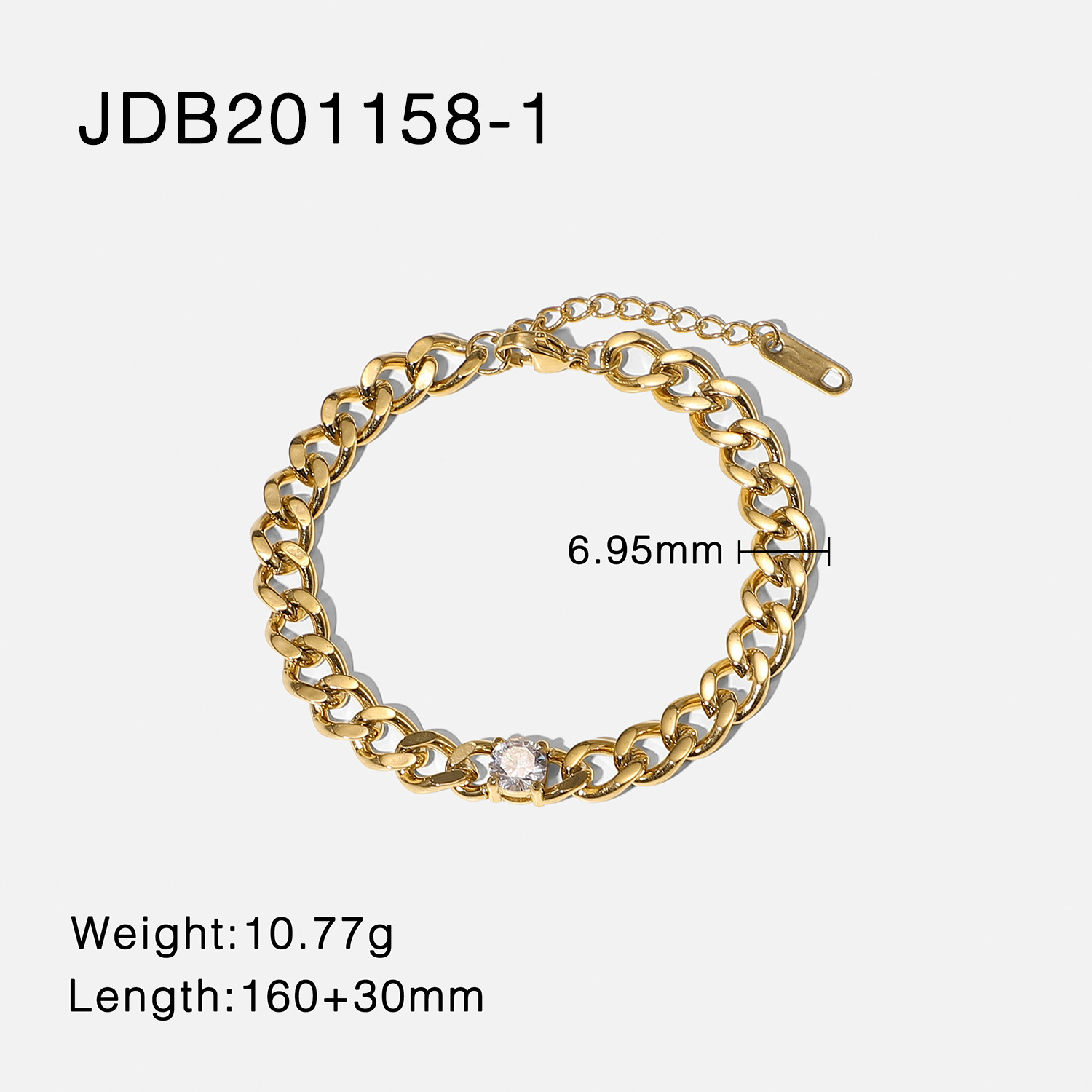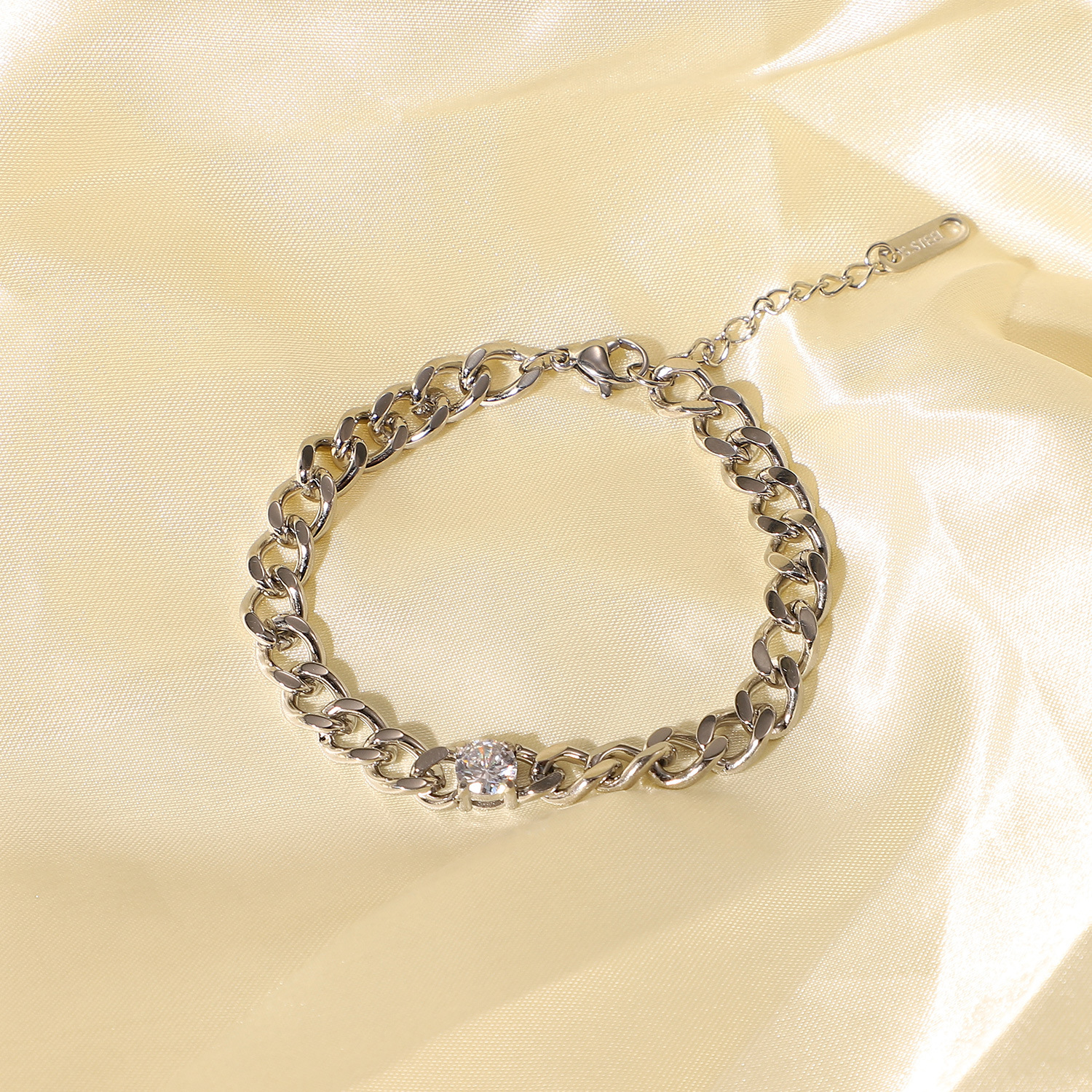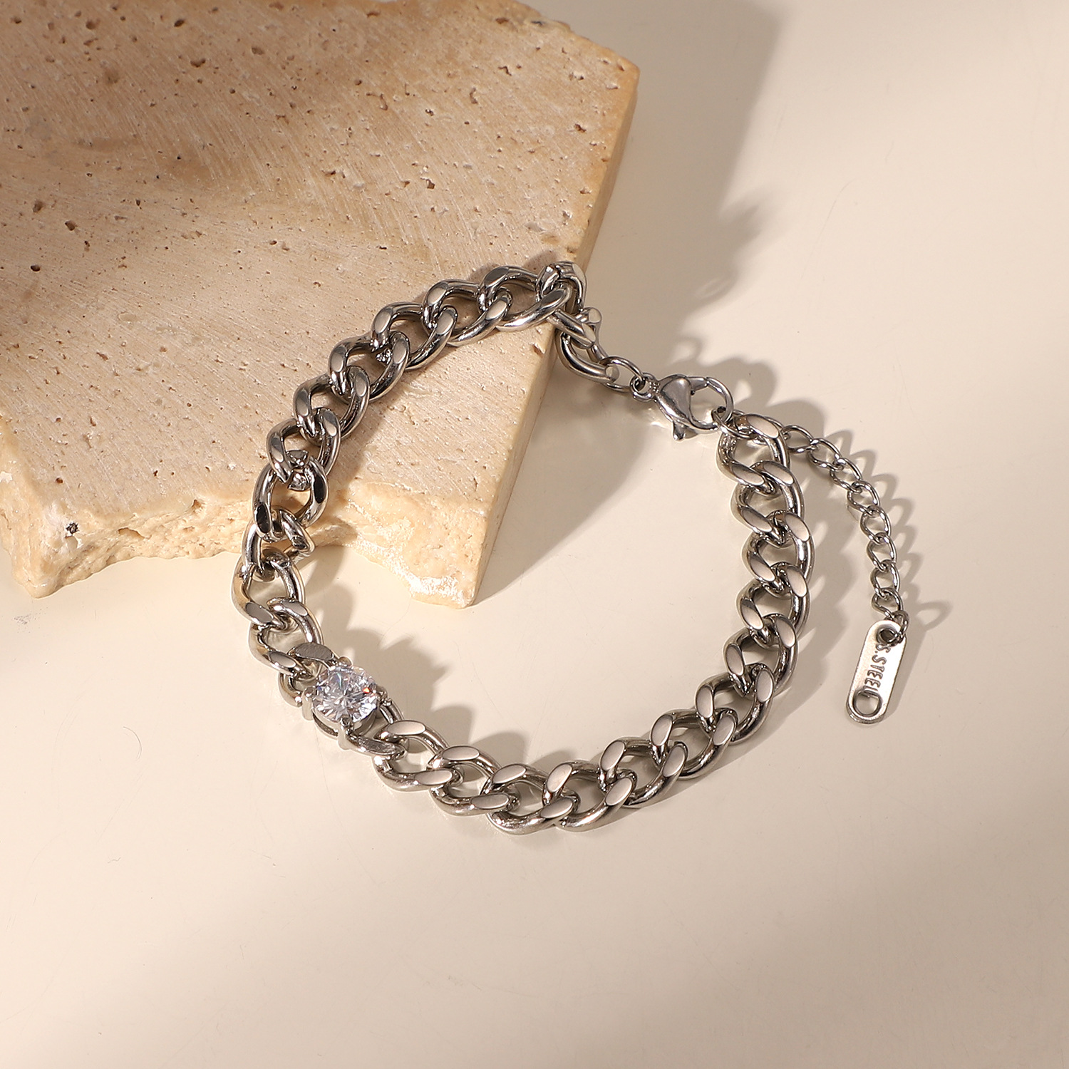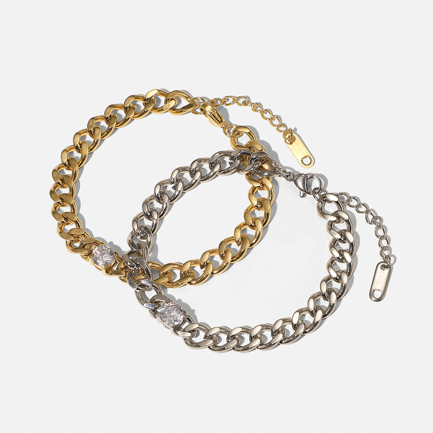 标题:欧美风新款14K镀金不锈钢金/钢色古巴链单颗锆石手链女式钛钢饰品