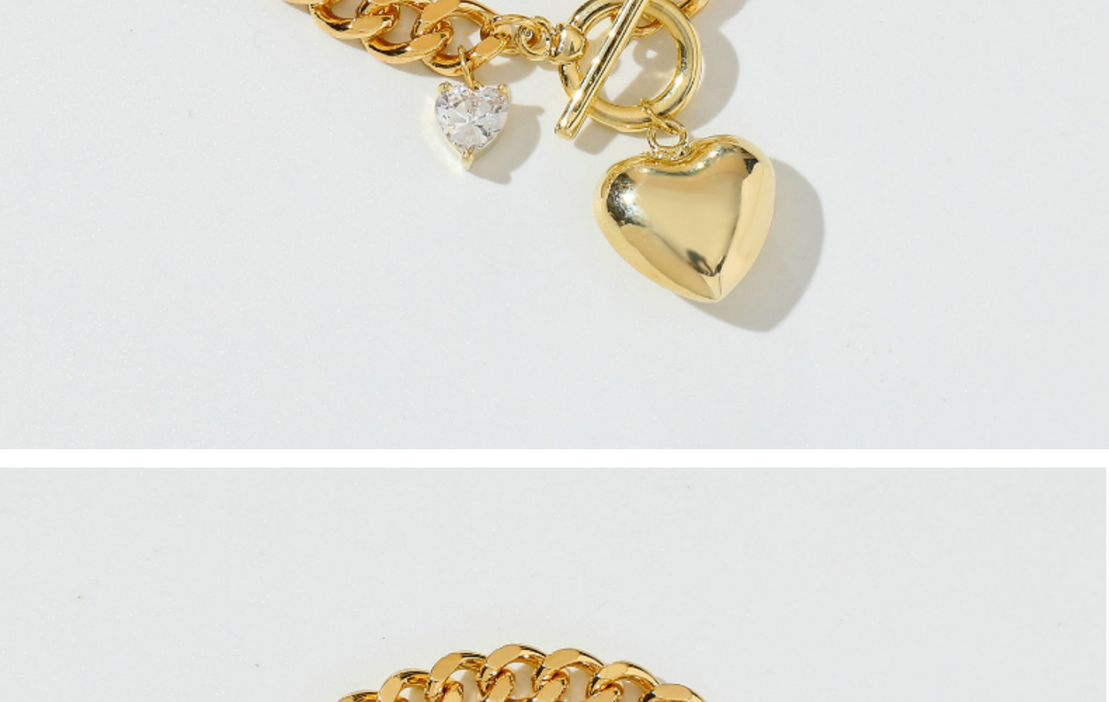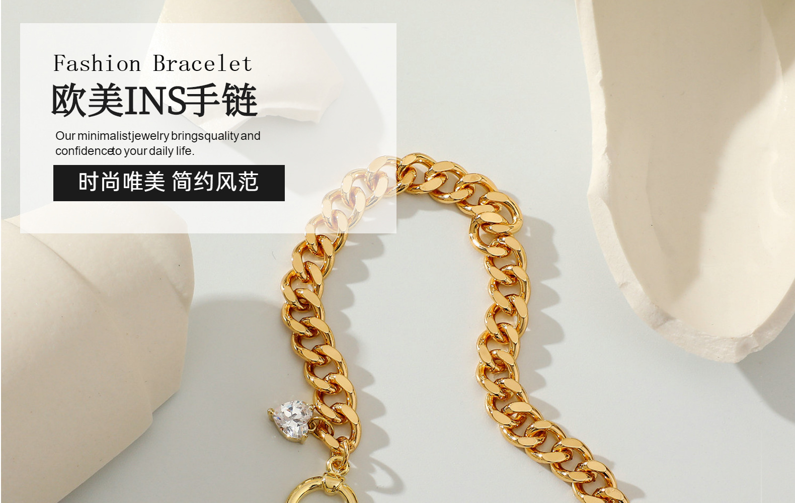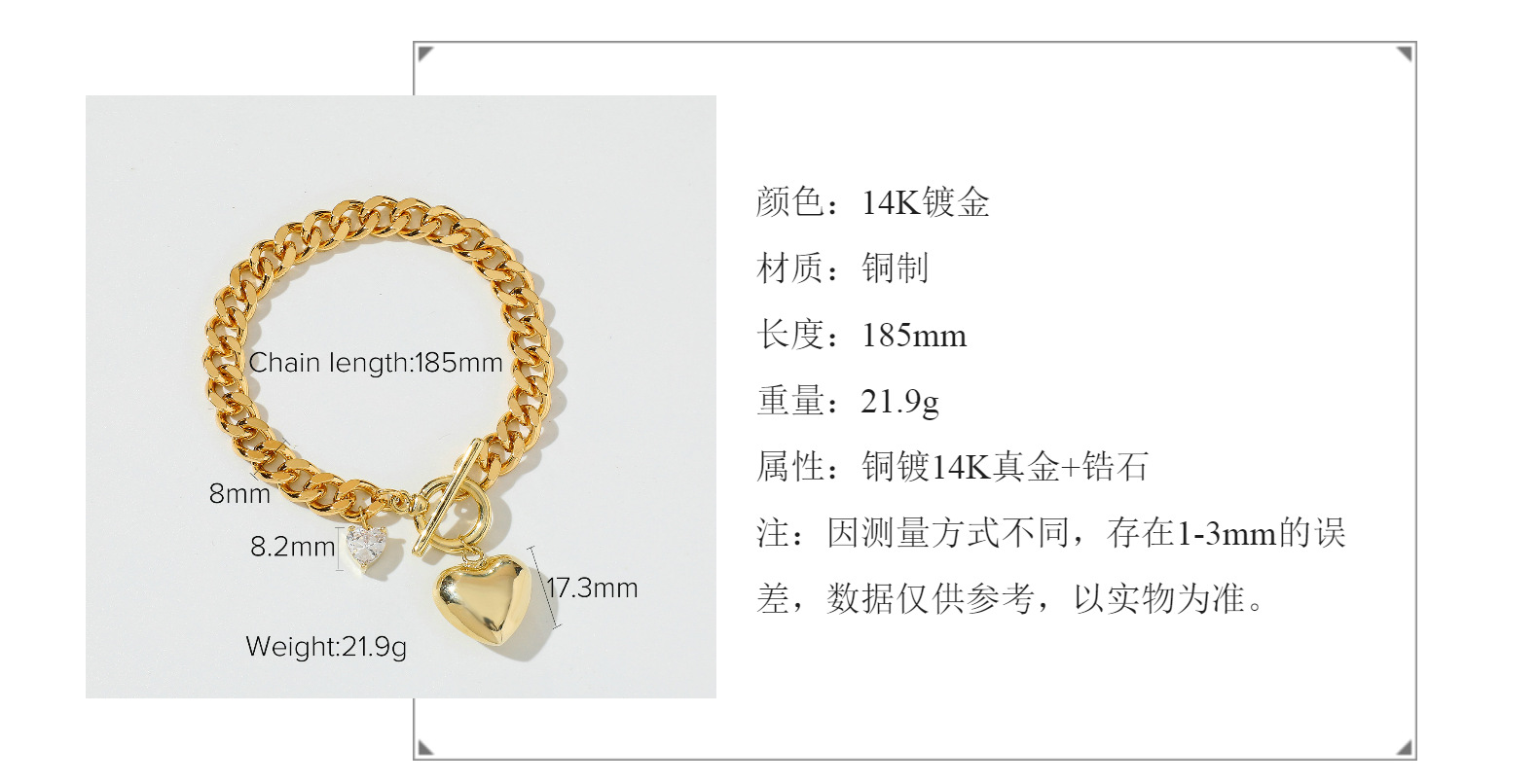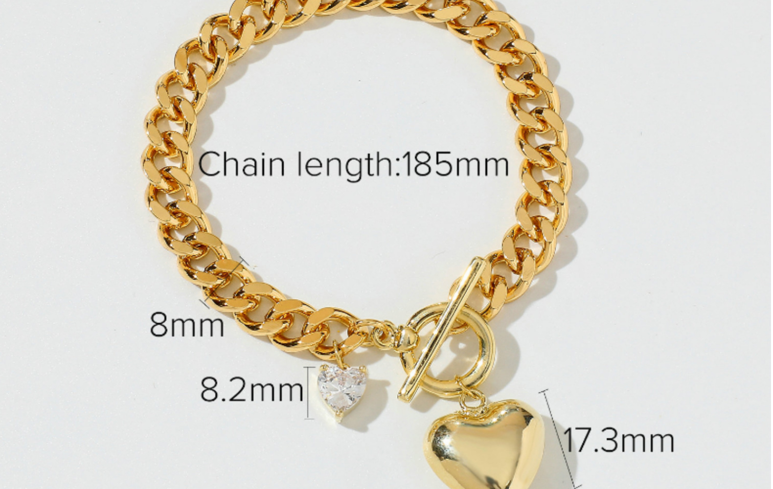 标题:时尚款古巴链镀金手链心形锆石魅力光滑女士几何心形吊坠手镯手链