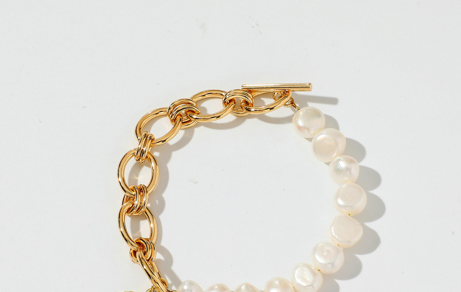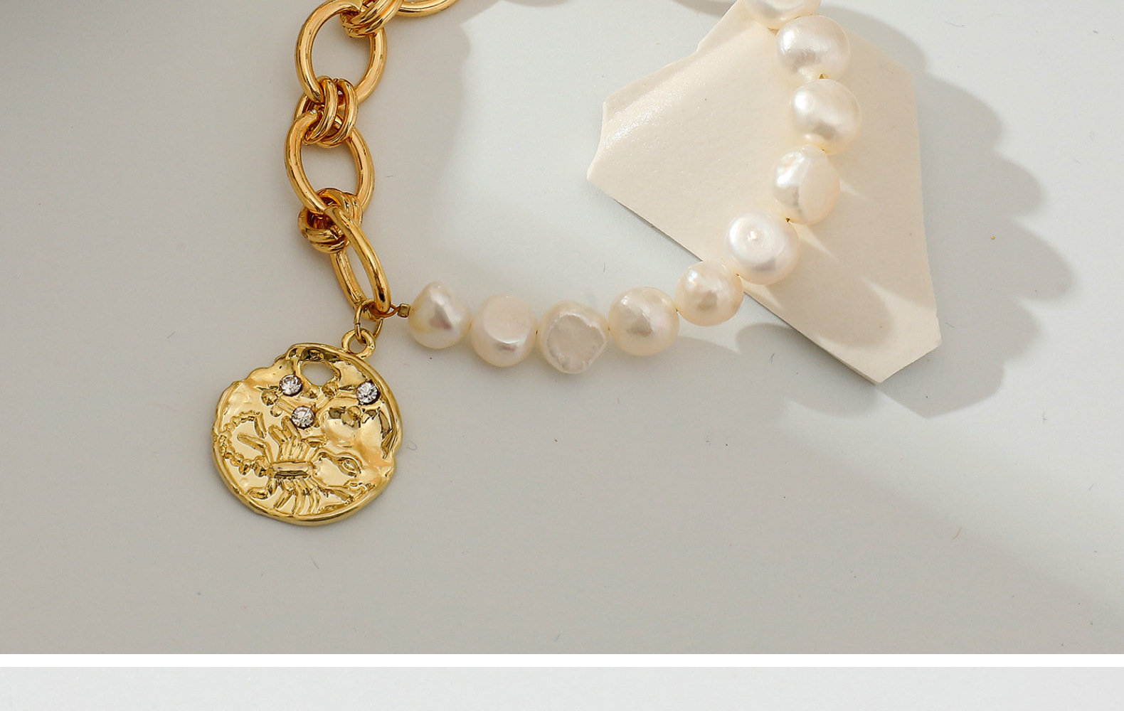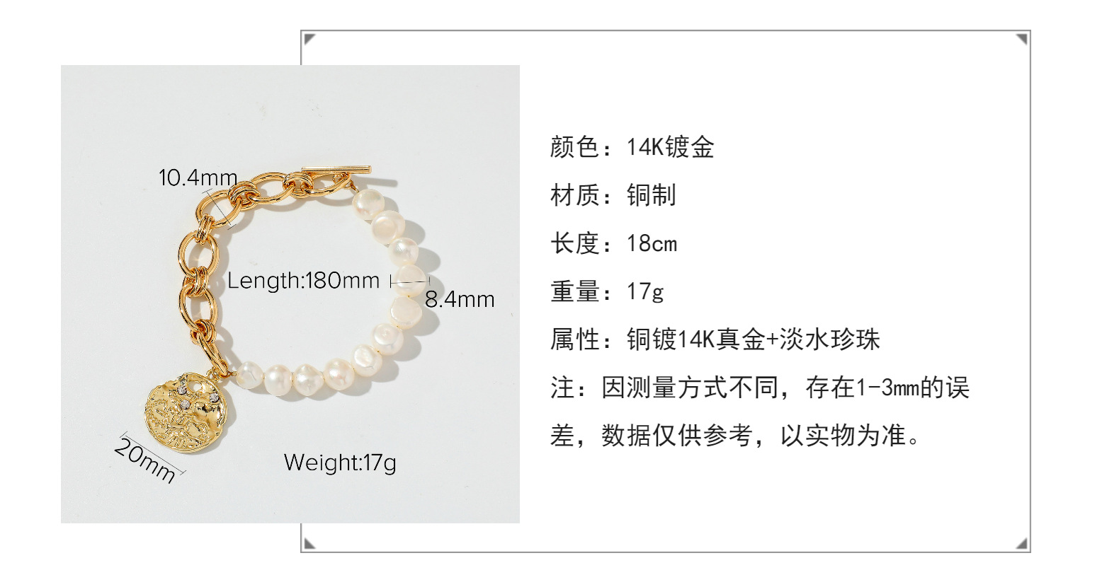 标题:时尚14K镀金链状不规则锆石铺设圆形魅力手链OT按钮淡水珍珠手链