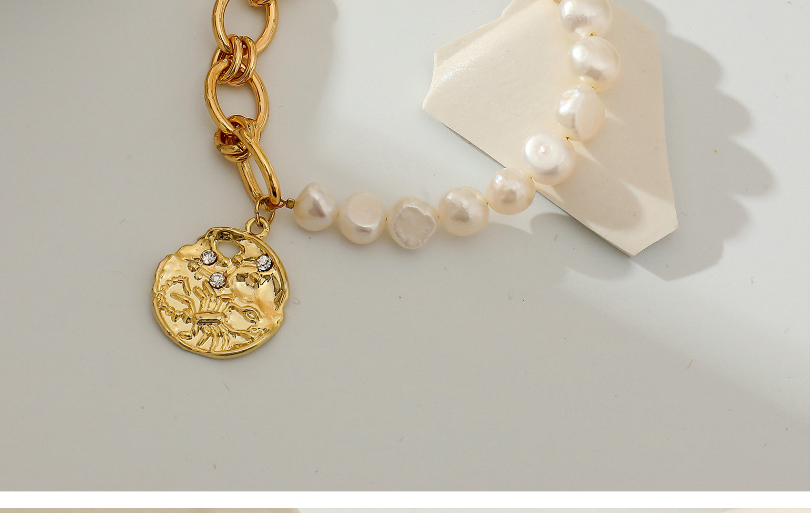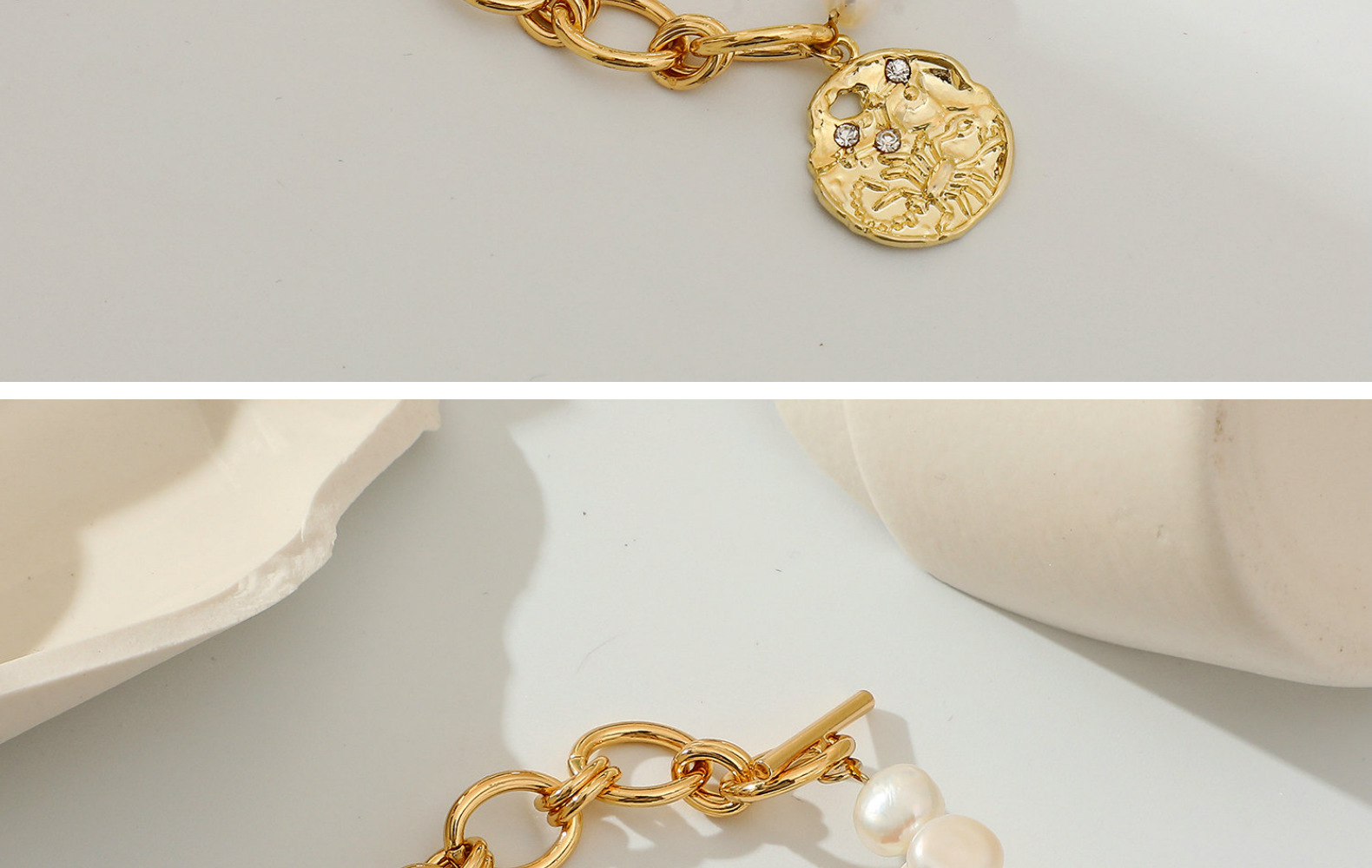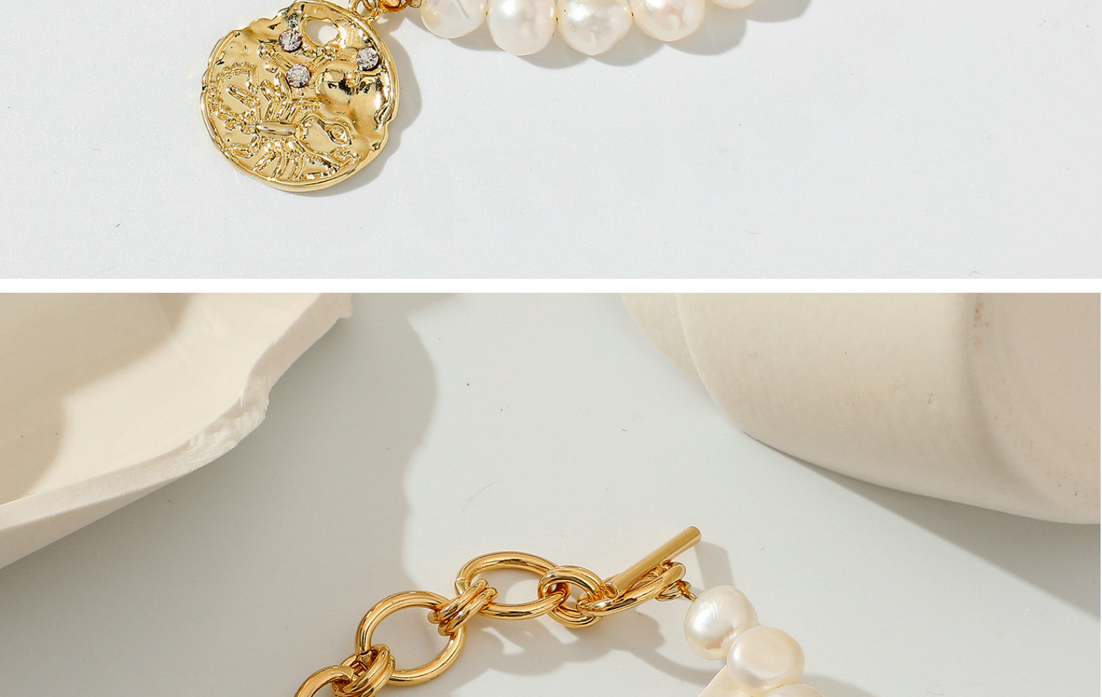 标题:时尚14K镀金链状不规则锆石铺设圆形魅力手链OT按钮淡水珍珠手链
