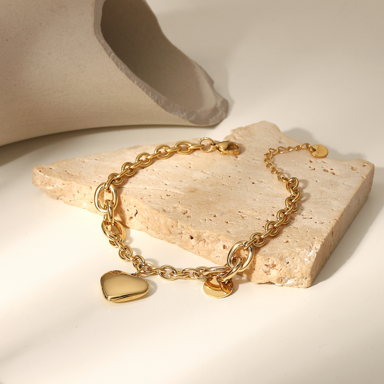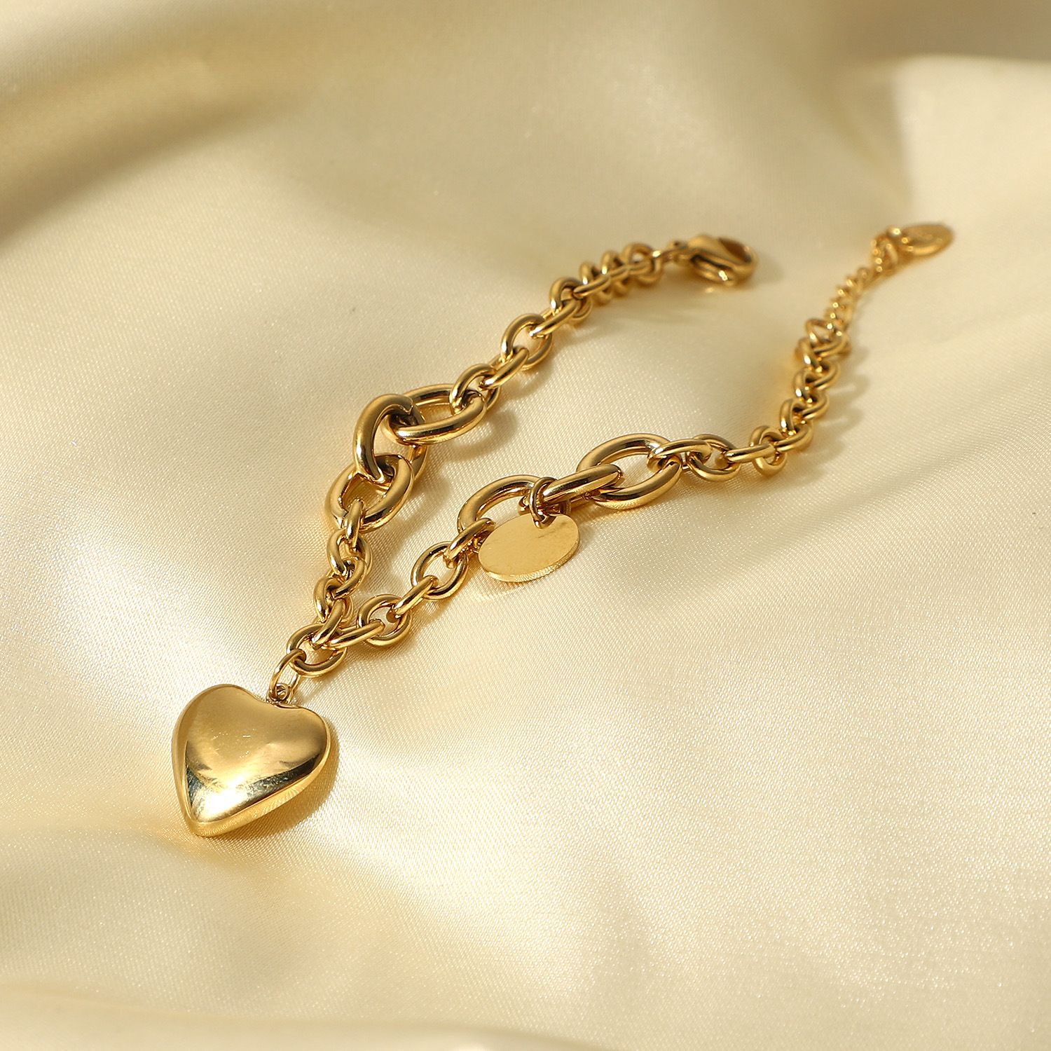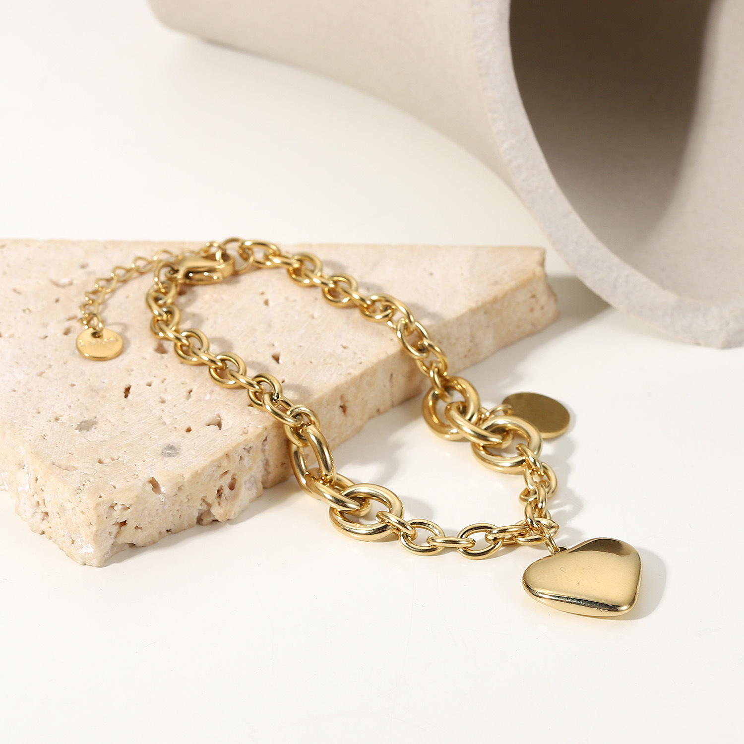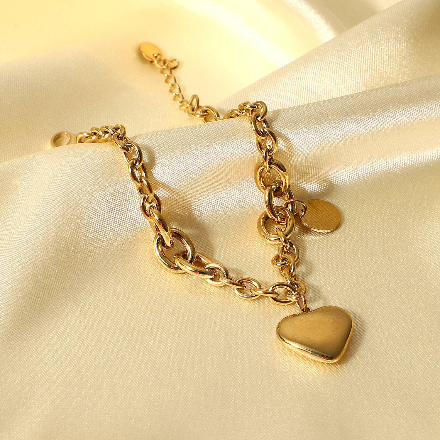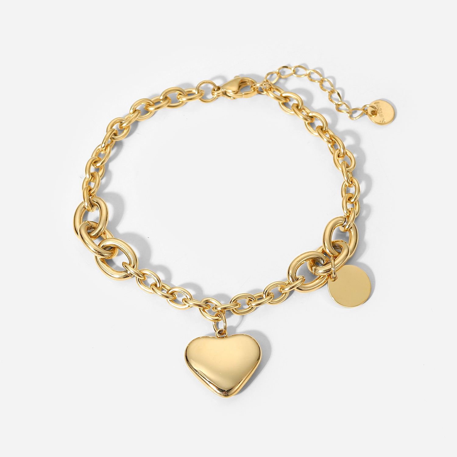 标题:新款14K金O字链相连圆牌爱心吊坠手链时尚复古风不锈钢手链手饰女