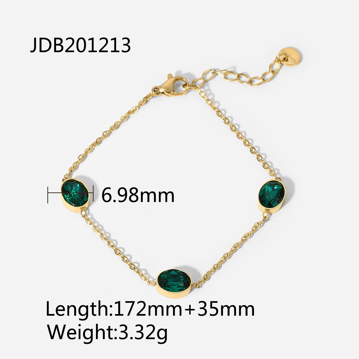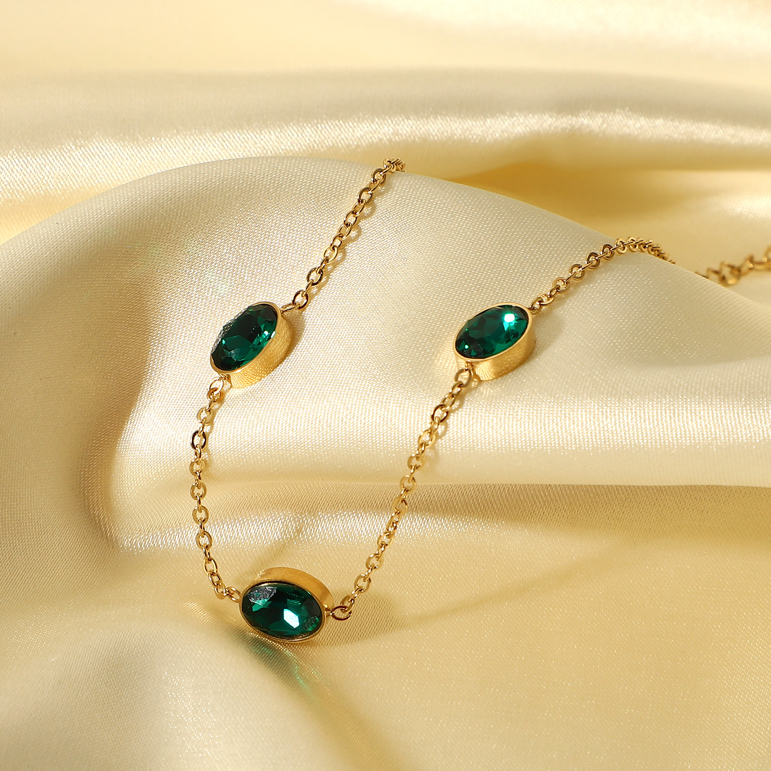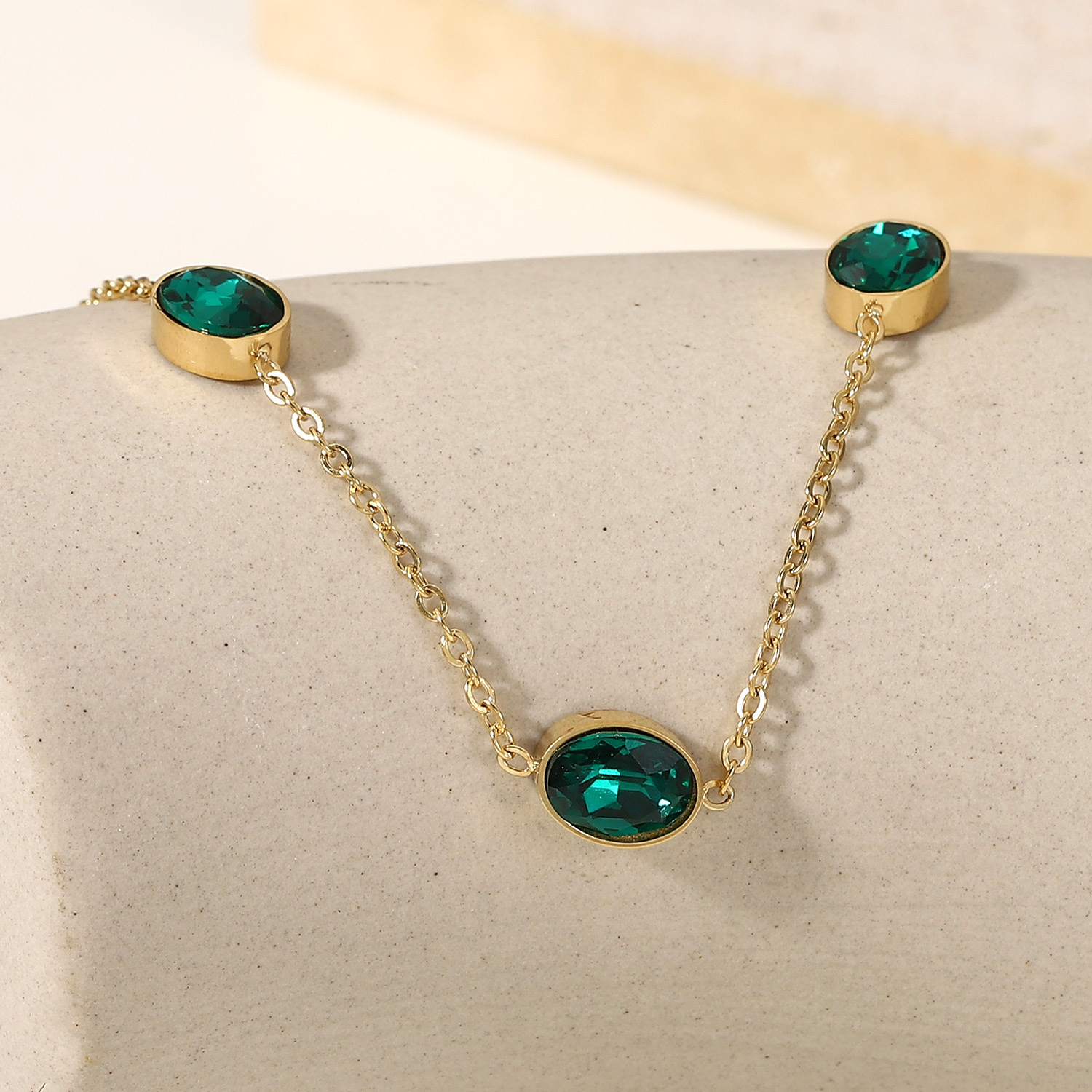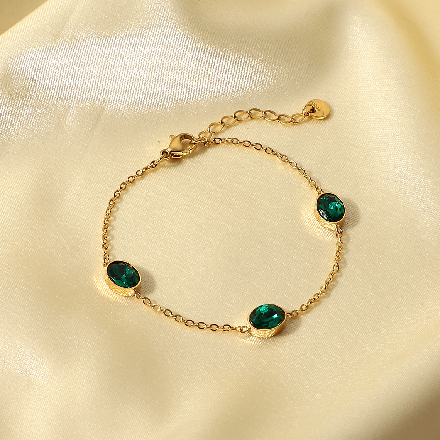 标题:欧美新款复古风椭圆绿锆石手链饰品INS时尚14K镀金不锈钢手饰女士