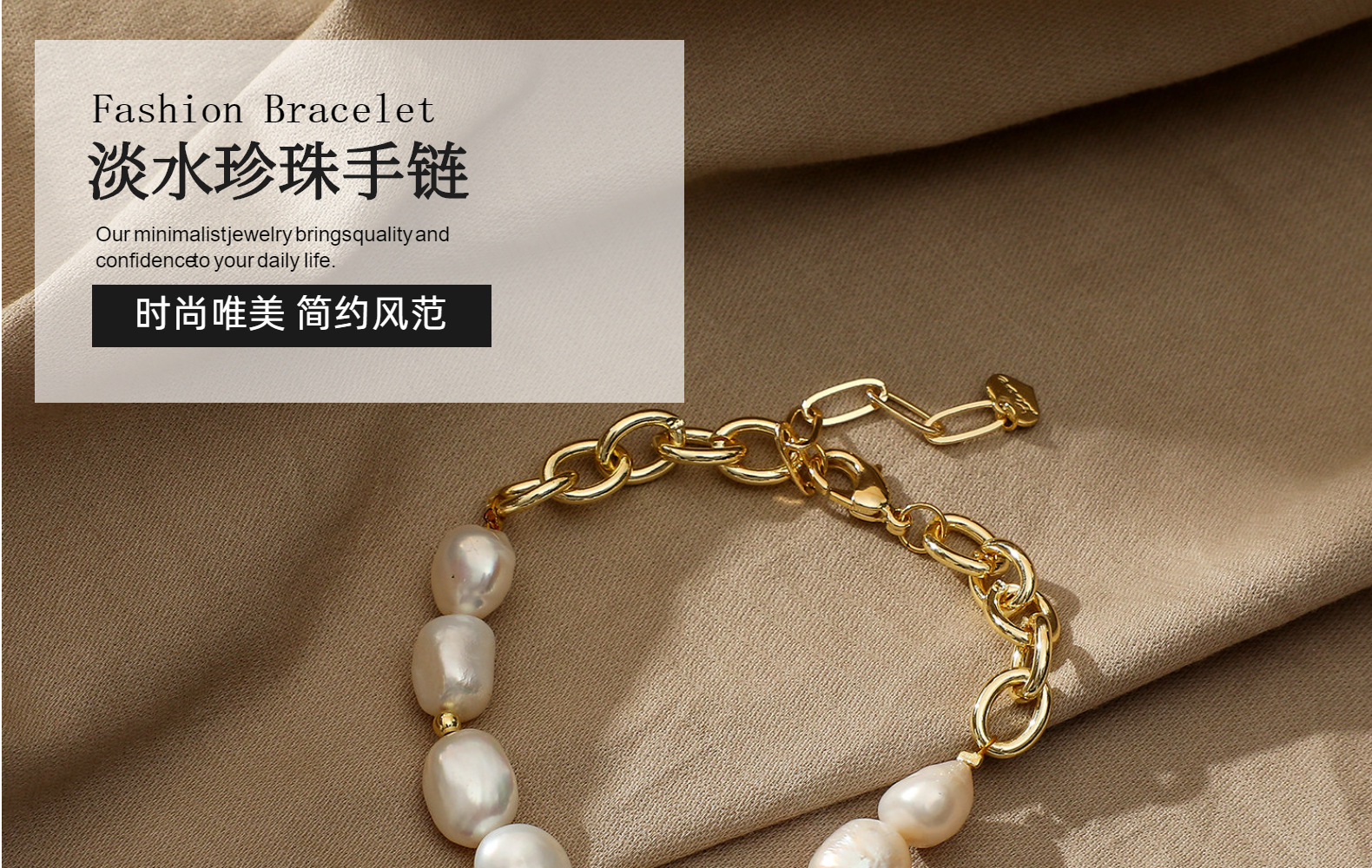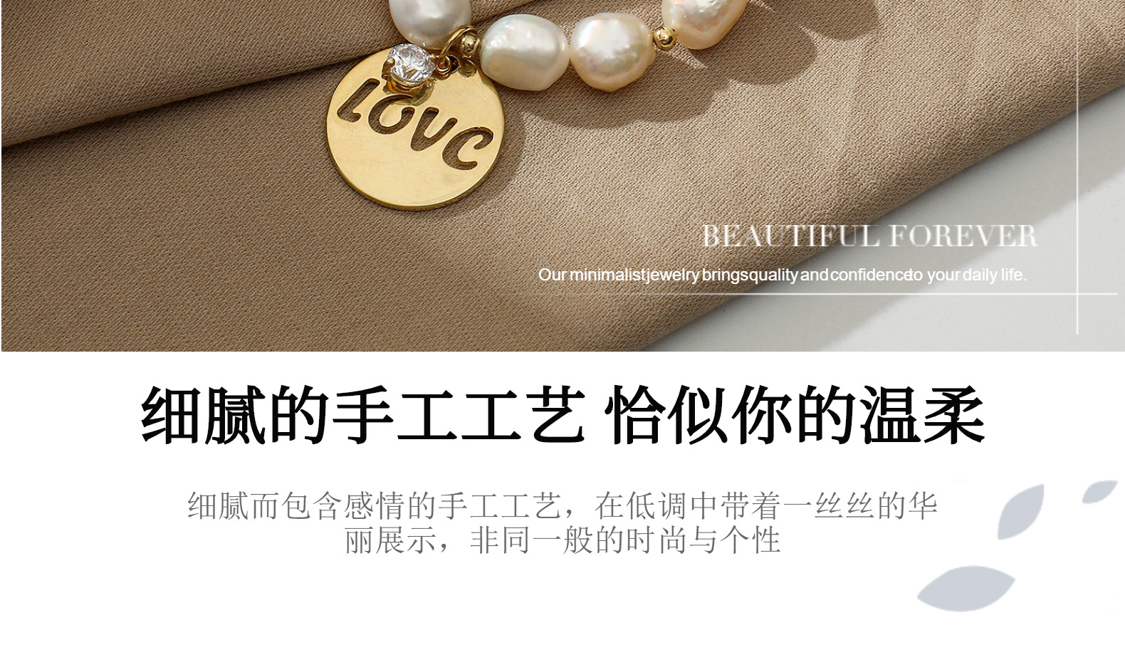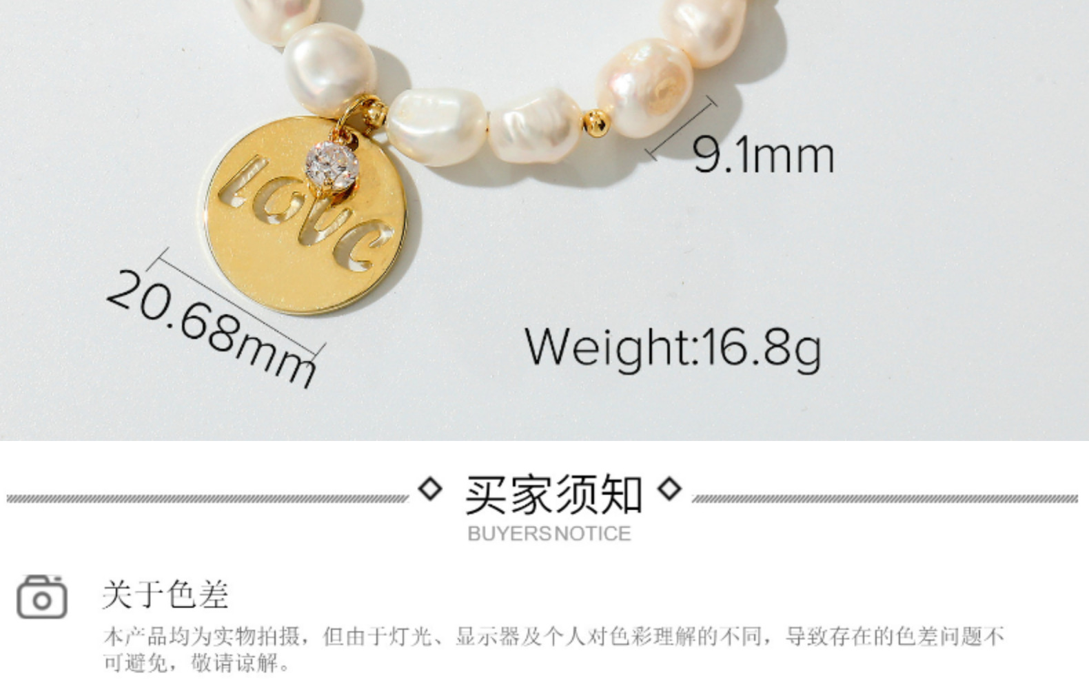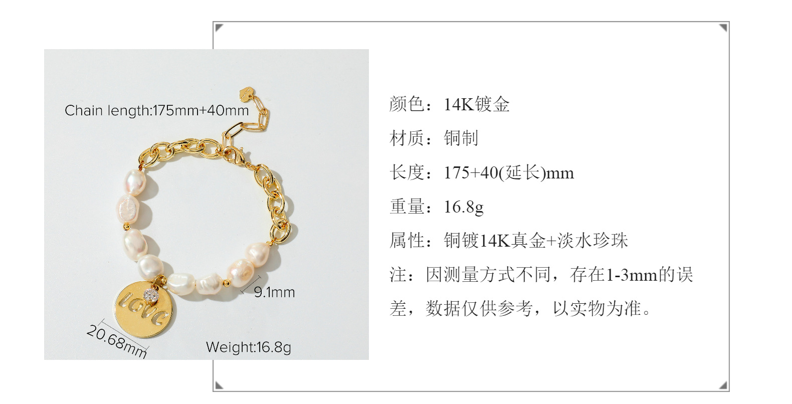 标题:欧美时尚简约女式款铜镀真金爱情坠饰手链锆石小饰物淡水珍珠手链