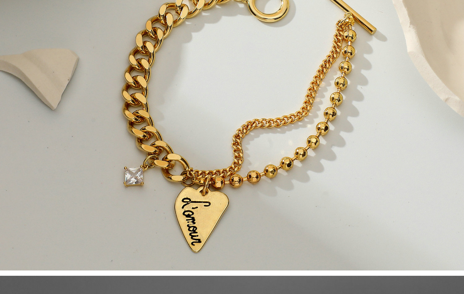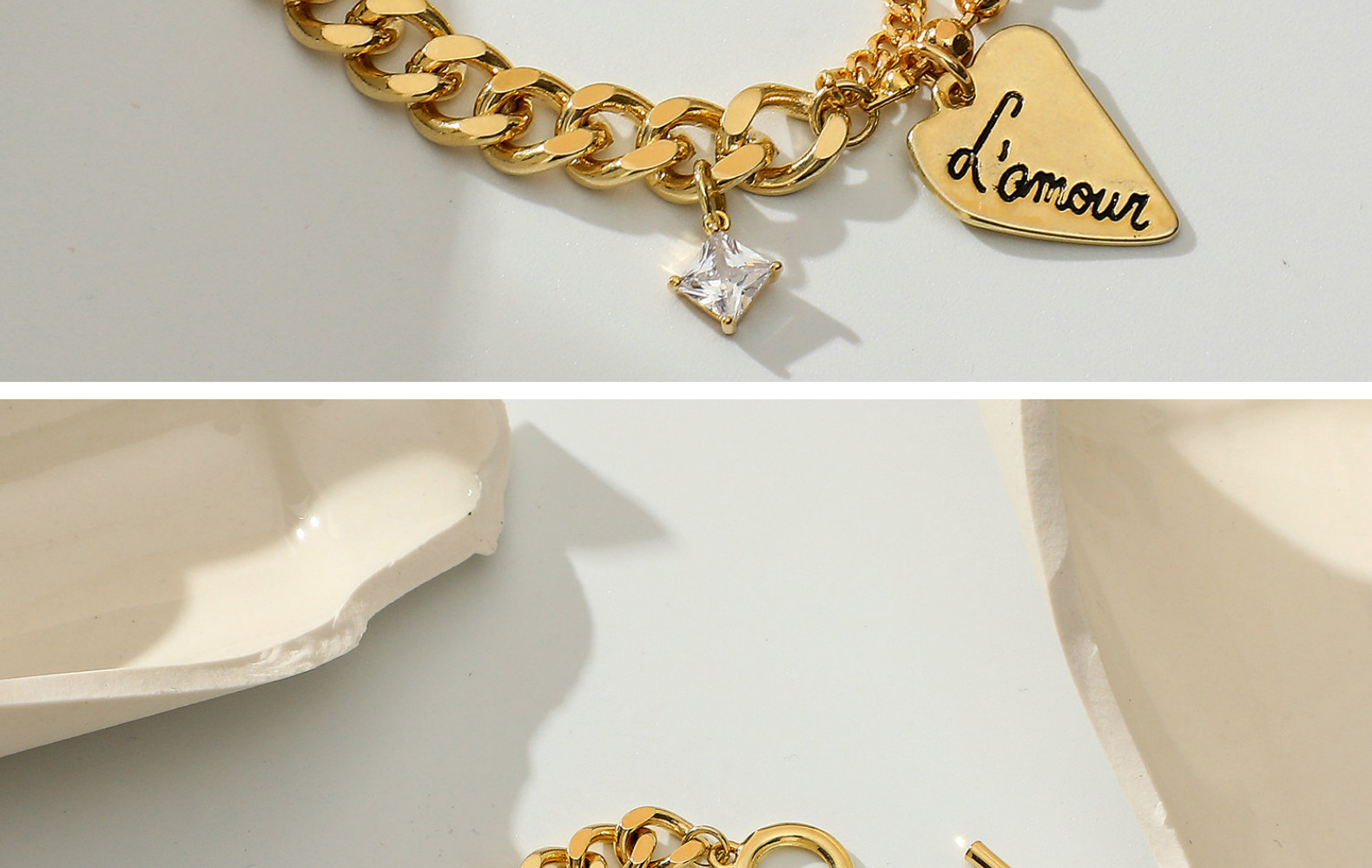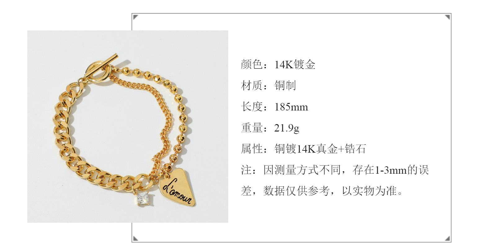 标题:8mm宽14K镀金古巴链圆形珠子链手链方形锆石吊饰字母雕花心形手链