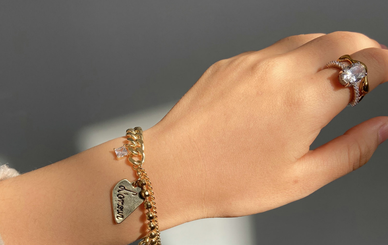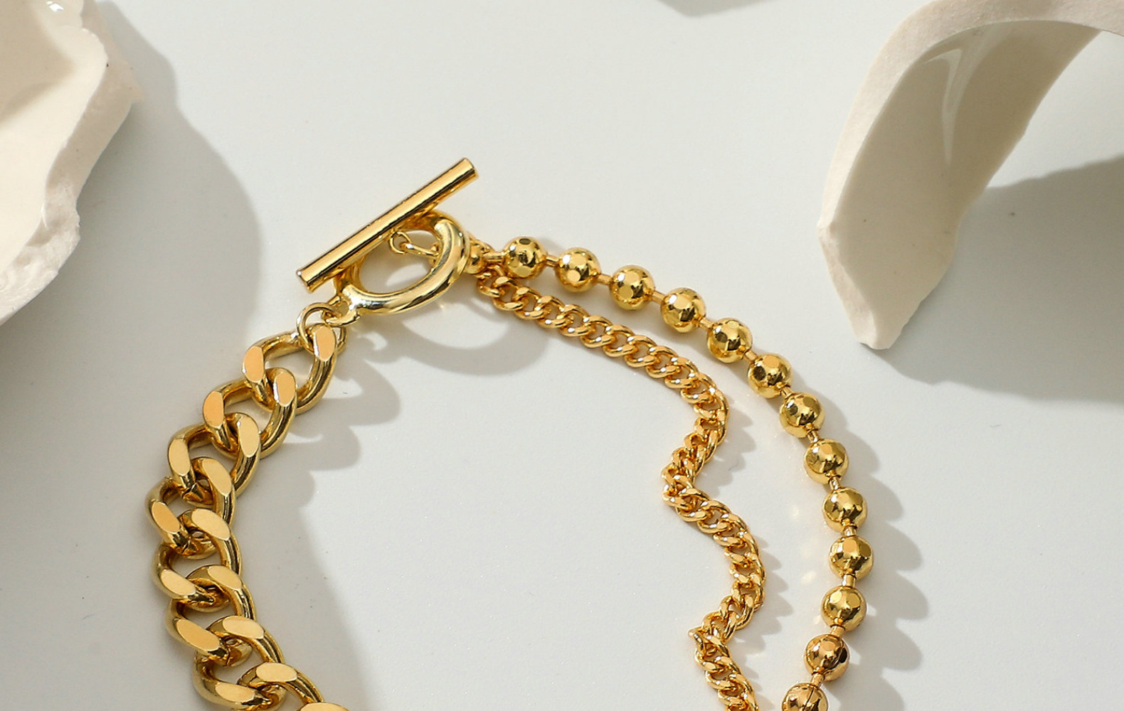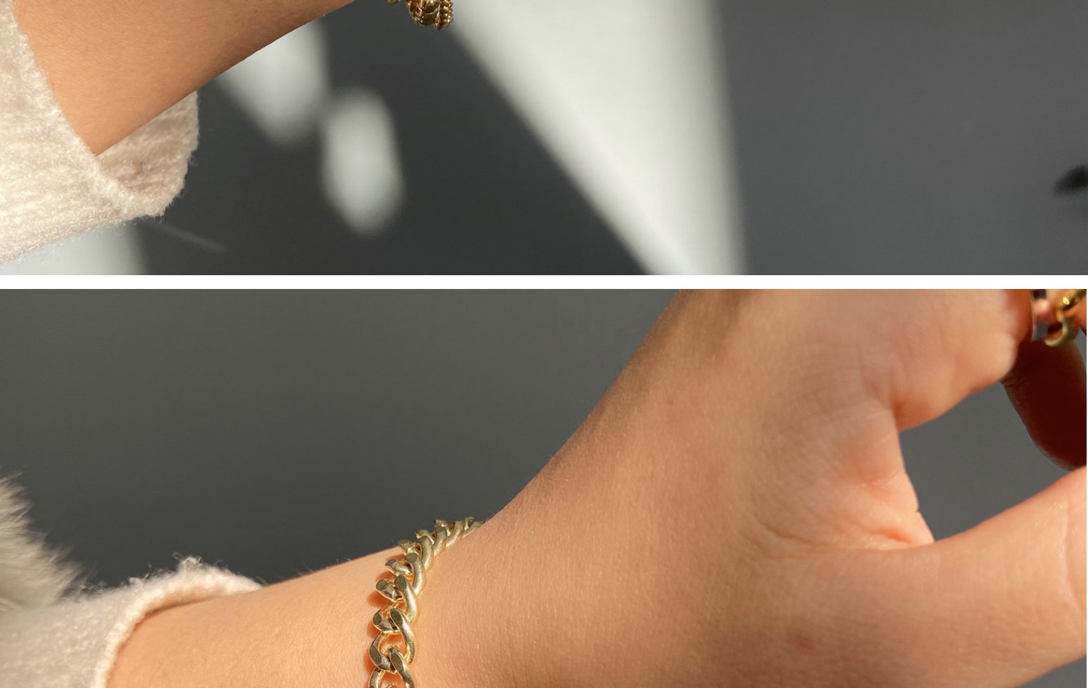 标题:8mm宽14K镀金古巴链圆形珠子链手链方形锆石吊饰字母雕花心形手链