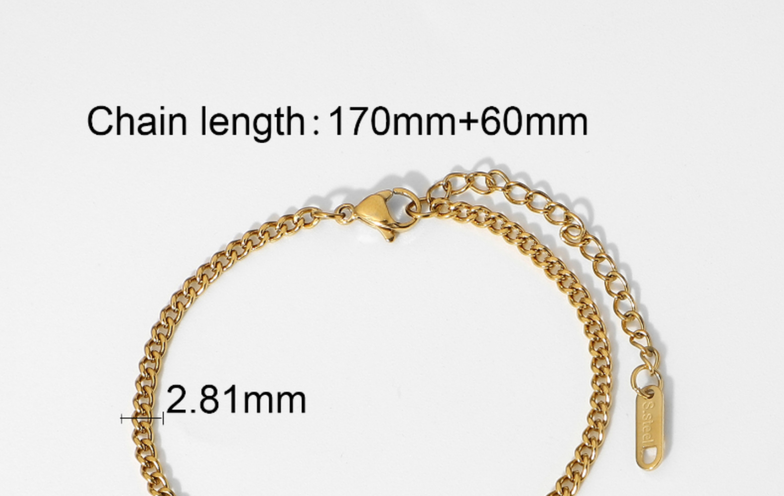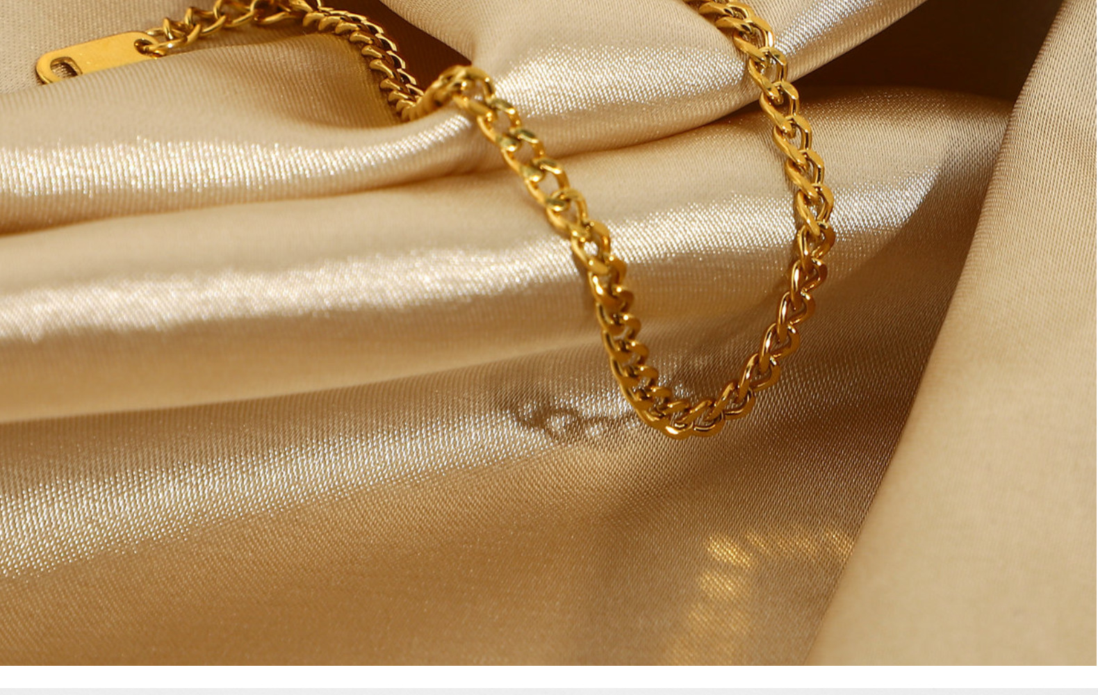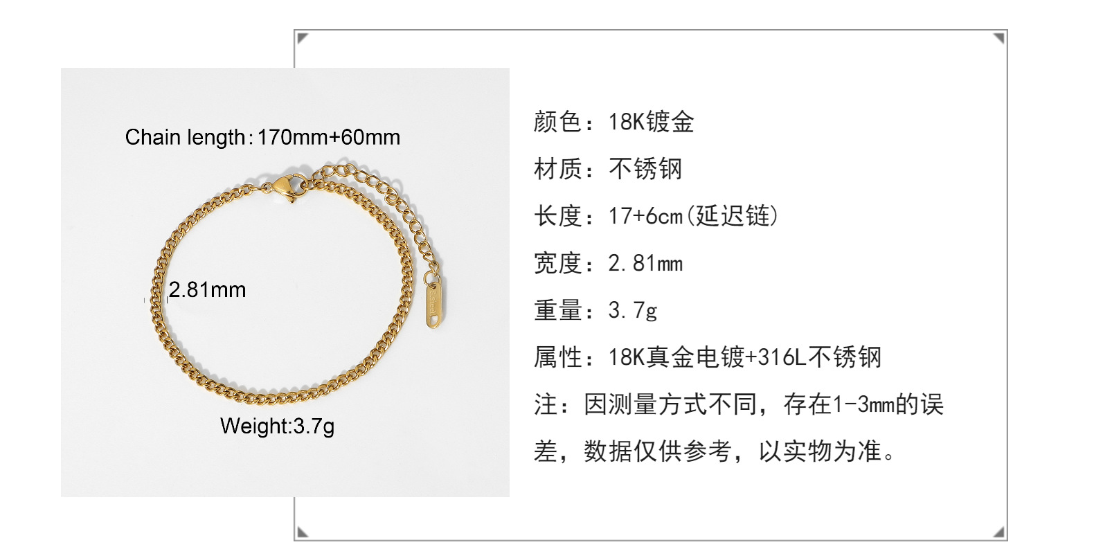 标题:3mm小号经典金质路缘链手链别致真空电镀18K镀金不锈钢古巴链手链
