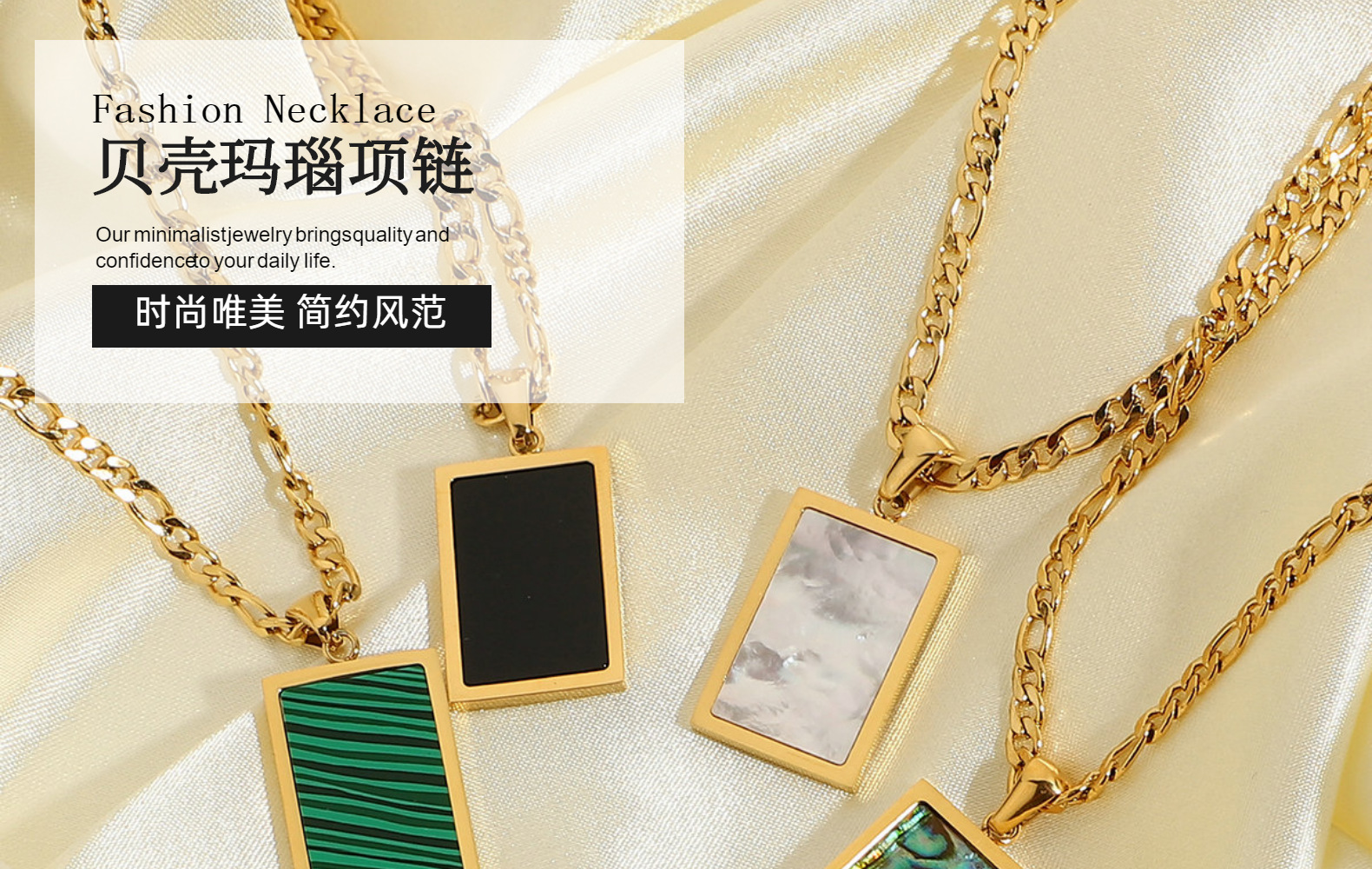 标题:欧美ins饰品矩形鲍鱼孔雀石玛瑙贝壳吊坠项链 不锈钢电镀锁链项链