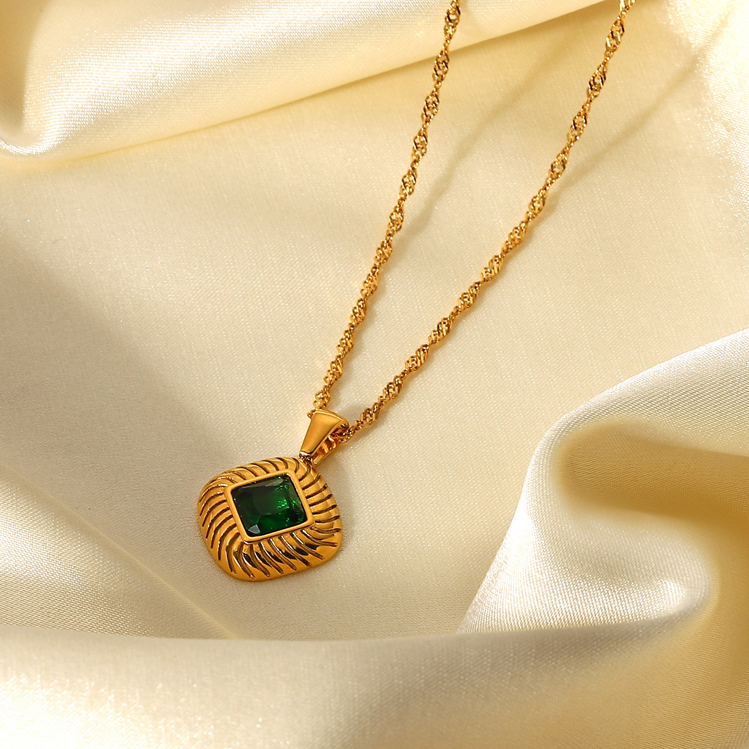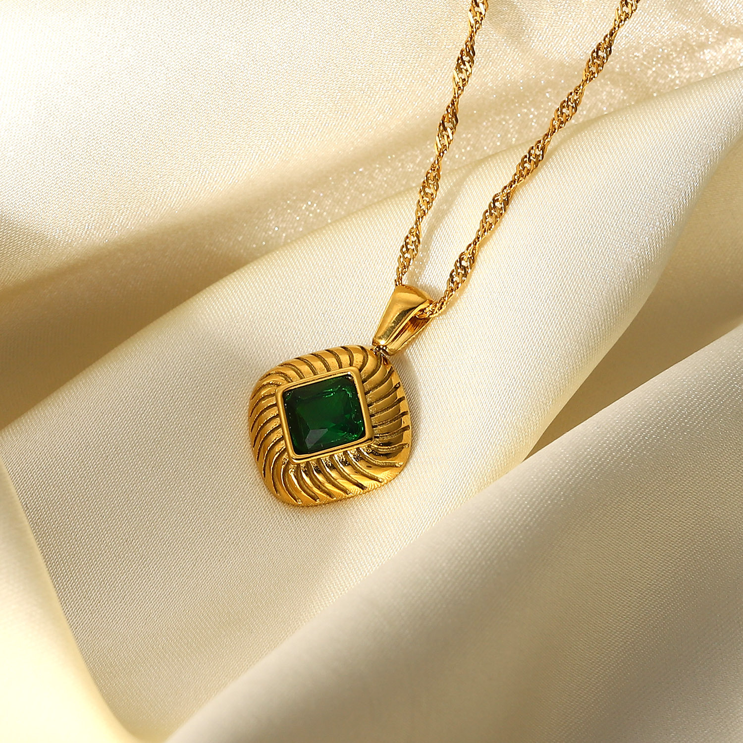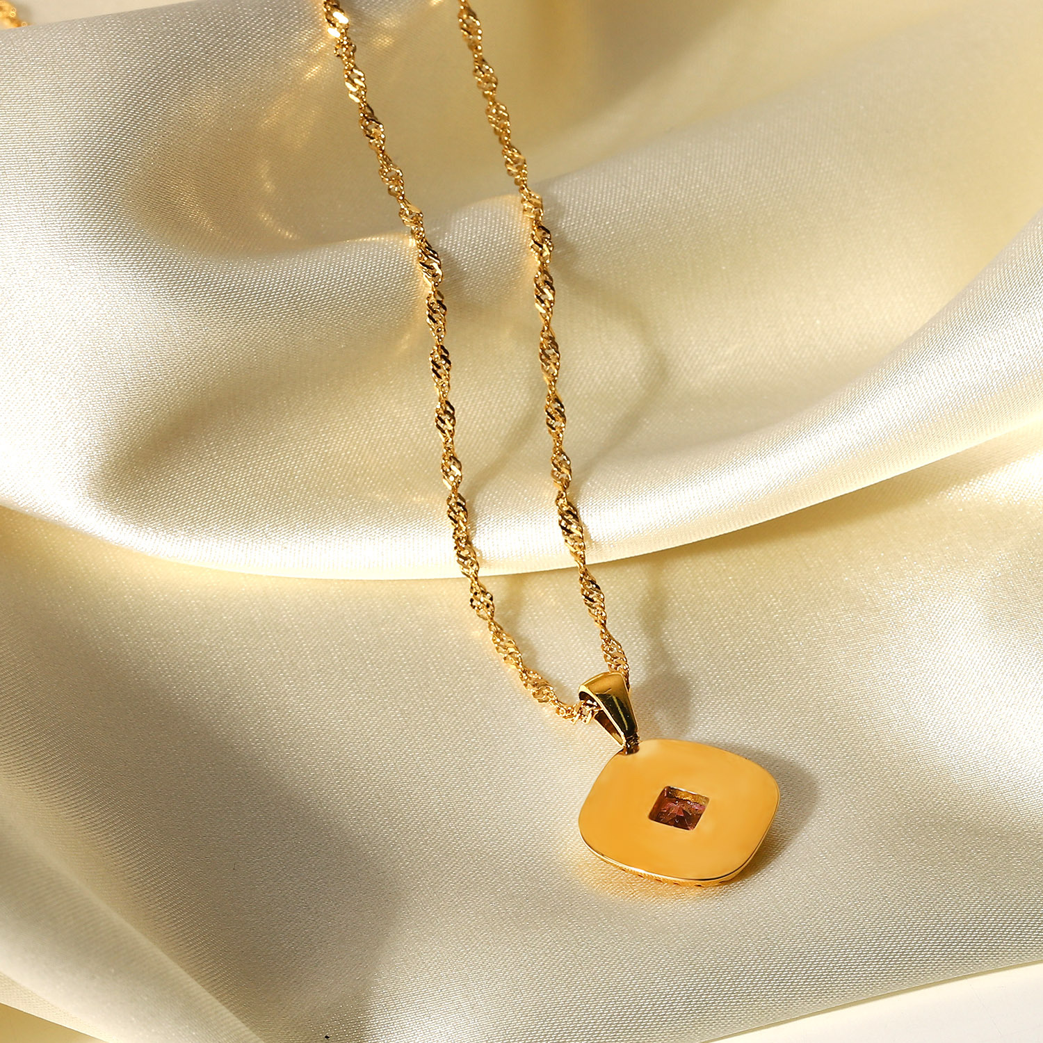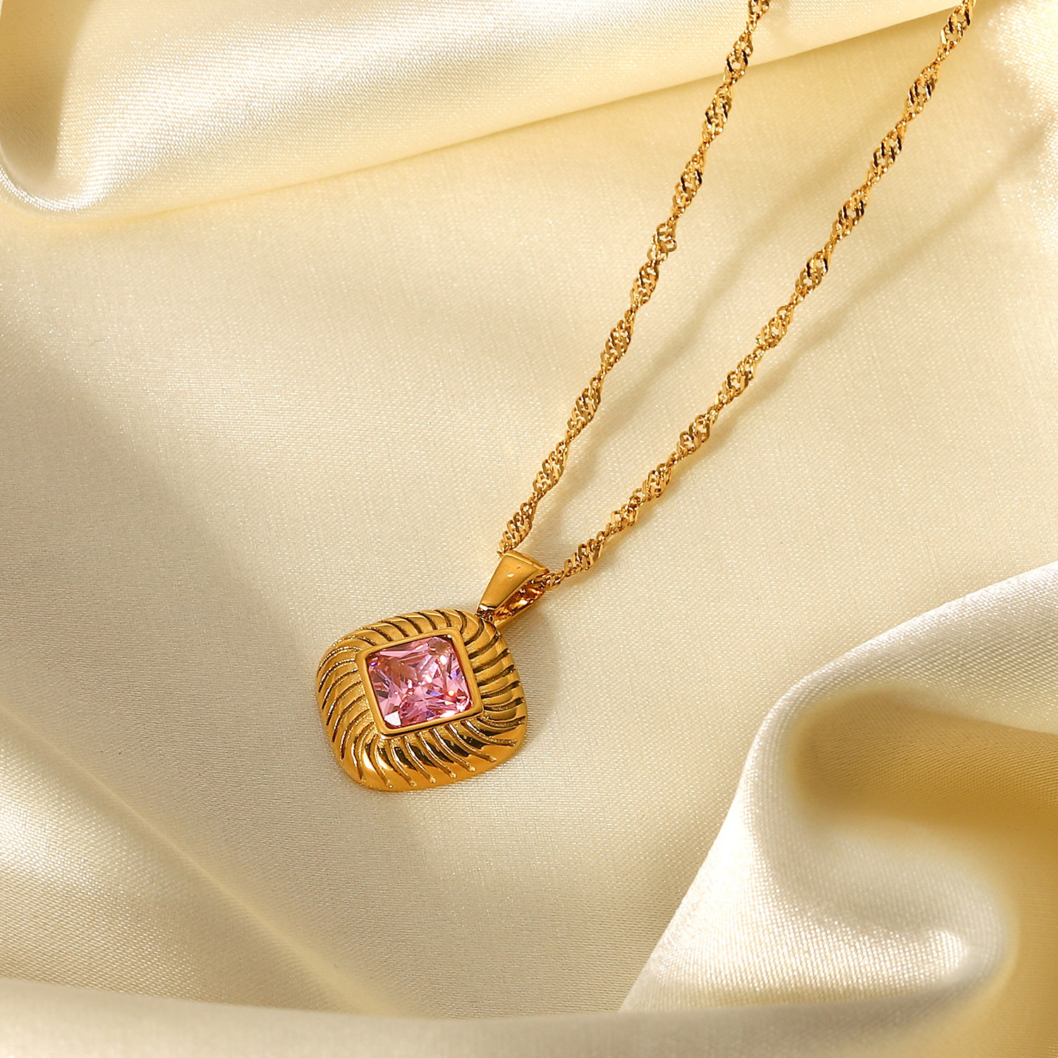标题:INS风新款不锈钢项链18K金方形罗纹纽扣白/粉/绿色锆石吊坠项链女