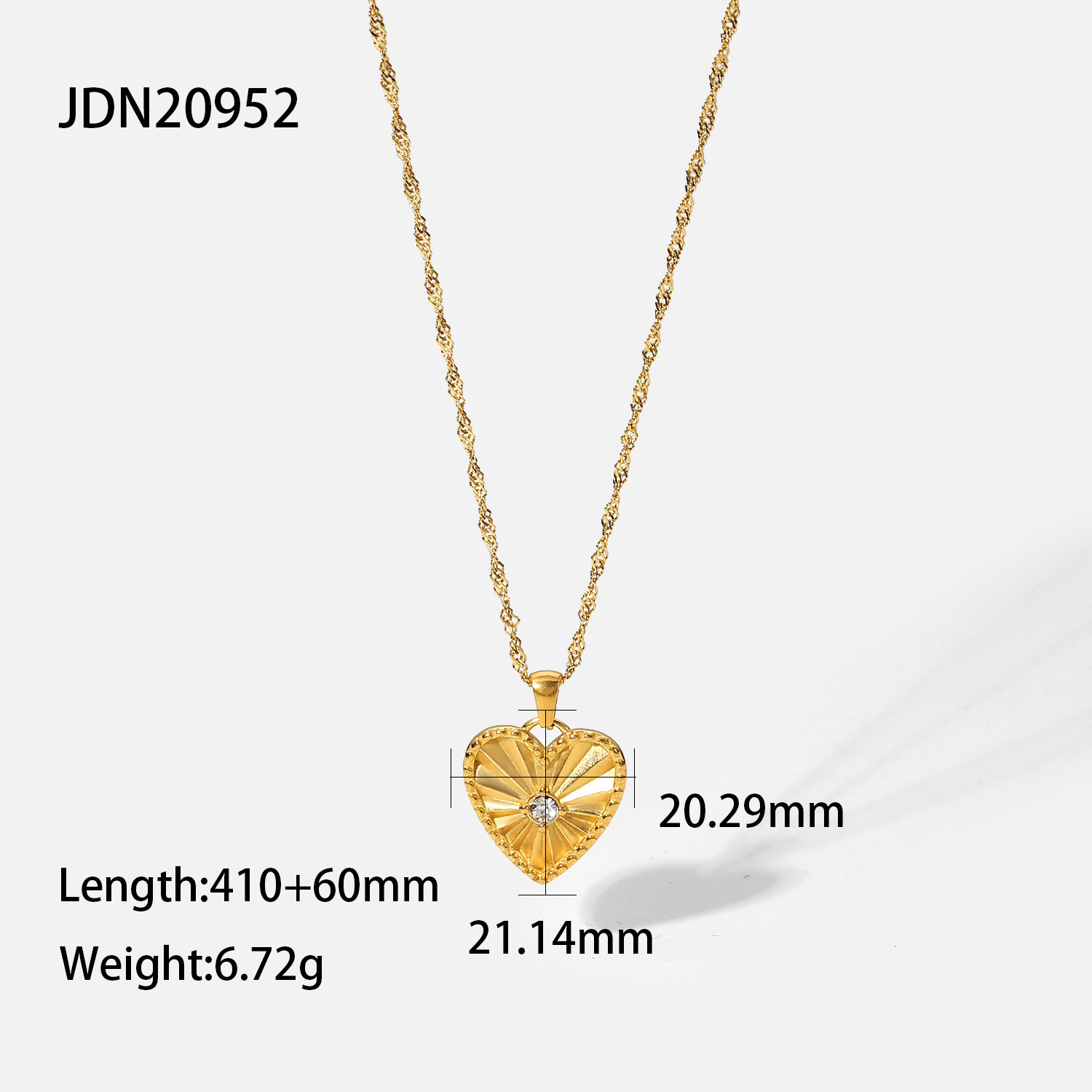 描述:风格:欧美,材质:不锈钢,处理工艺:电镀,品牌:Youthway,生产编号:JDN20952,销售序列号:JDN20952,种类:项坠、吊坠,样式:女式,造型:项链,包装:独立包装,适用送礼场合:婚庆,旅游纪念,员工福利,加工定制:是,货号:JDN20952,产地:浙江义乌,链子样式:常规链,是否多层:是,是否带坠:是,延长链:10cm以下,坠子材质:钛钢,周长:21cm(含)-50cm(含),系列:不锈钢,形象:切面折射镶锆心形吊坠项链,主要下游平台:淘宝,京东,ebay,PDD,亚马逊,wish,快手,LINIO,SHEIN,速卖通,天猫,独立站,LAZADA,拼多多,shopee,抖音,垂类电商,颜色:JDN20952,主要销售地区:非洲,欧洲,南美,东南亚,北美,东北亚,中东,有可授权的自有品牌:是,是否跨境出口专供货源:是,流行元素:金属,爱心,链条,几何,上市年份/季节:2022年春季,