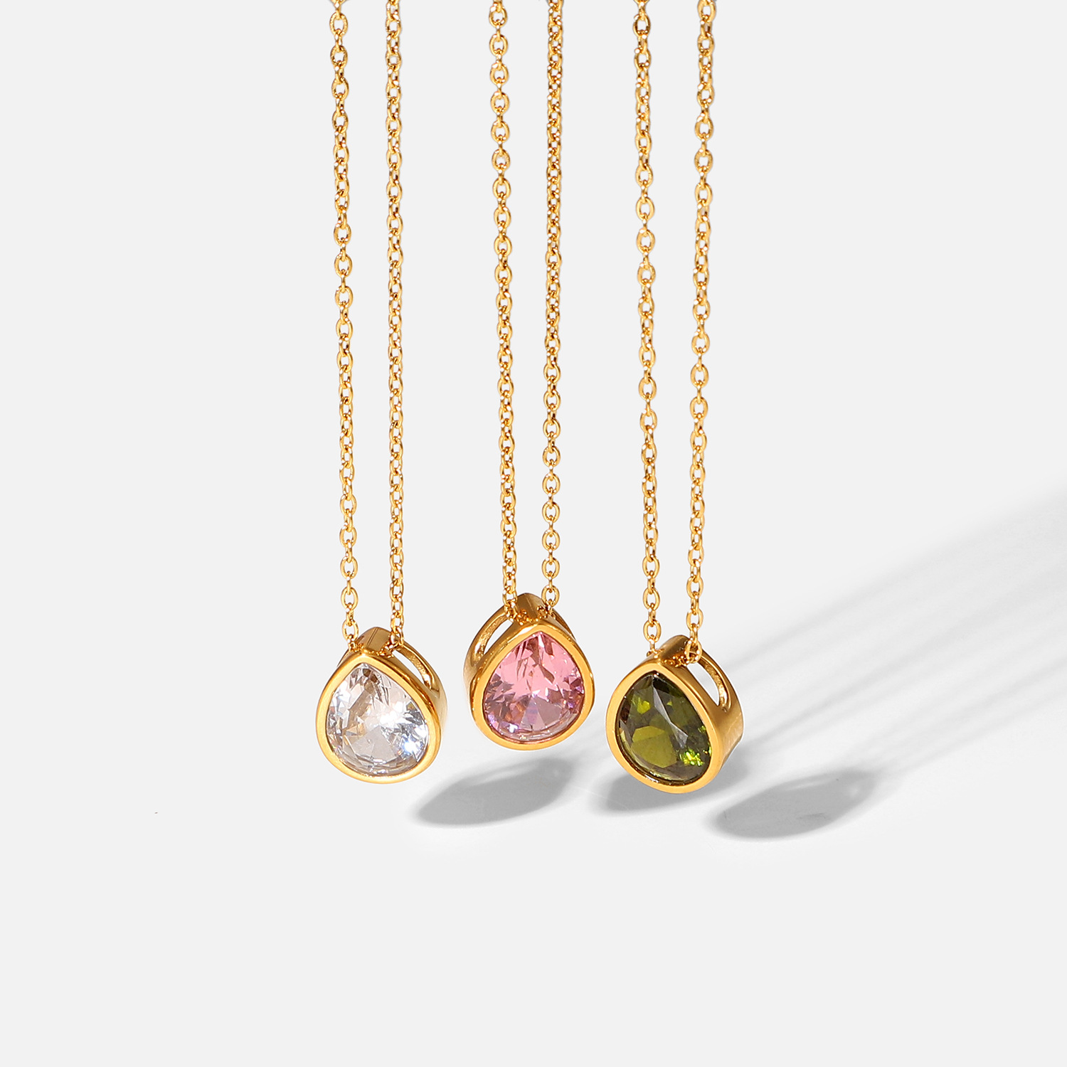 标题:浪漫水滴型白/粉/绿色锆石吊坠项链18K金不锈钢项链首饰女士饰品