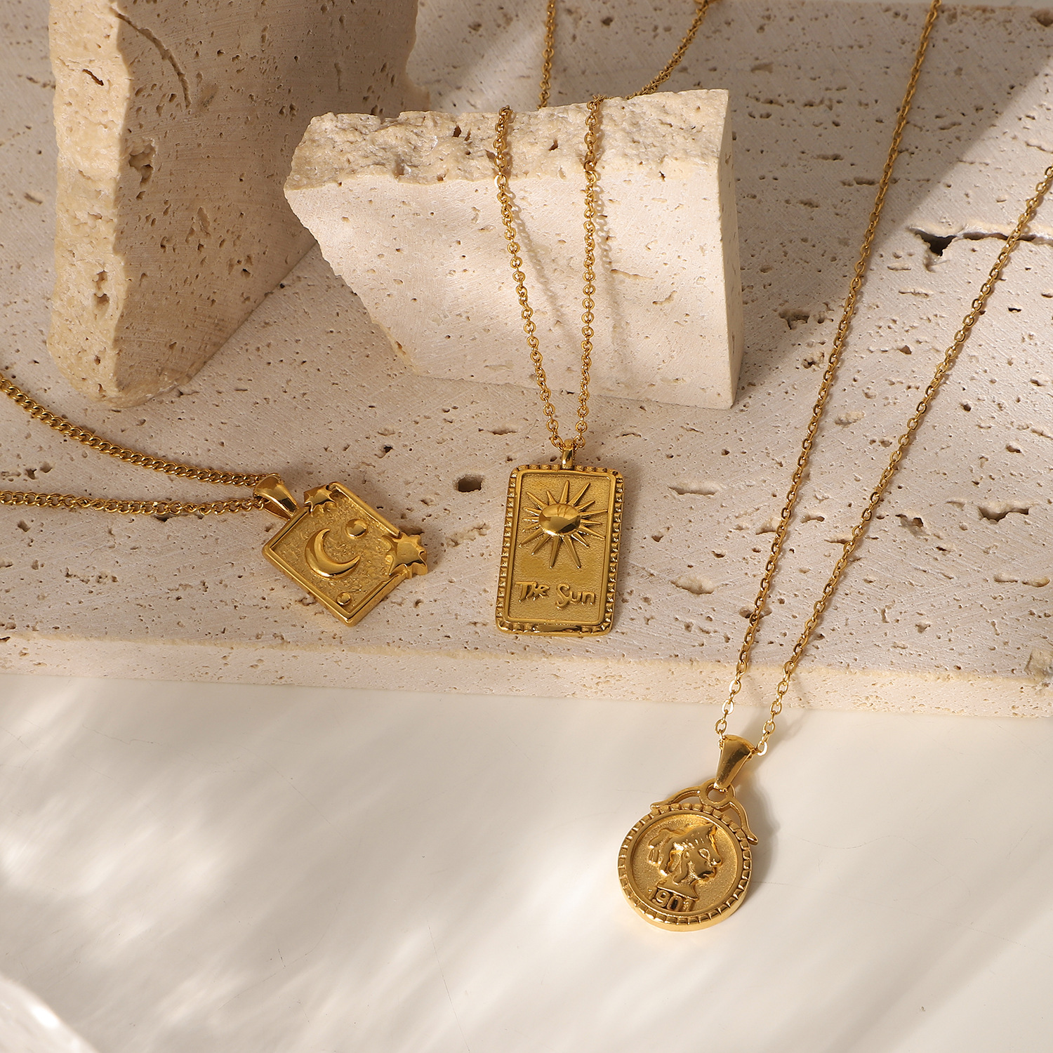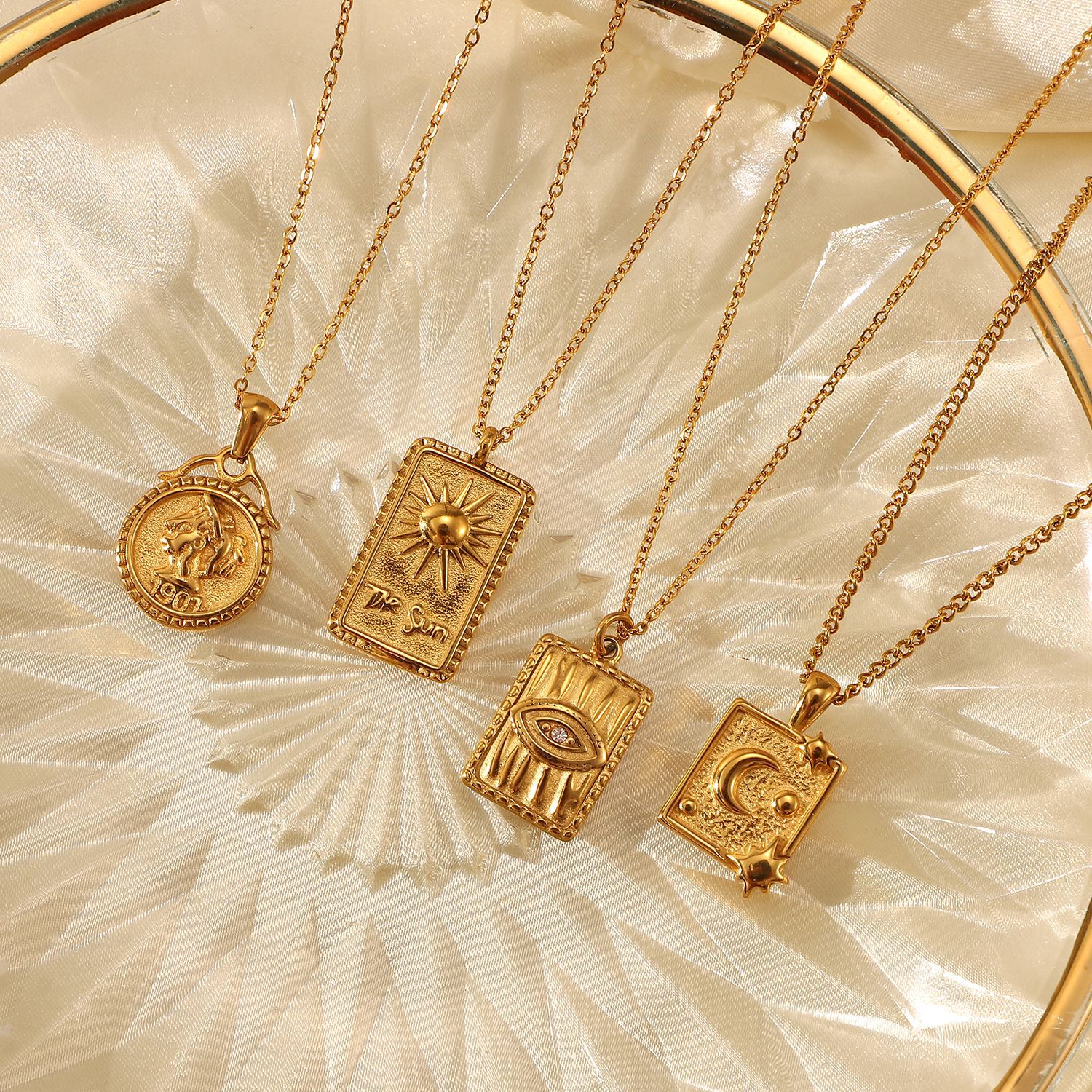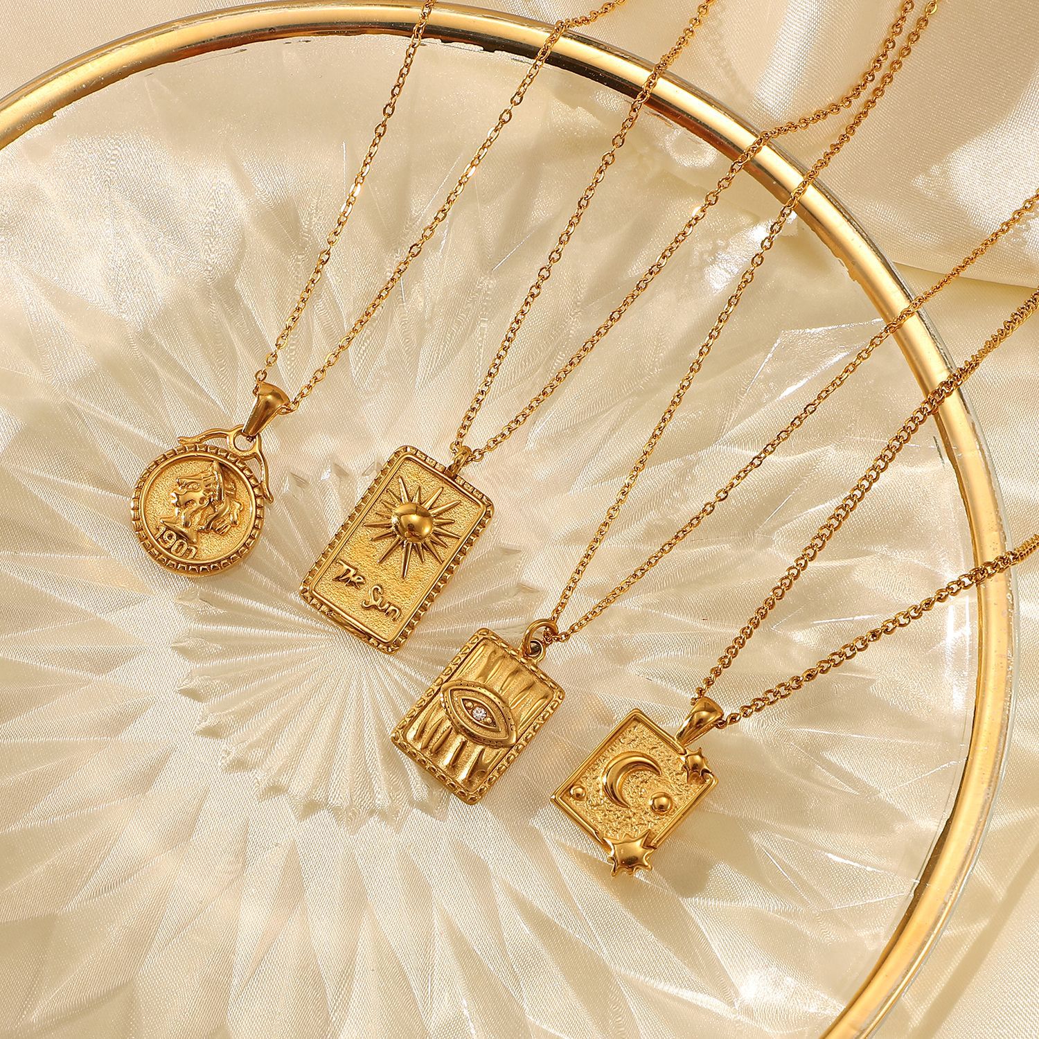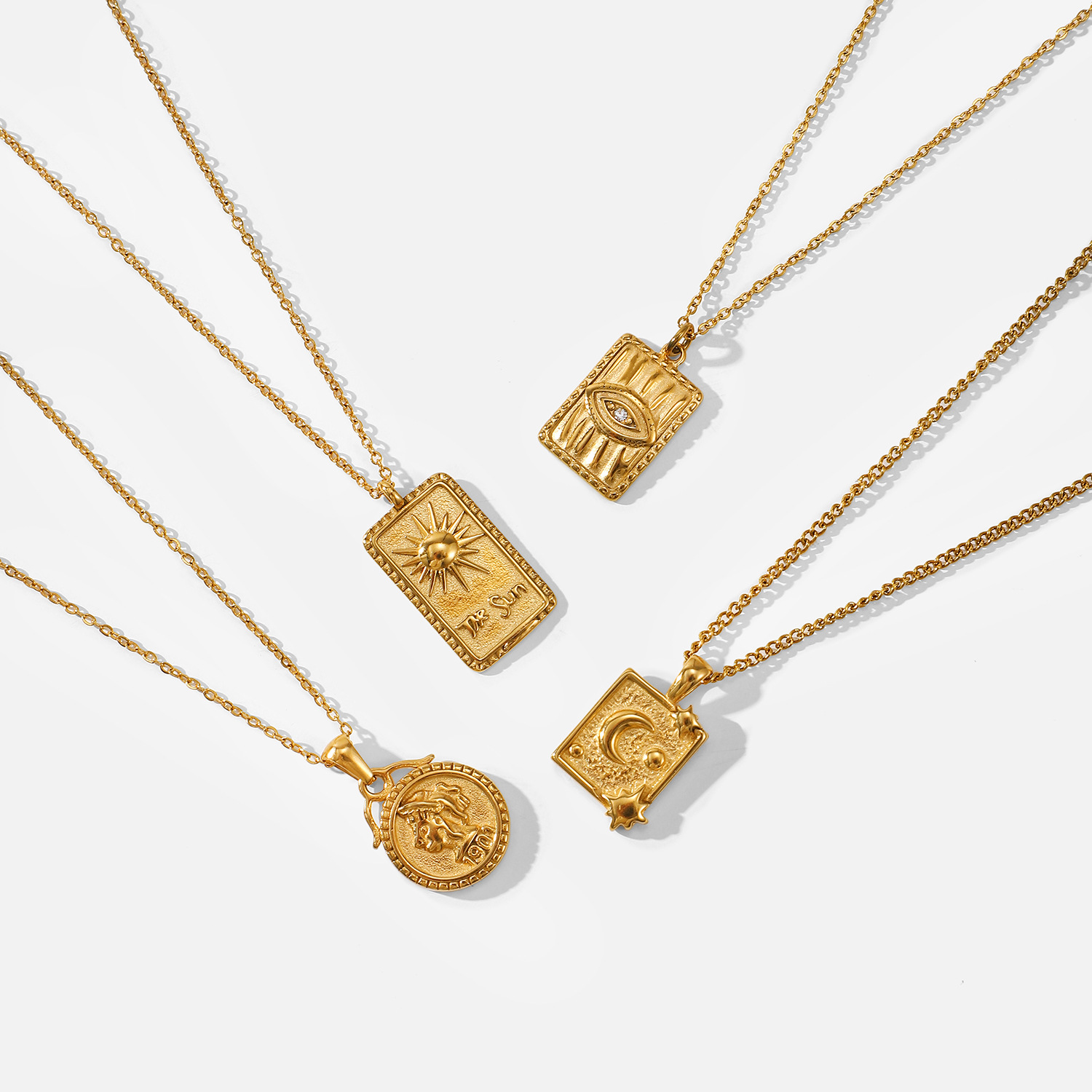 标题:18k镀金不锈钢首饰派对礼物月亮阳光压纹钻石眼睛方形吊坠项链女