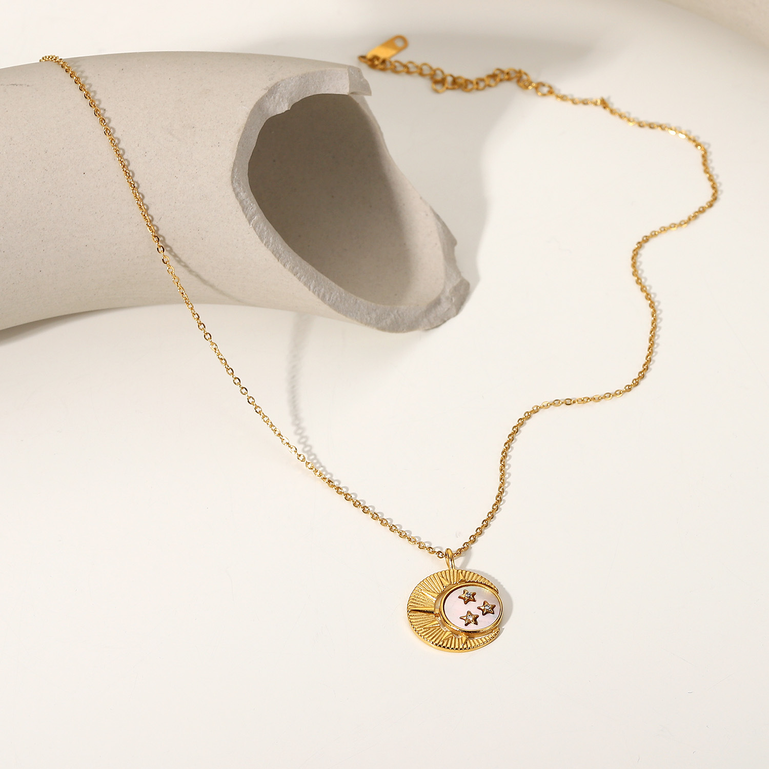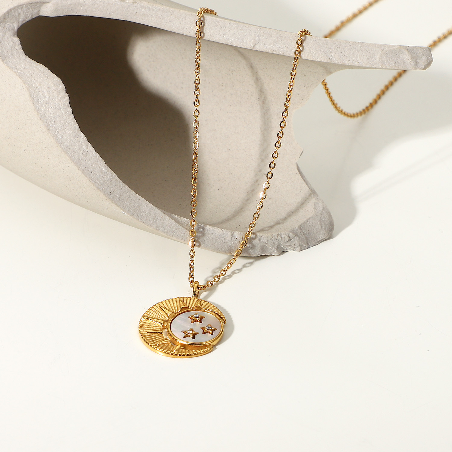 标题:18K金不锈钢白贝镶嵌星星月亮太阳吊坠项链时尚INS风镶锆石项饰女