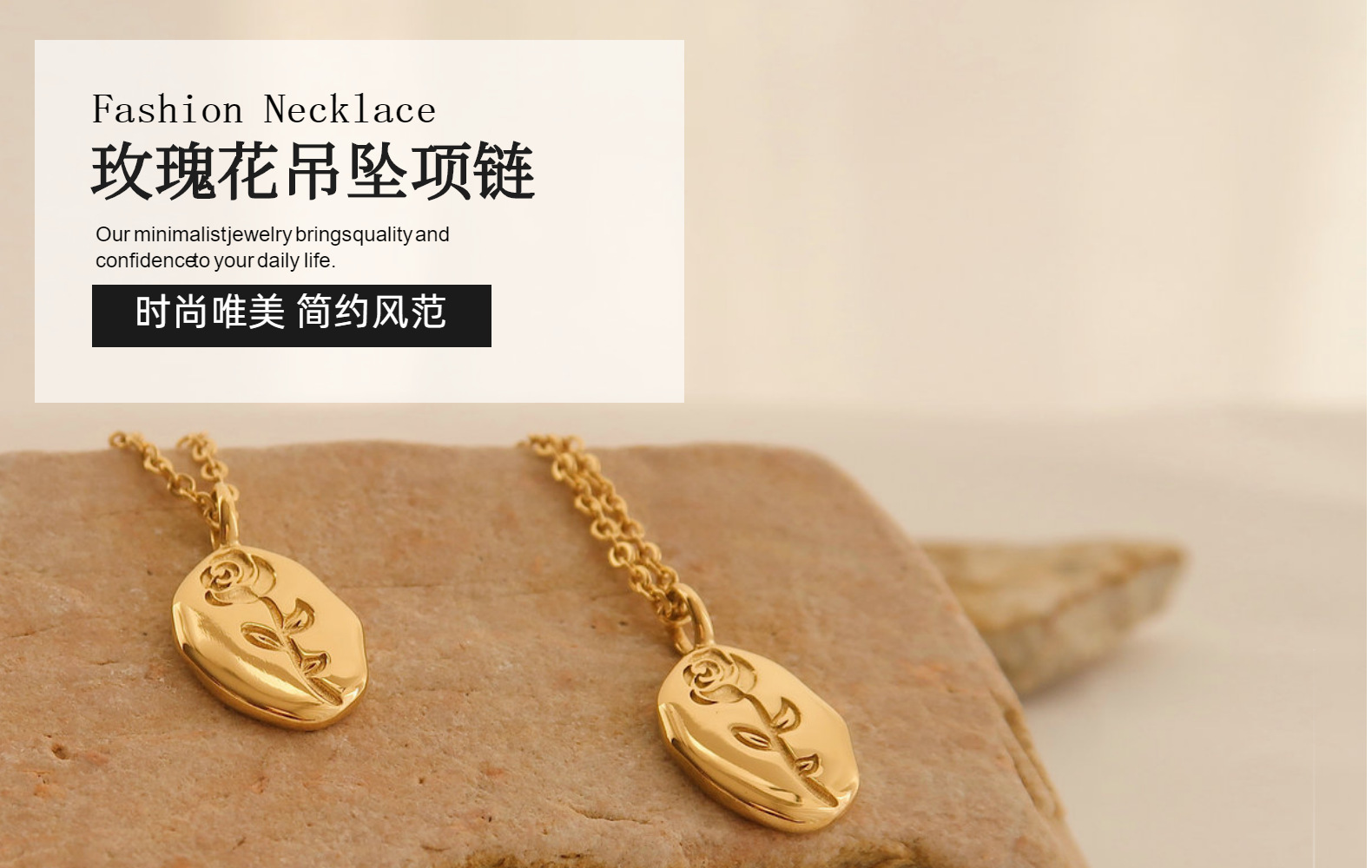 标题:时尚钛钢玫瑰花朵项链18K金电镀316不锈钢椭圆形吊坠项链嘻哈饰品