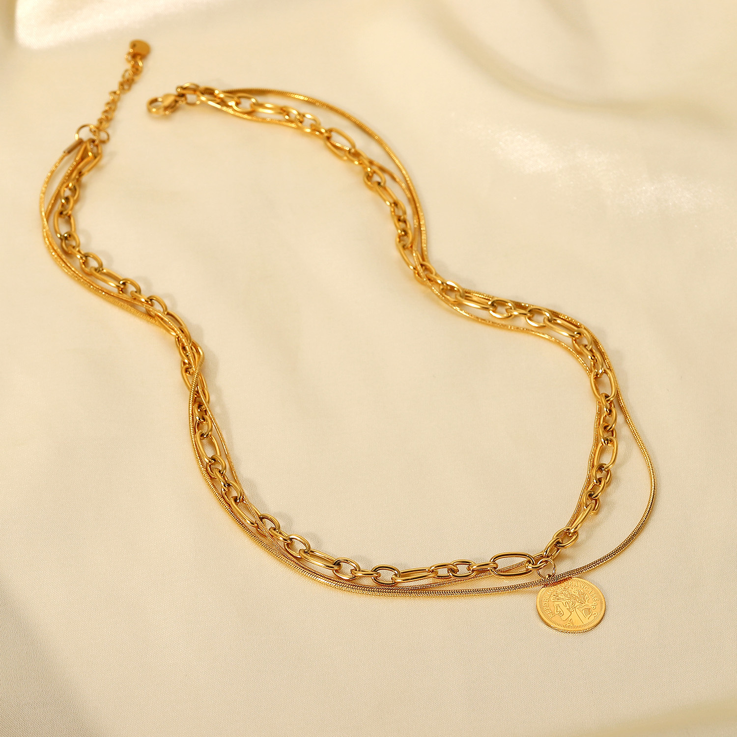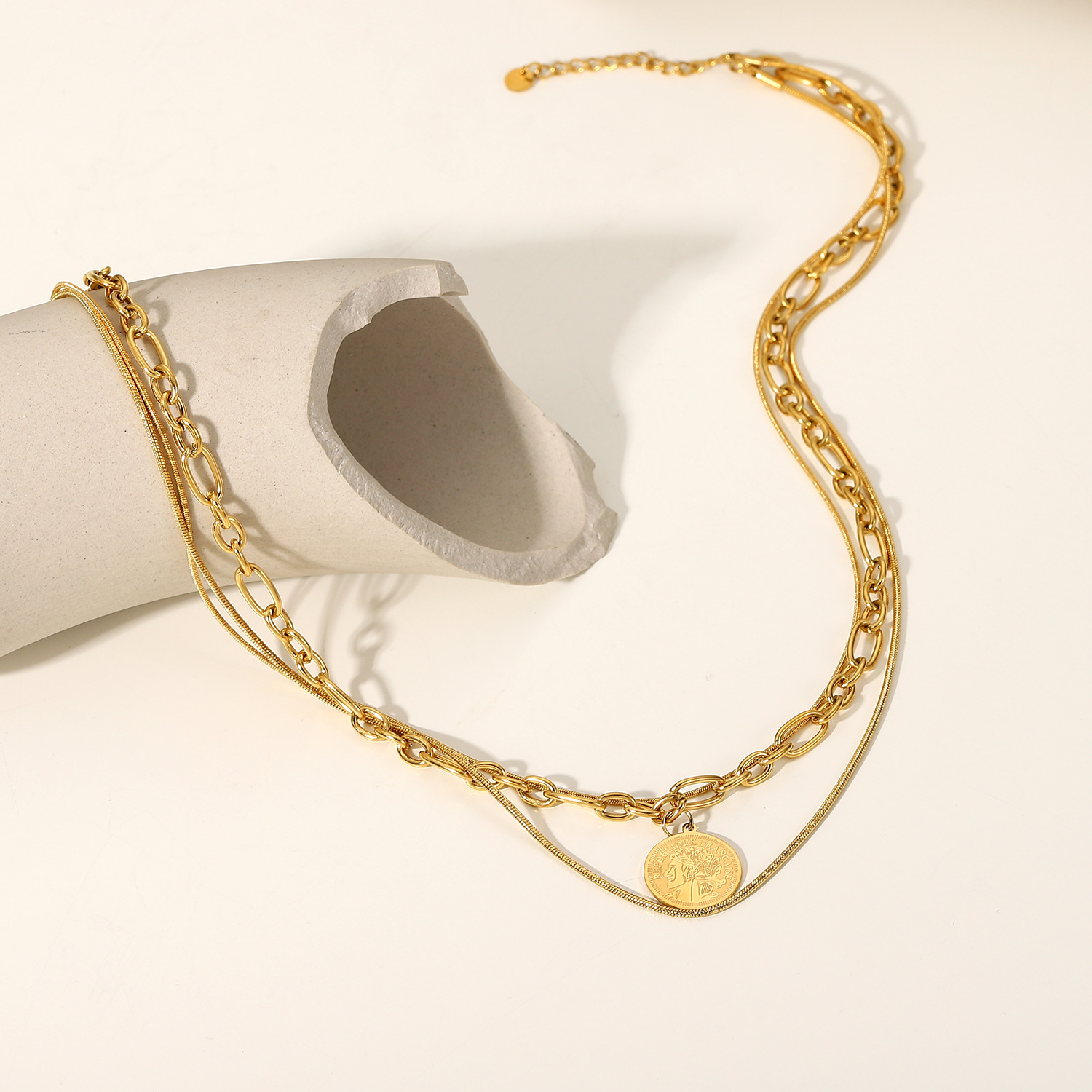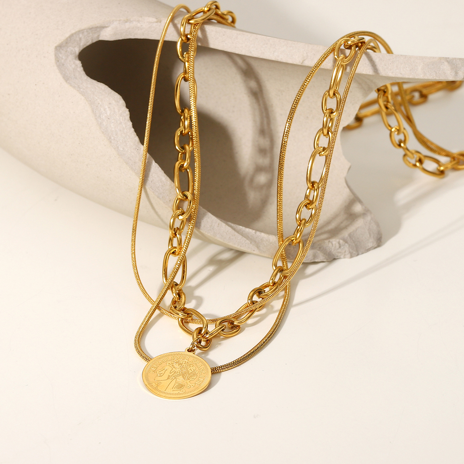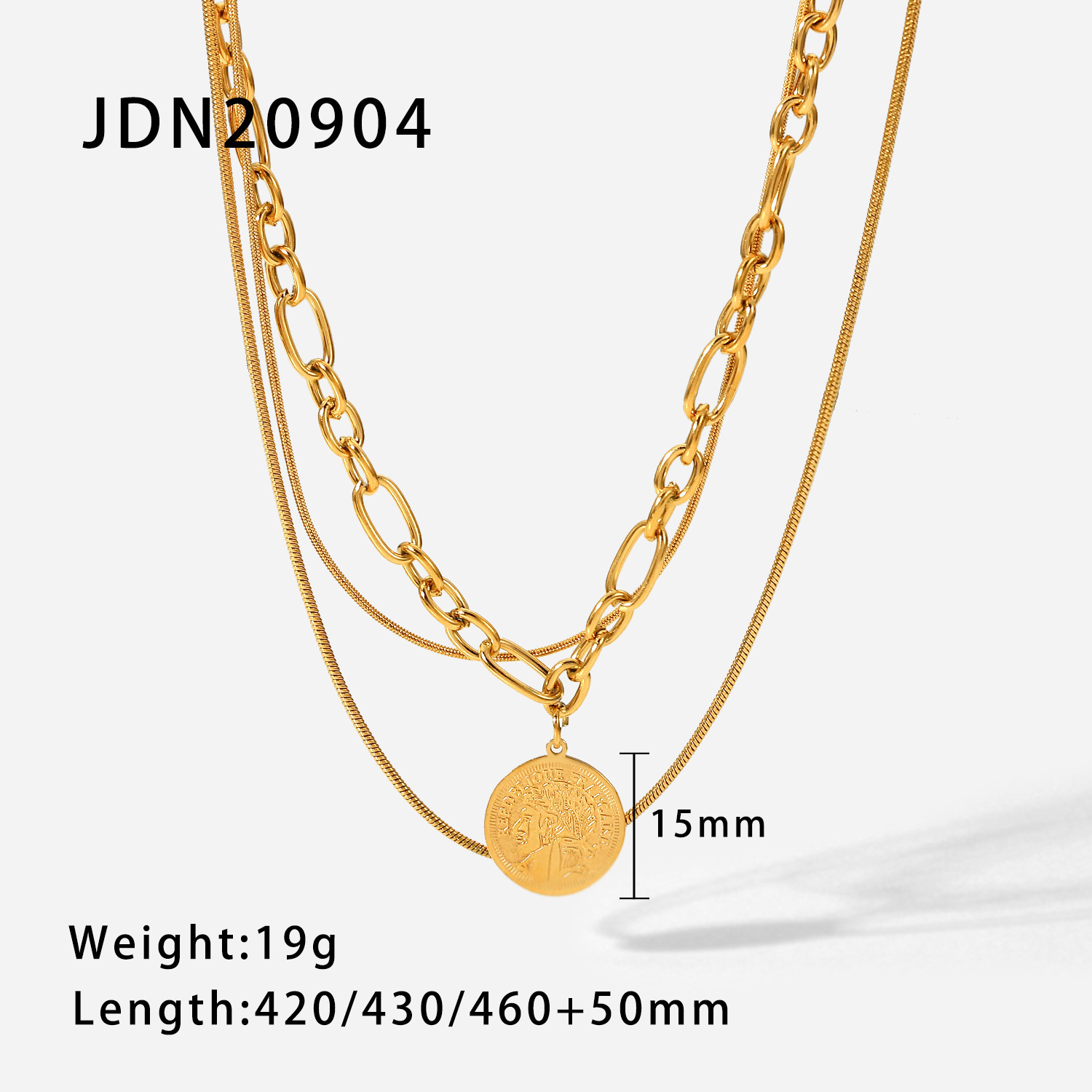 描述:风格:欧美,材质:不锈钢,处理工艺:电镀,品牌:Youthway,生产编号:JDN20904,销售序列号:JDN20904,种类:项链,样式:男女通用,造型:几何型,包装:独立包装,适用送礼场合:婚庆,旅游纪念,员工福利,加工定制:是,货号:JDN20904,产地:浙江义乌,链子样式:常规链,是否多层:是,是否带坠:是,延长链:10cm以下,坠子材质:不锈钢,周长:21cm(含)-50cm(含),系列:不锈钢,形象:三层项链,主要下游平台:淘宝,京东,ebay,PDD,亚马逊,wish,快手,LINIO,SHEIN,速卖通,天猫,独立站,LAZADA,拼多多,shopee,抖音,垂类电商,颜色:JDN20904,主要销售地区:非洲,欧洲,南美,东南亚,北美,东北亚,中东,有可授权的自有品牌:是,是否跨境出口专供货源:是,流行元素:金属,复古,链条,几何,立体装饰,上市年份/季节:2022年春季,