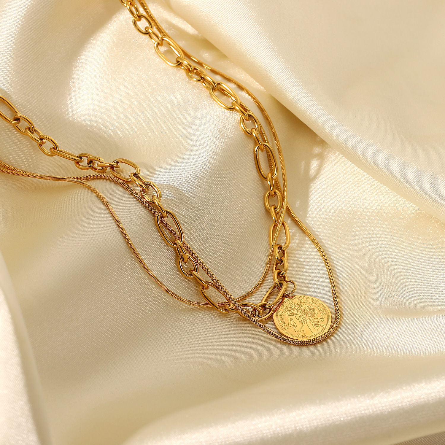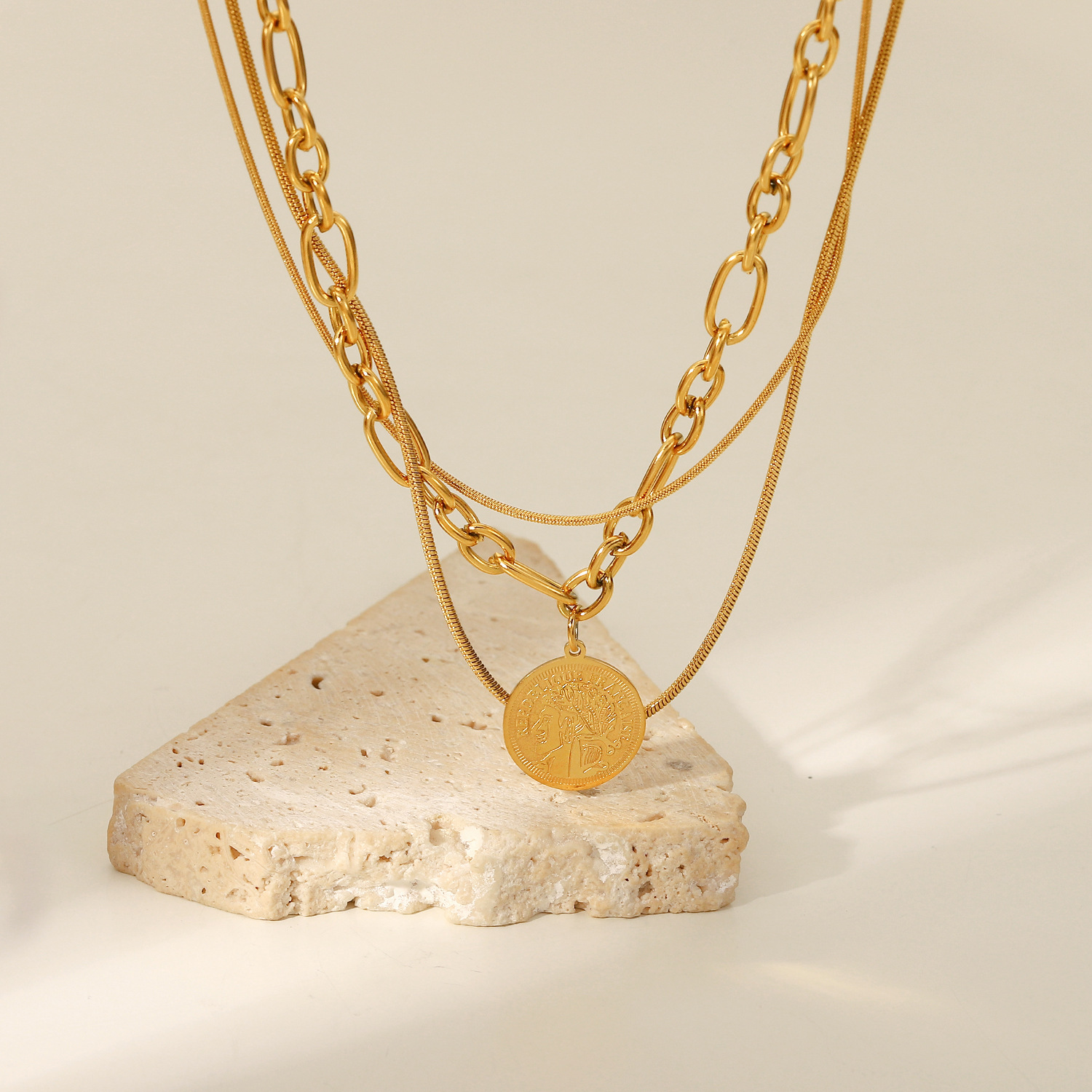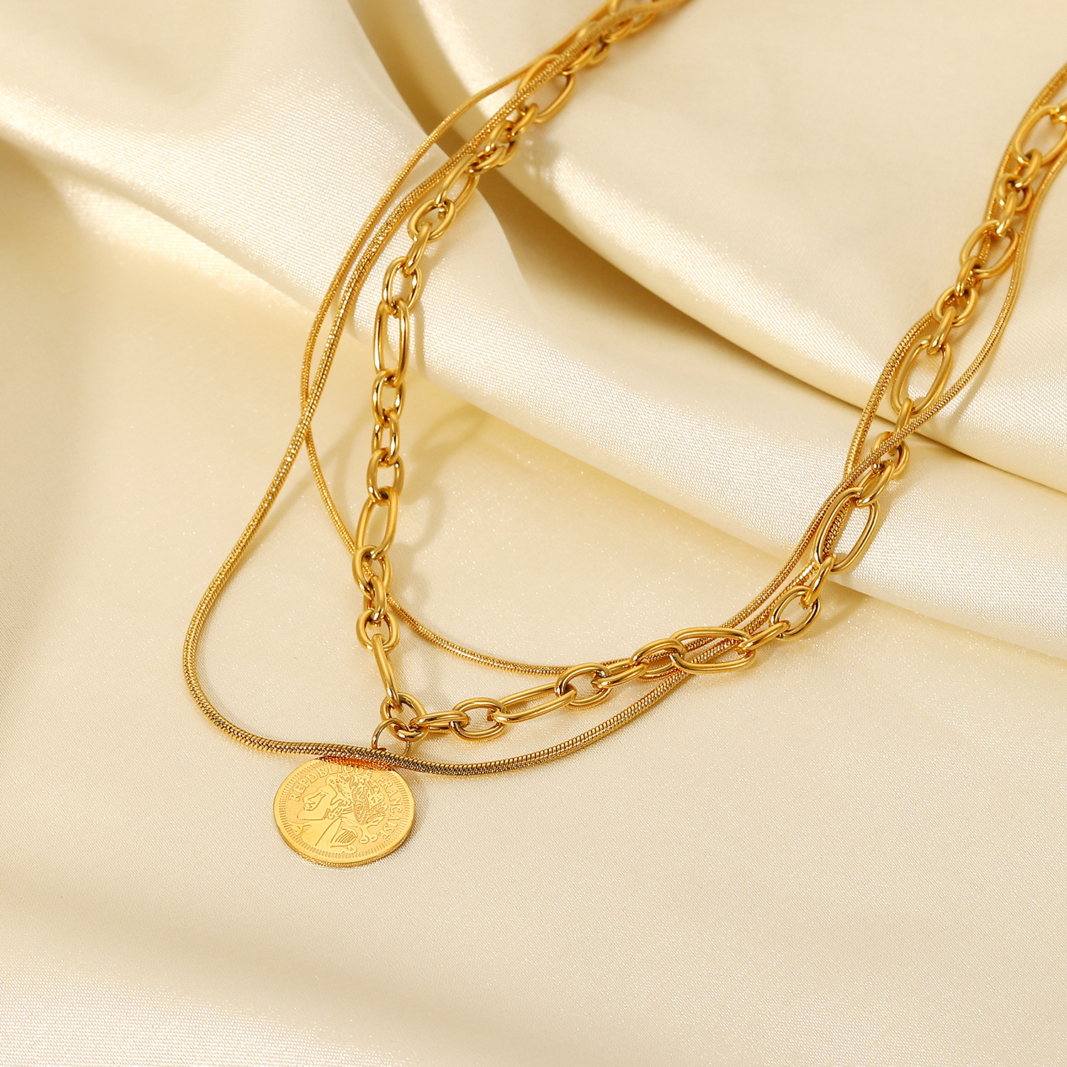 标题:欧美INS网红同款女王人脸圆牌吊坠绳链三层项链18K金不锈钢首链女