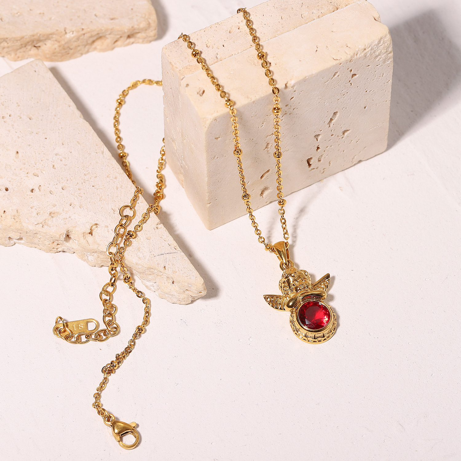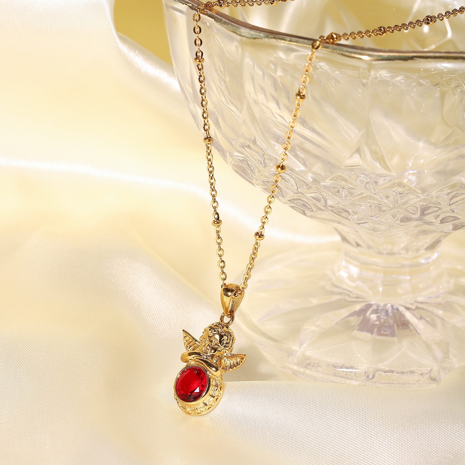标题:18K镀金天使圆形亮粉色锆石项链 不锈钢丘比特天使锆石吊坠项链女