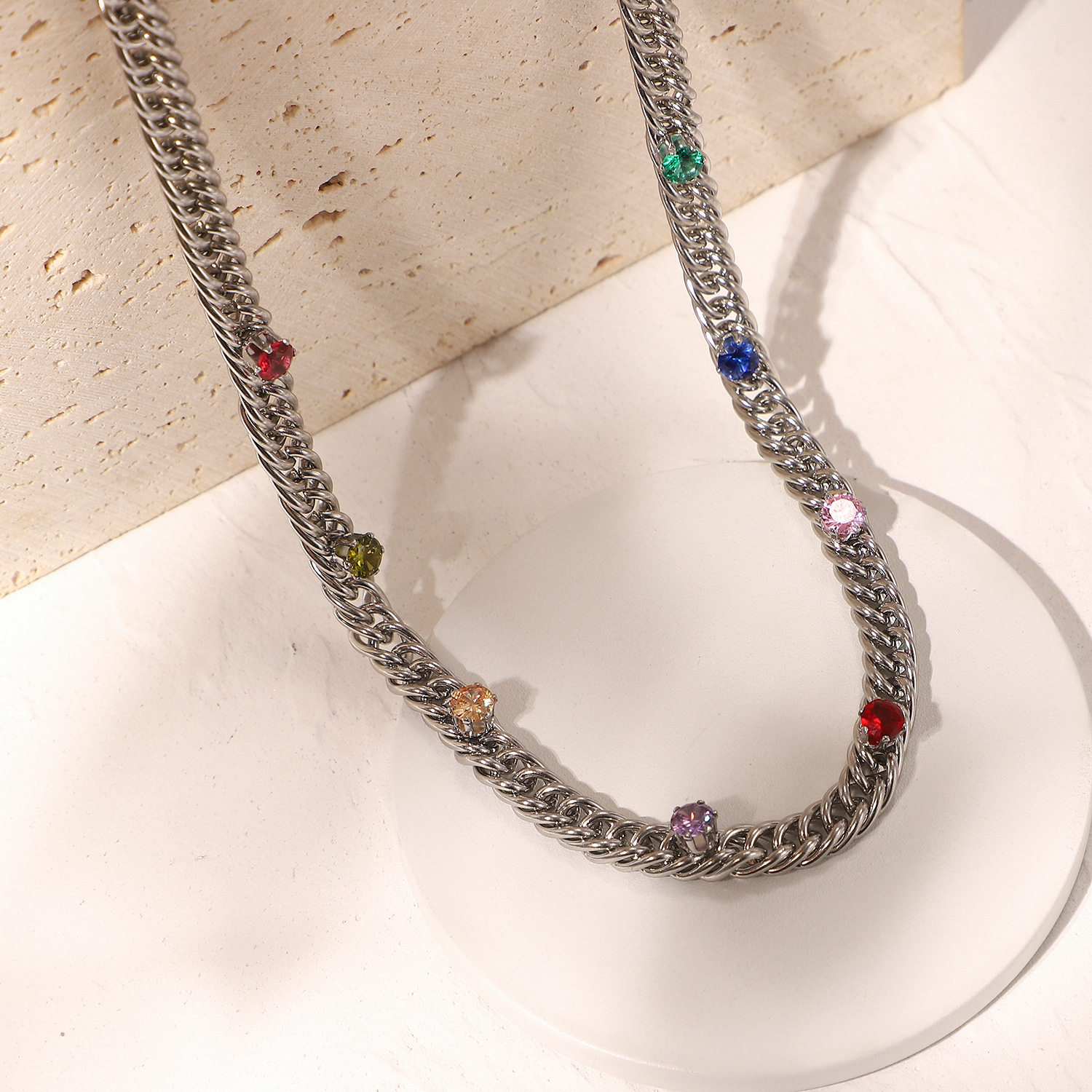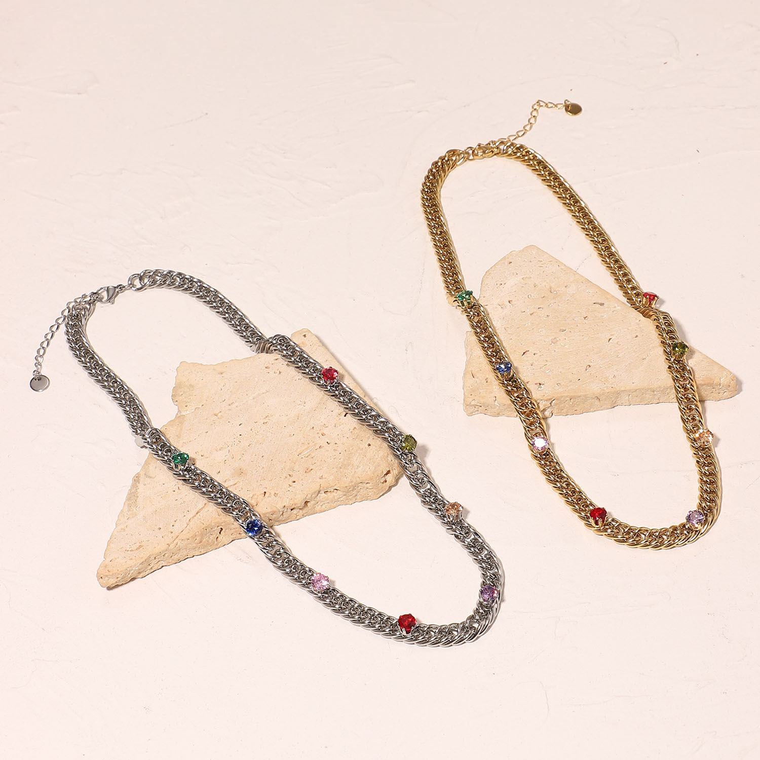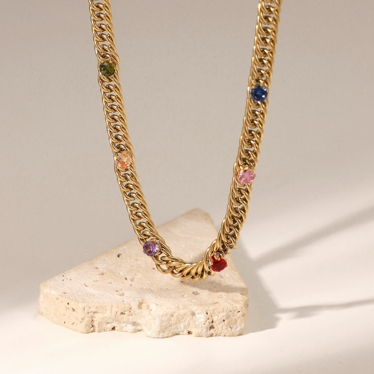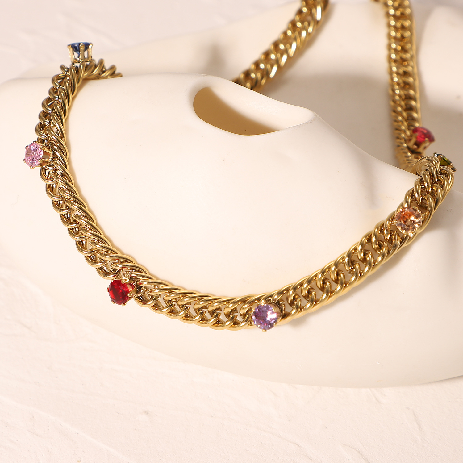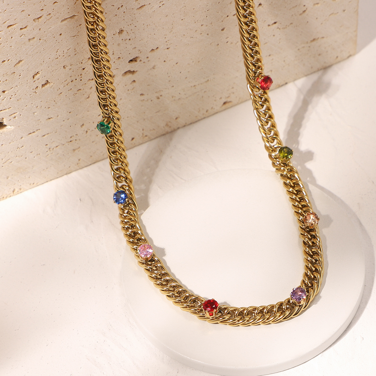 标题:欧美首饰14K镀金/钢色古巴链锆石项链礼物不锈钢彩色锆石项链女式