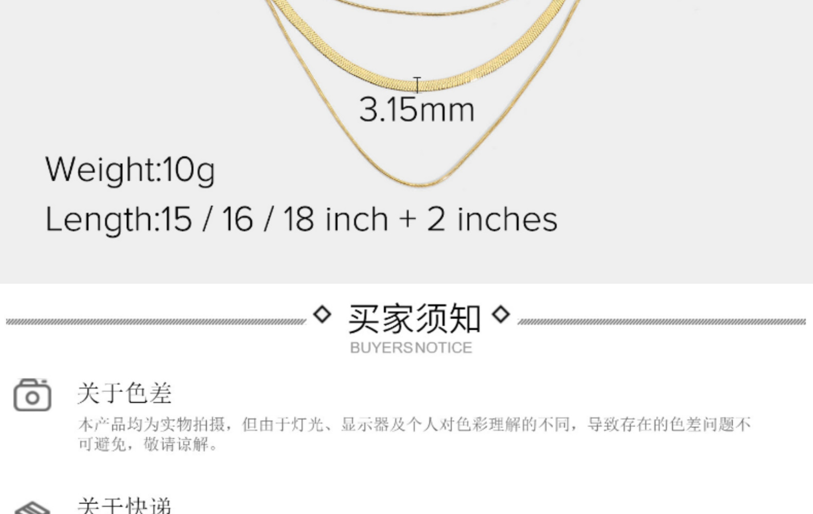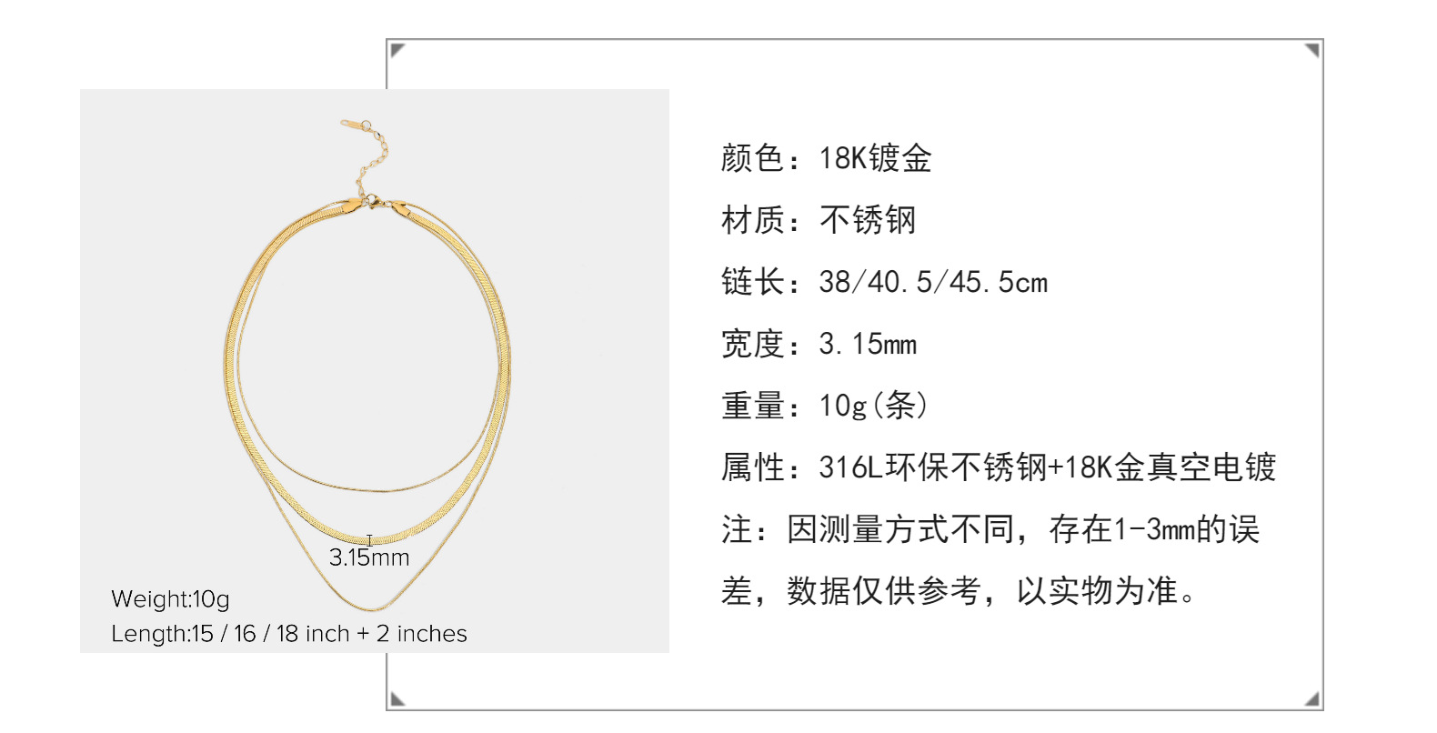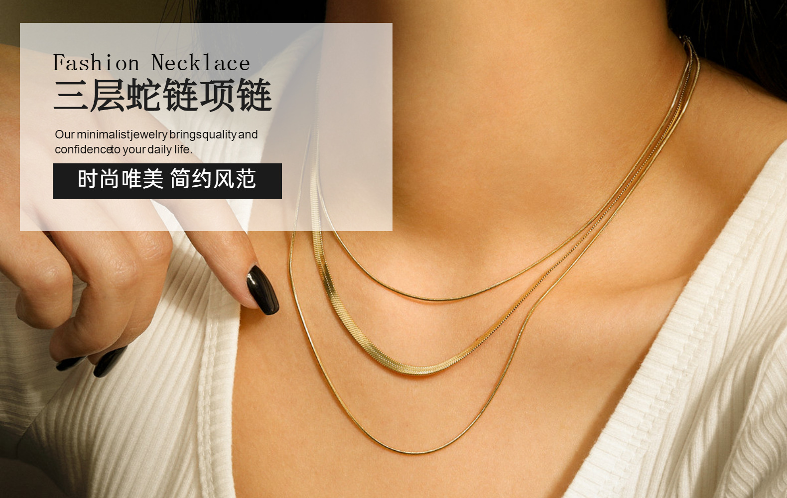 标题:欧式风格三层蛇链项链 时尚女性款堆叠首饰14K镀金不锈钢矮胖项链