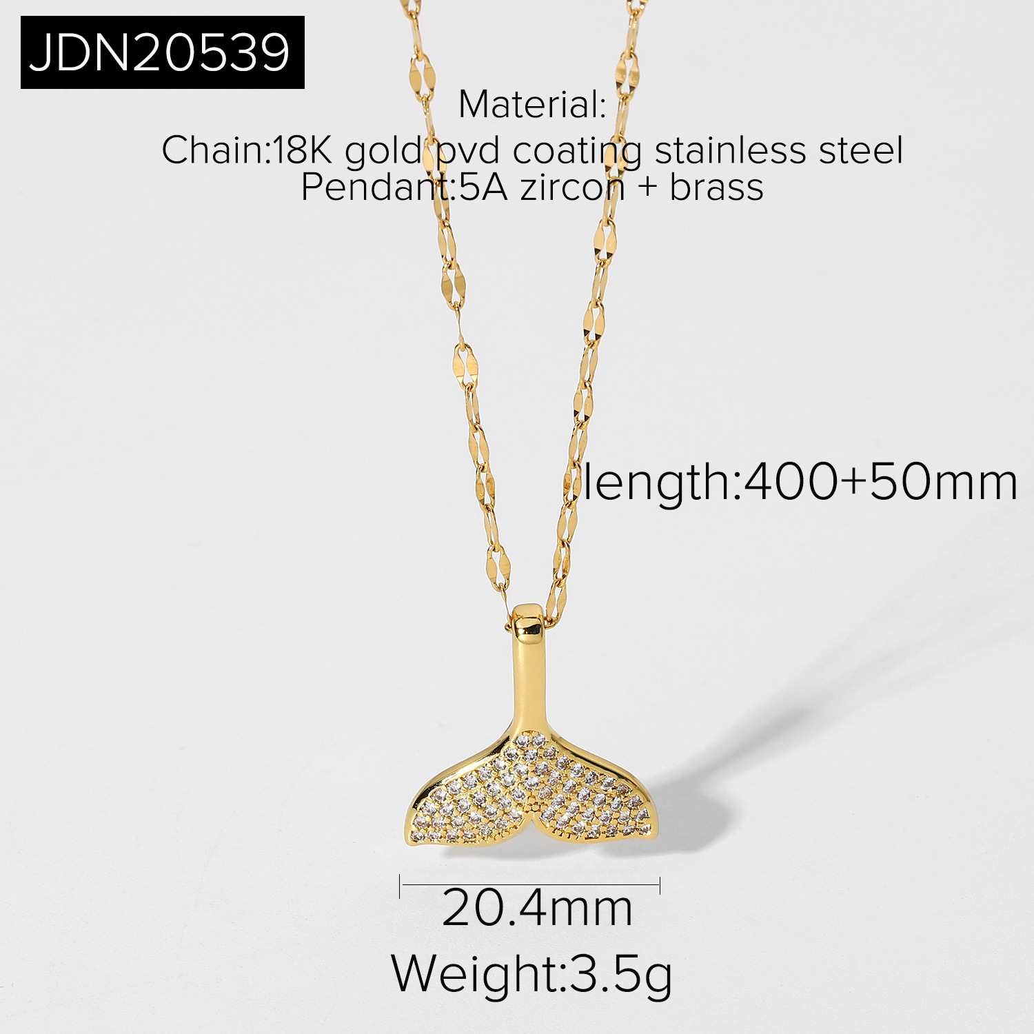 描述:风格:简约,材质:不锈钢,处理工艺:电镀,品牌:Youthway,生产编号:JDN20539,销售序列号:JDN20539,种类:项坠、吊坠,样式:女式,造型:美人鱼尾,包装:独立包装,适用送礼场合:婚庆,旅游纪念,员工福利,加工定制:是,货号:JDN20539,产地:浙江义乌,链子样式:扭片链,是否多层:是,是否带坠:是,延长链:10cm以下,坠子材质:钛钢,周长:21cm(含)-50cm(含),系列:吊坠项链,形象:美人鱼尾,主要下游平台:ebay,亚马逊,wish,速卖通,独立站,LAZADA,颜色:JDN20539,主要销售地区:非洲,欧洲,南美,东南亚,北美,东北亚,中东,有可授权的自有品牌:是,是否跨境出口专供货源:是,流行元素:金属,链条,几何,上市年份/季节:2021年春季,