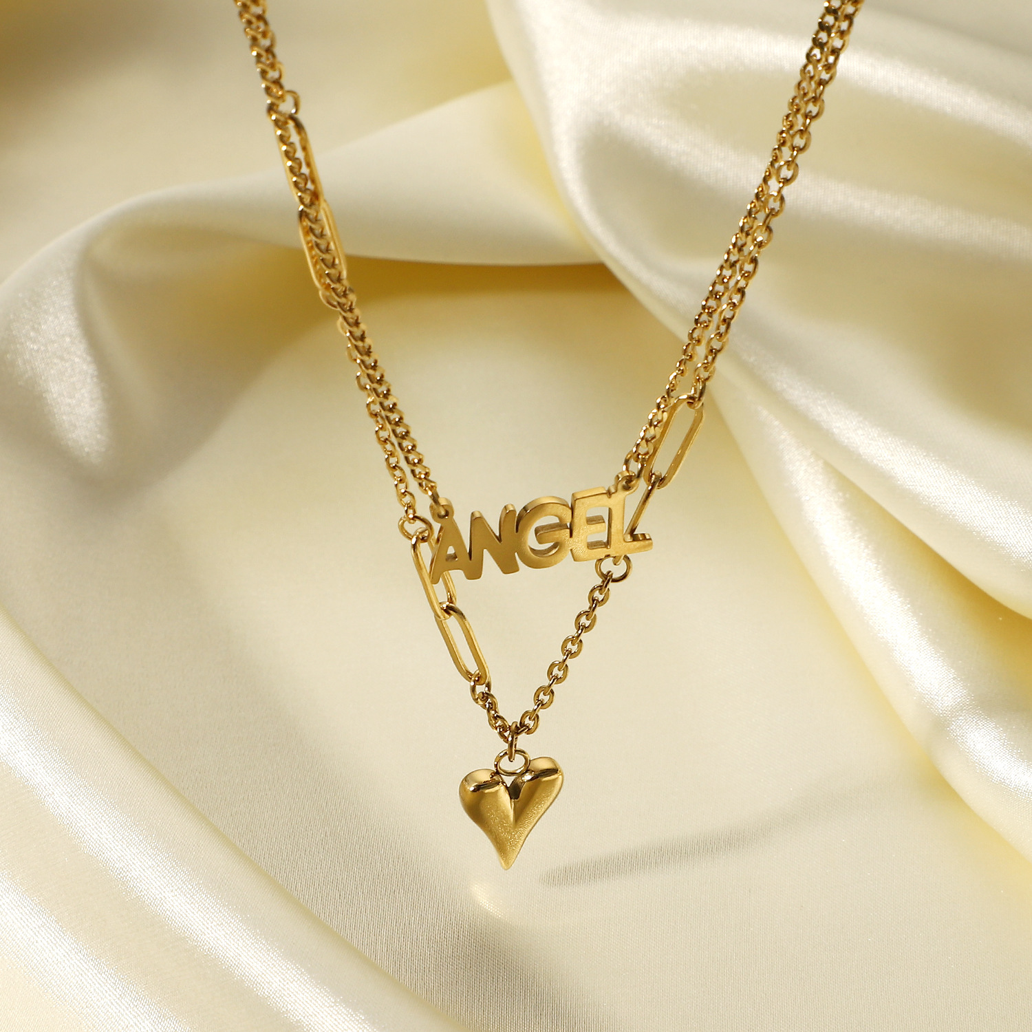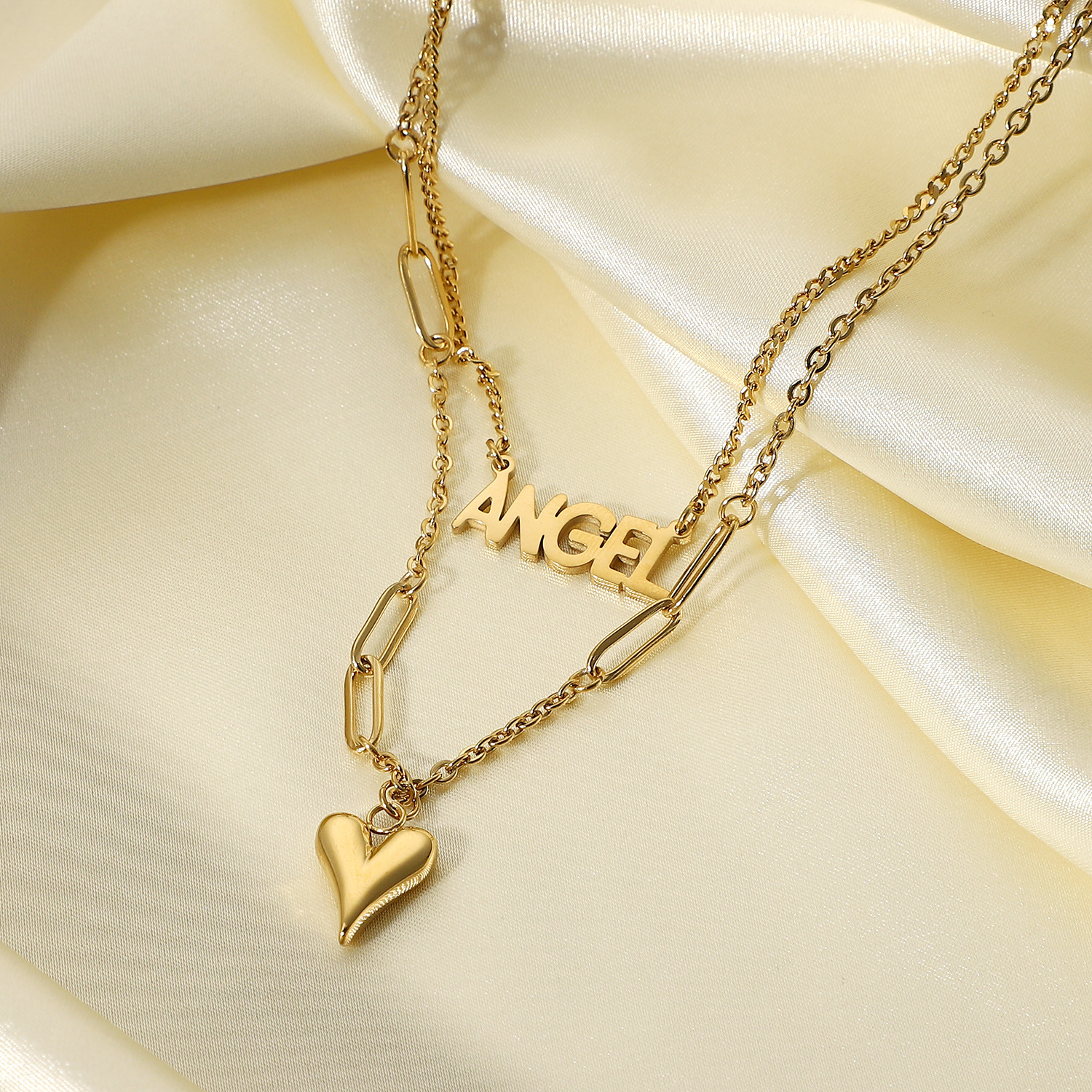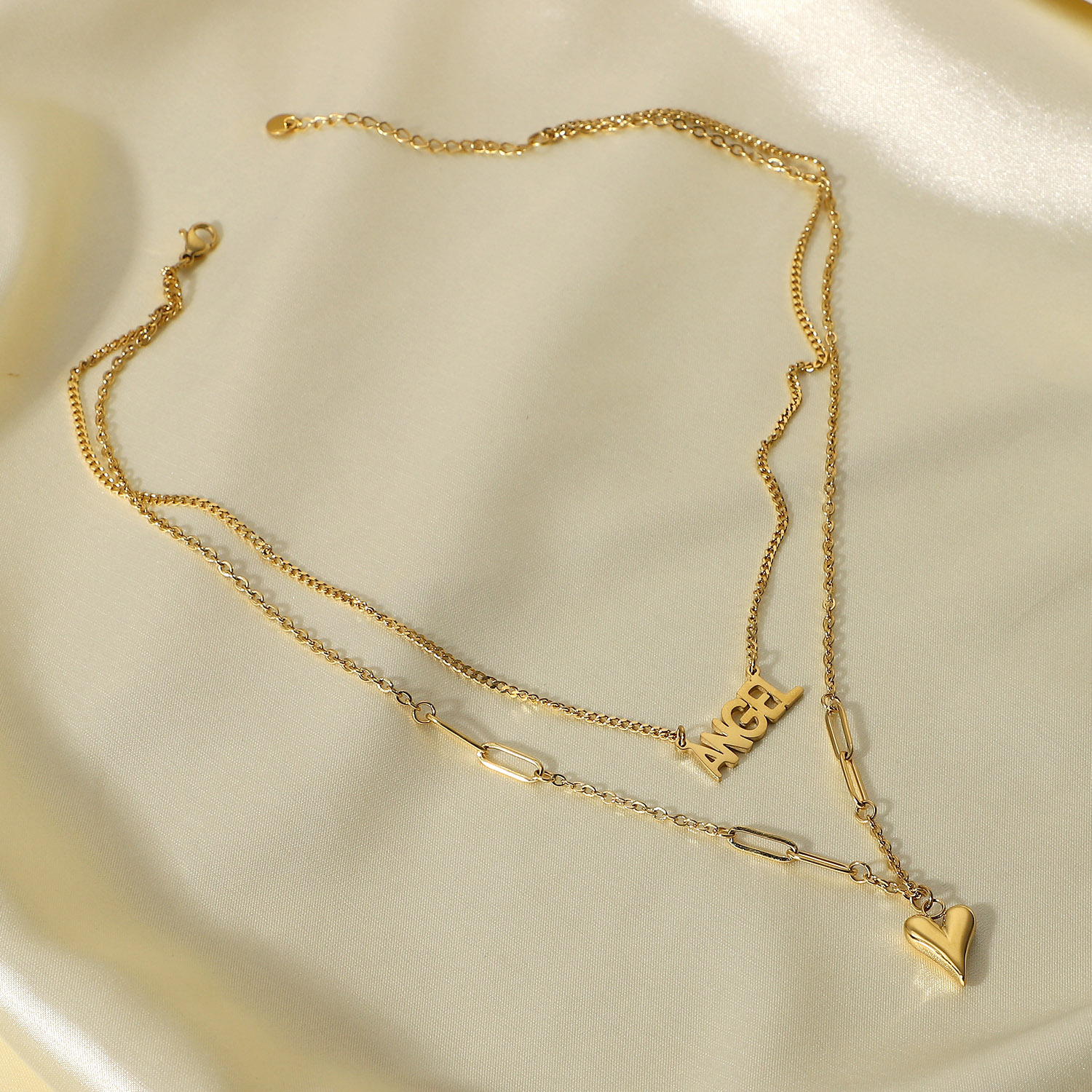 标题:欧美INS钛钢项链 14K金ANGEL细长立体爱心吊坠双层项链脖颈链饰品
