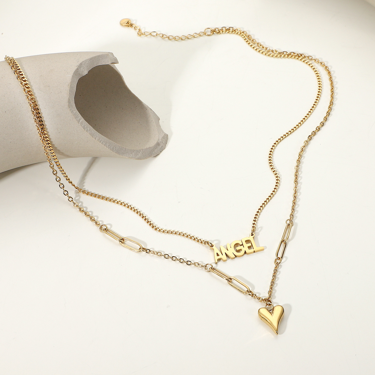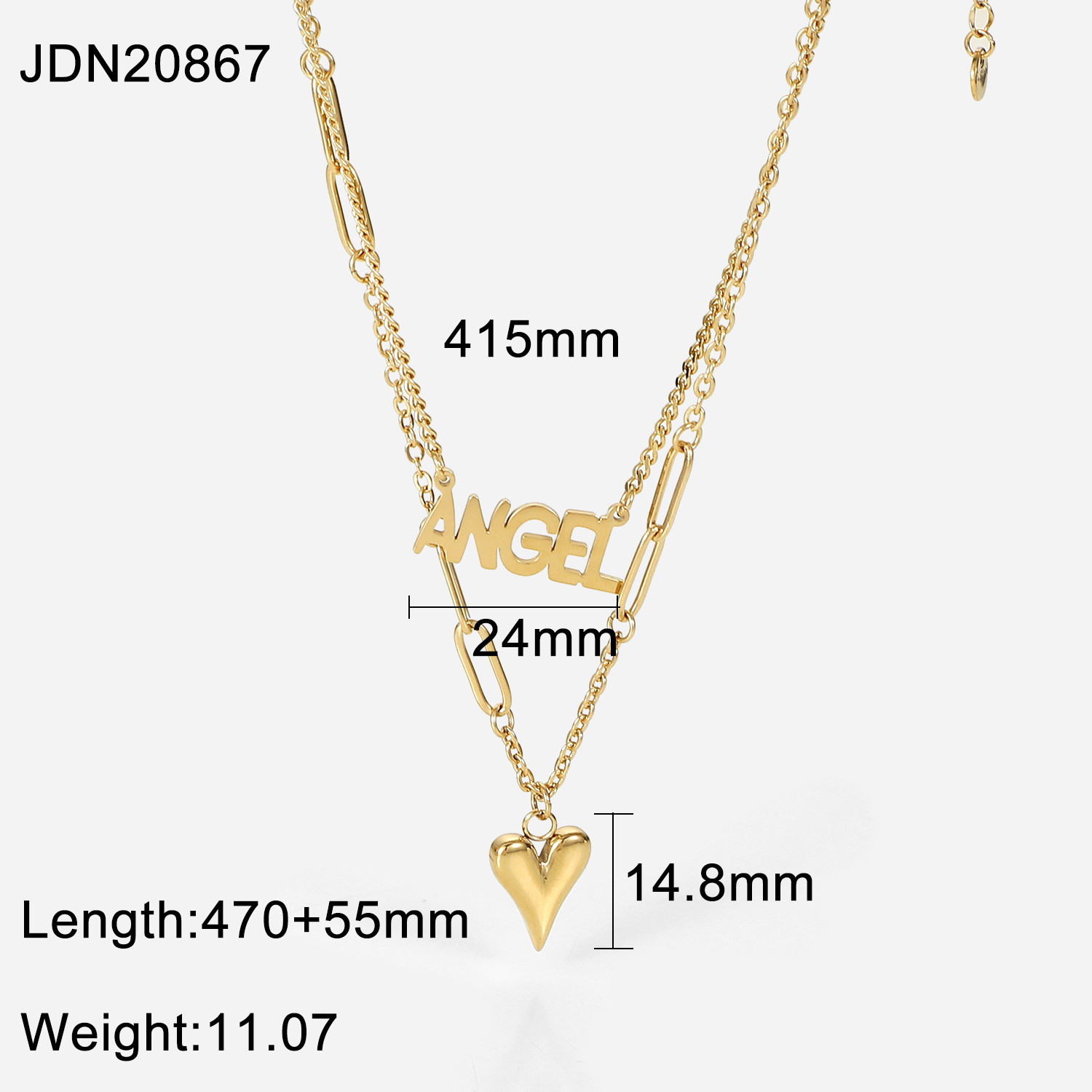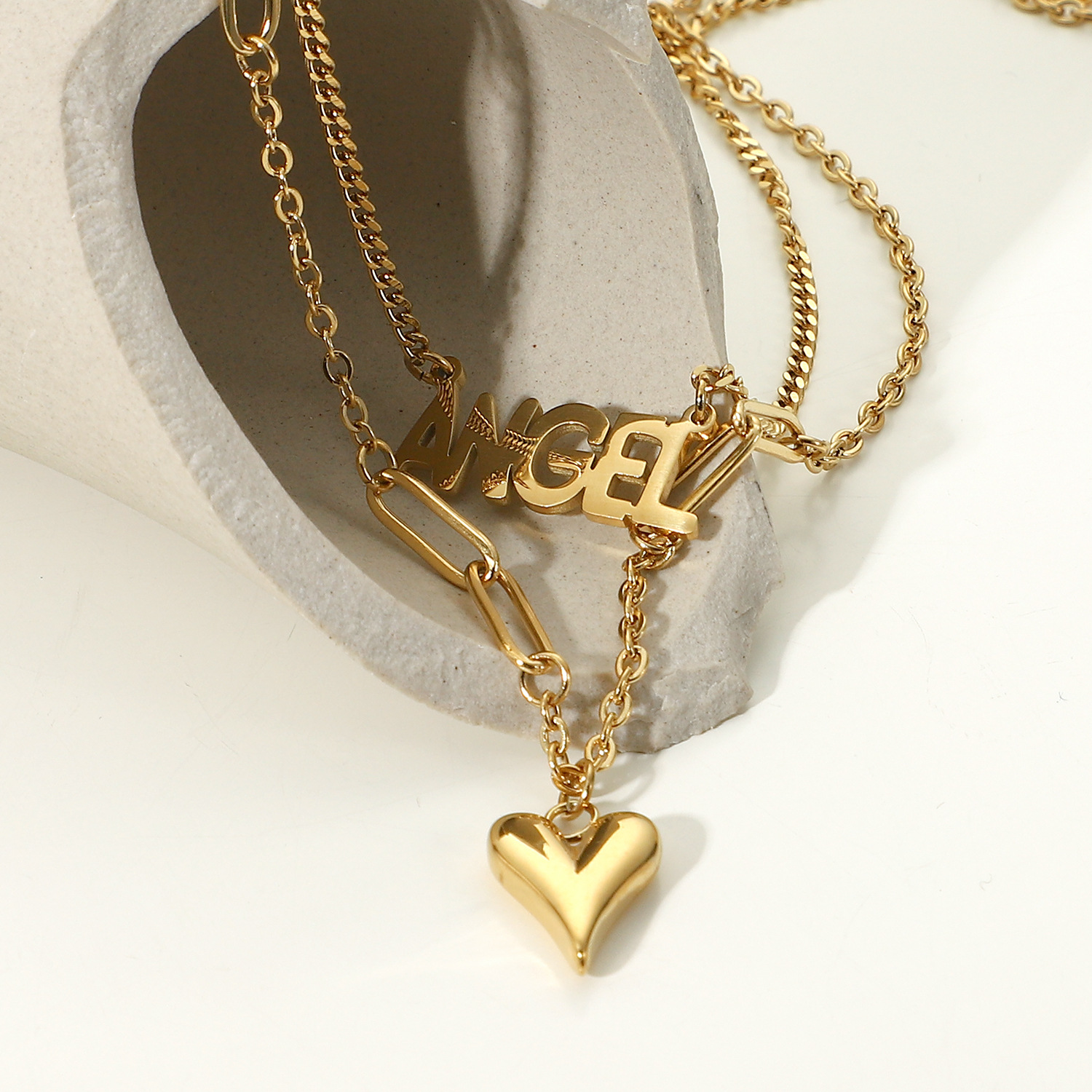 标题:欧美INS钛钢项链 14K金ANGEL细长立体爱心吊坠双层项链脖颈链饰品